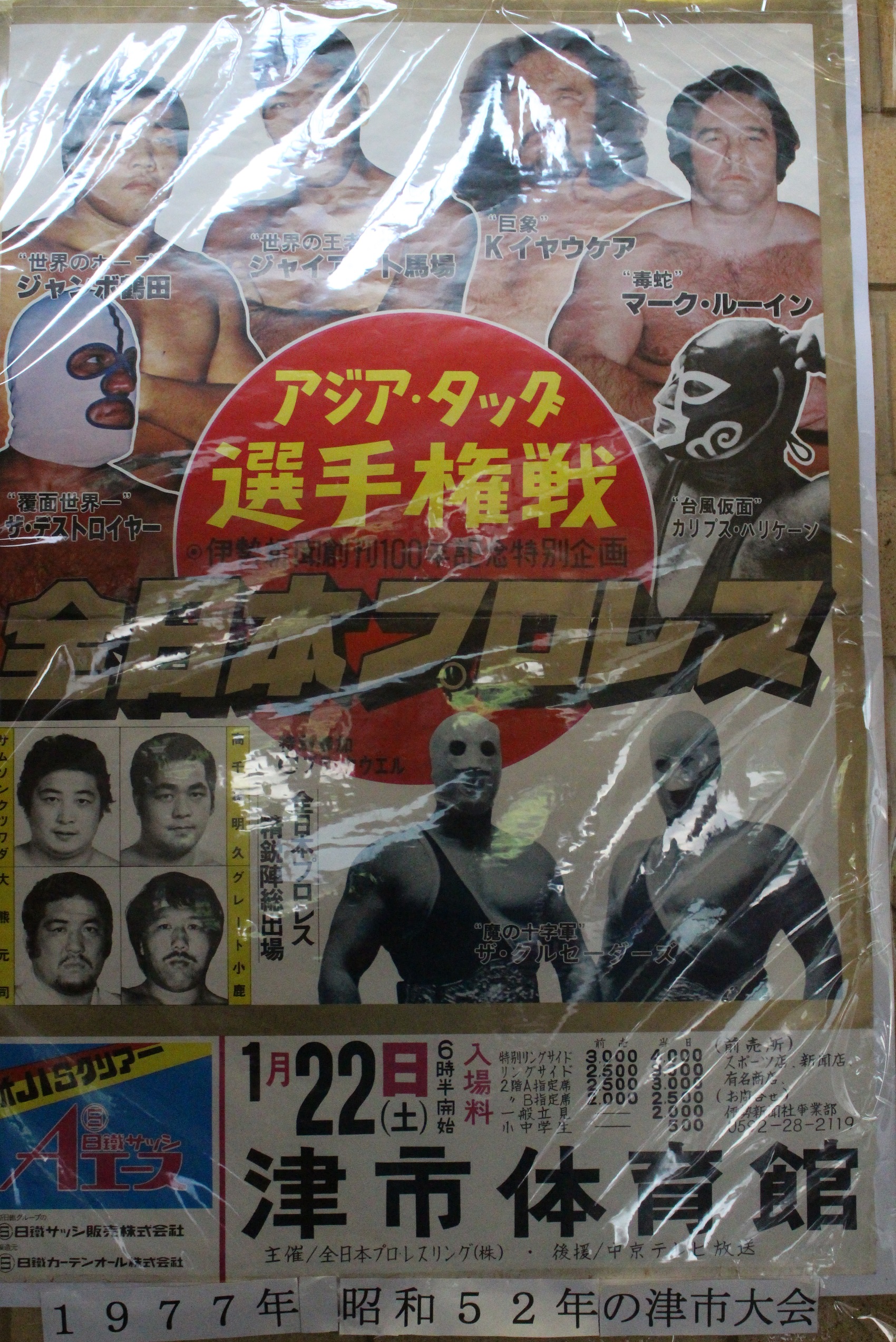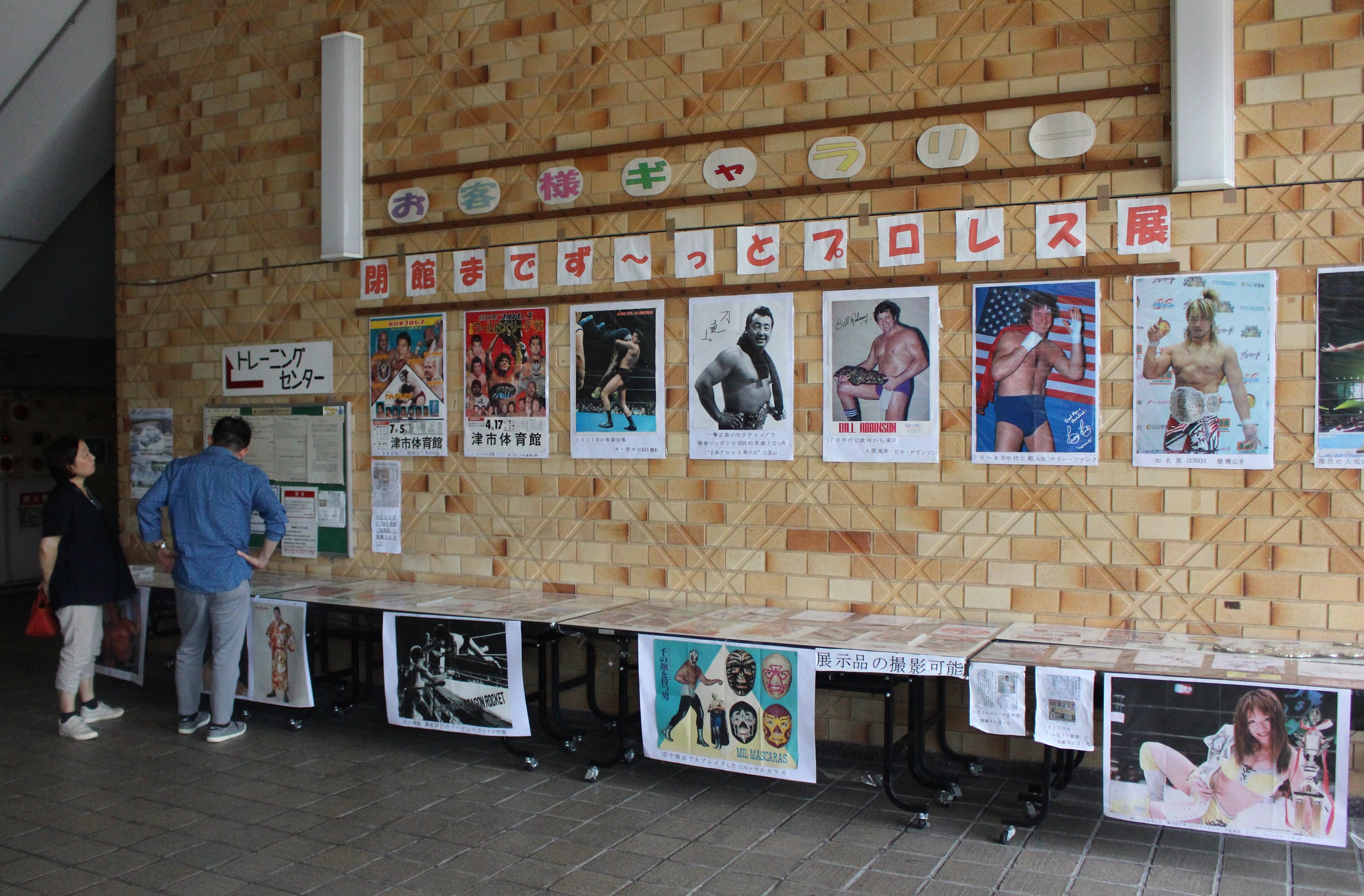 館内は卓球大会が開かれており、学生達が多かったが、入口フロア右側に三重県のプロレスマニア・真柄力也さんが「閉館までず~っとプロレス展」の展示物が公開されていた。