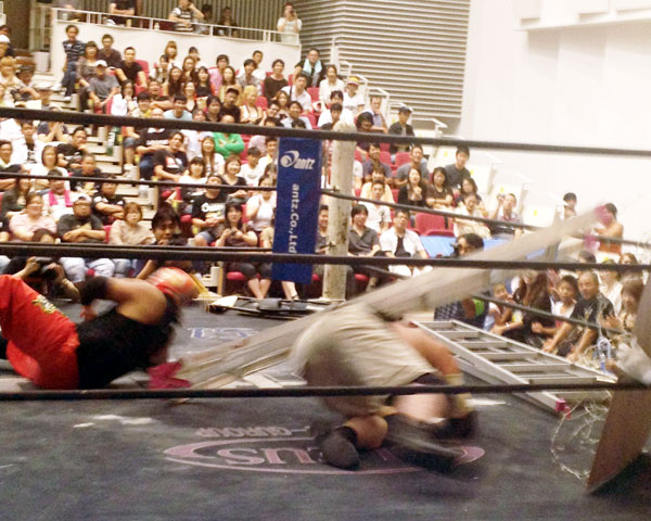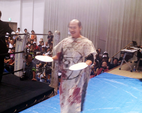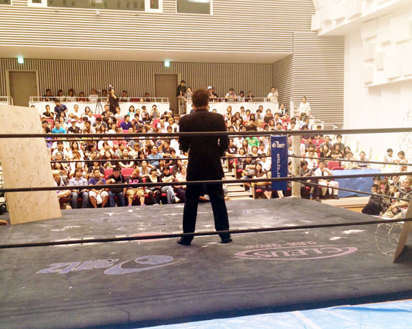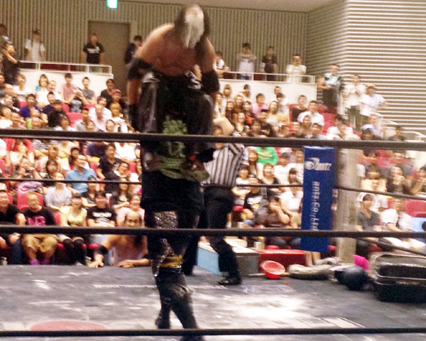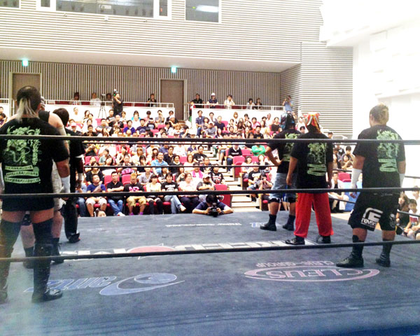 そして開場時間近くになるとたくさんの人が集まりだし、開場となってしばらくすると立見も出るほどの超満員札止め、葛西プロデュース興行は大阪で初というこというせいもあるのか、よく入っていた。また自分の座る席はなんとステージ上、リングと同じ高さでプロレスを見るなんて初めてで、また全試合デスマッチであることから、ある意味デンジャラスゾーンだなと思った。
