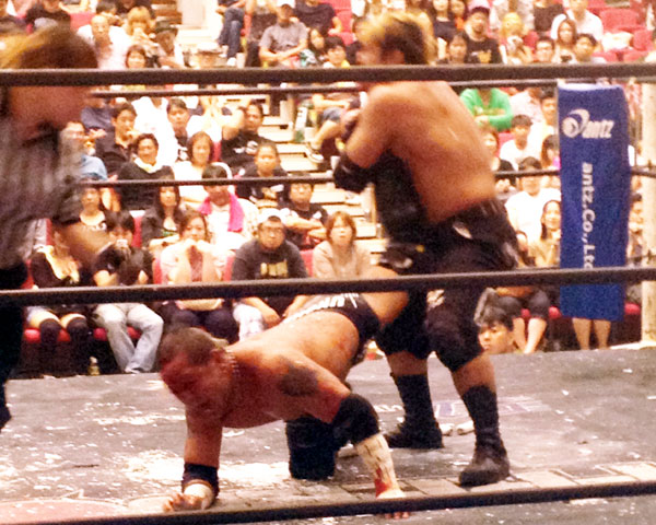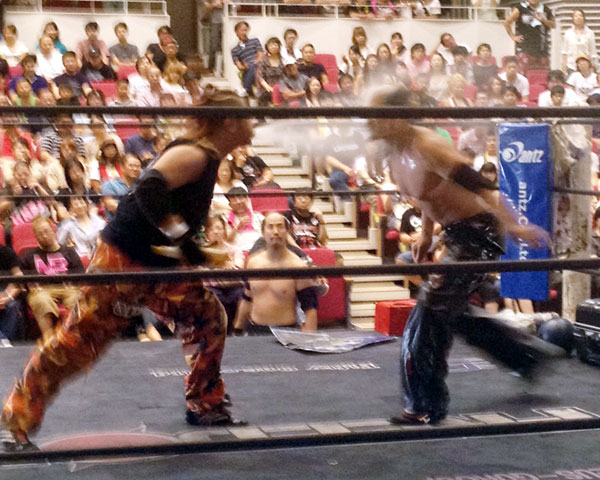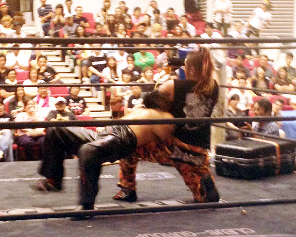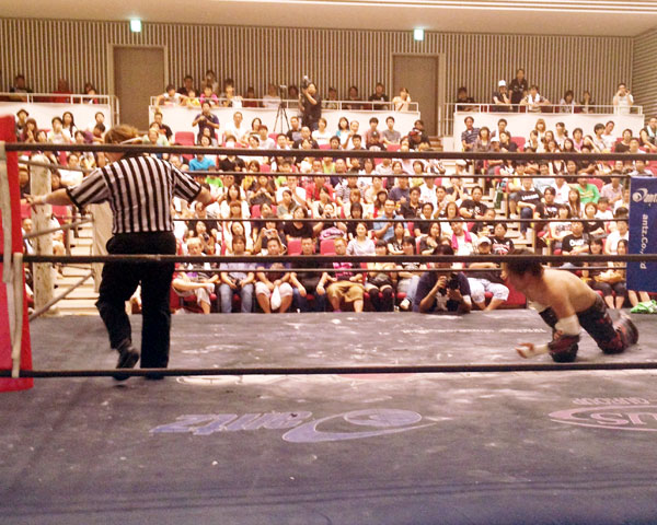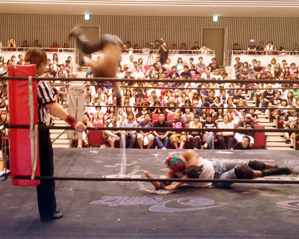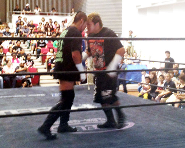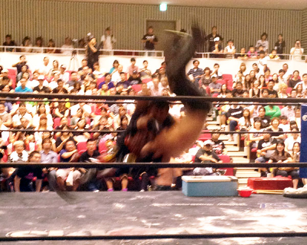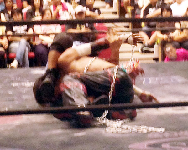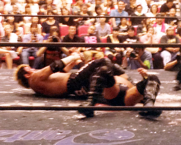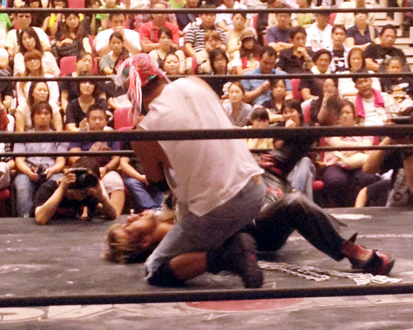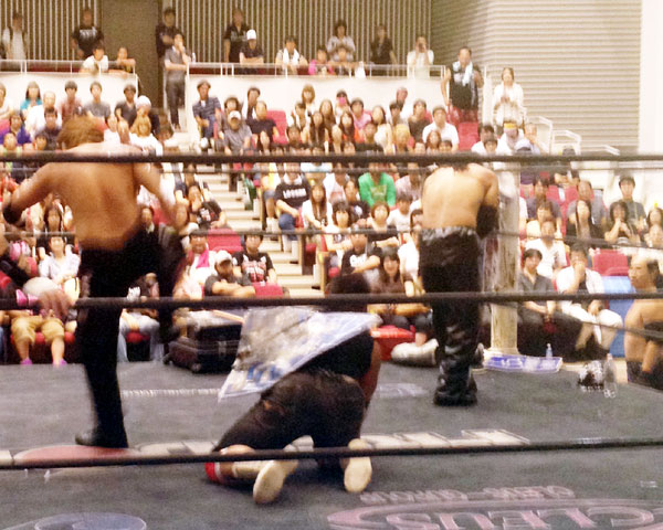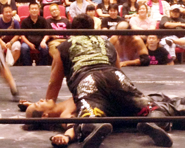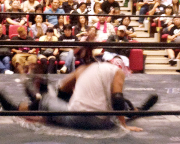 しかし先手を奪ったのは竹田、アンクルホールドで葛西の痛めている膝を攻め、葛西はハーリー・レイス式ダイビングヘッドバットで反撃も、勝負を焦ったのかリバースタイガードライバー狙いは不発となる。