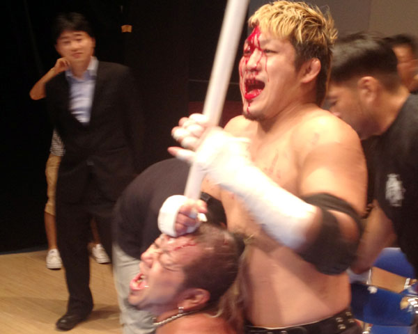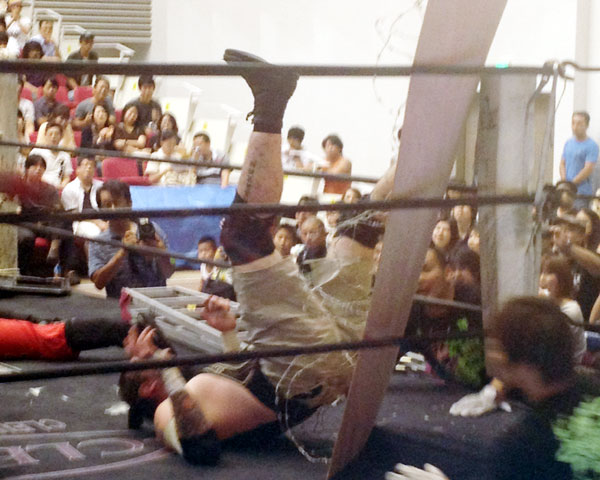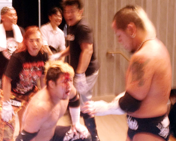 葛西は自ら割れた蛍光灯で体を切り刻むとリバースタイガードライバーからパールハーバースプラッシュwith蛍光灯束を投下も、竹田は蛍光灯束での剣山で迎撃、竹田も自ら体を切り刻んラリアットの連発からリング下からバケツを取り出し、キャンバスに画鋲をバラ撒いて、ランニングニーの連打や掟破りのリバースタイガードライバーを決め葛西を追い詰める。