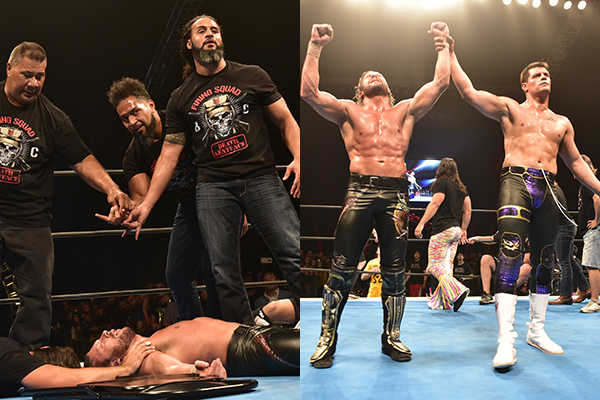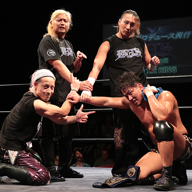 HAYATAはムーンサルトプレスで勝負に出るが、自爆となってしまうと、交代を受けたYO-HEYがミサイルキックを発射、ジャンピングヒールキックから、HAYATAのハンドスプリングも読んでツイスト・オブ・フェイトで仕留めようとする。