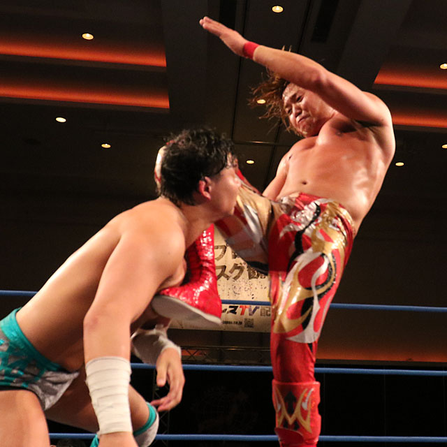 ロープに逃れた原田に杉浦がニーを狙うが、原田はカウンターのジャンピングエルボーで迎撃し、場外へ逃れた杉浦にプランチャを発射、リングに戻って再度ダイビングエルボーを投下する。