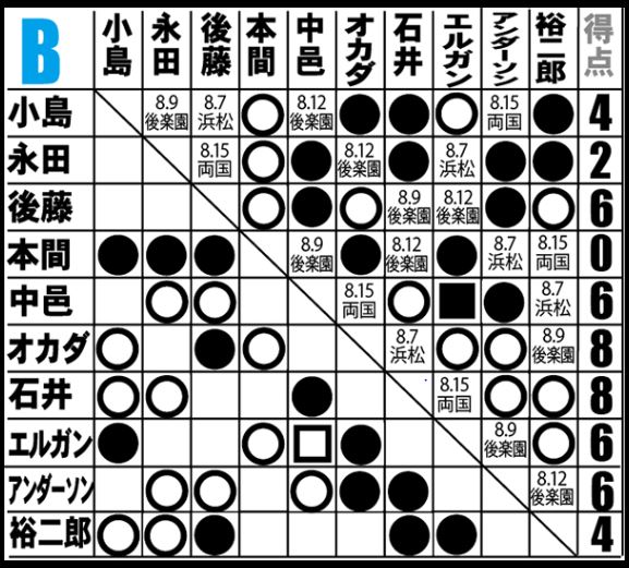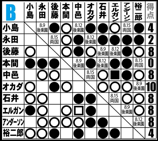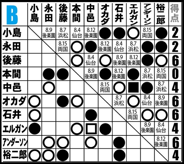 [4勝2敗=8点]○後藤洋央紀(12分39秒 片エビ固め)[2勝4敗=4点]X小島聡