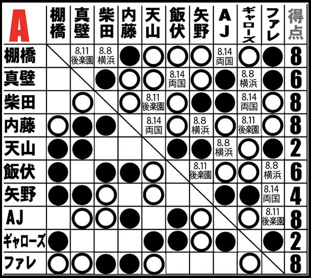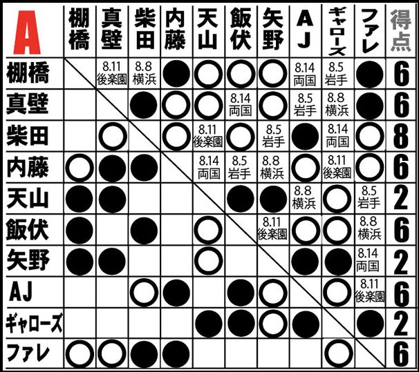 [5勝2敗=10点]○棚橋弘至(21分20秒 エビ固め)[4勝2敗=8点]×柴田勝頼