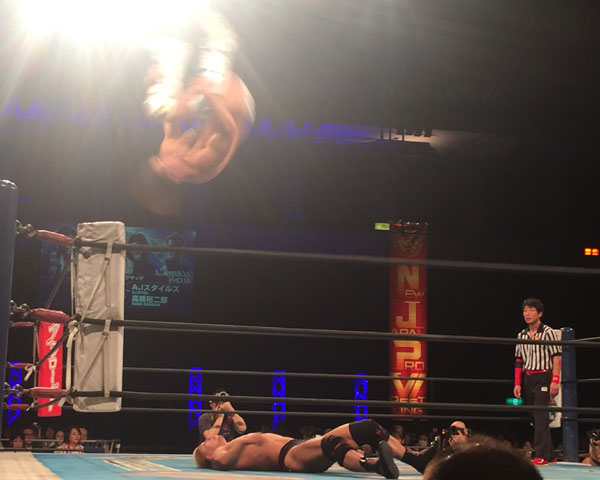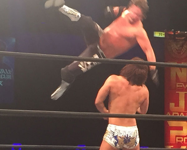 凌いだKAIはトラースキック、延髄斬り、ラリアットと畳みかけ、サンダーファイヤーパワーボムからのスプラッシュプランチャはカウント2、武藤は奥の手のフランケンシュタイナーからの腕十字の連続技へと持ち込むがKAIはロープに逃れるも、武藤はすかさずシャイニングウィザードを放ちKAIはブロックするが腕を押さえてうずくまる。
