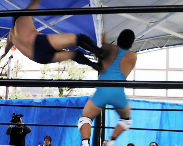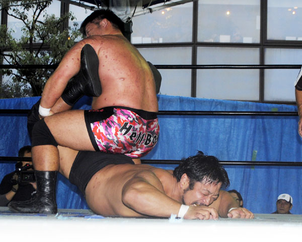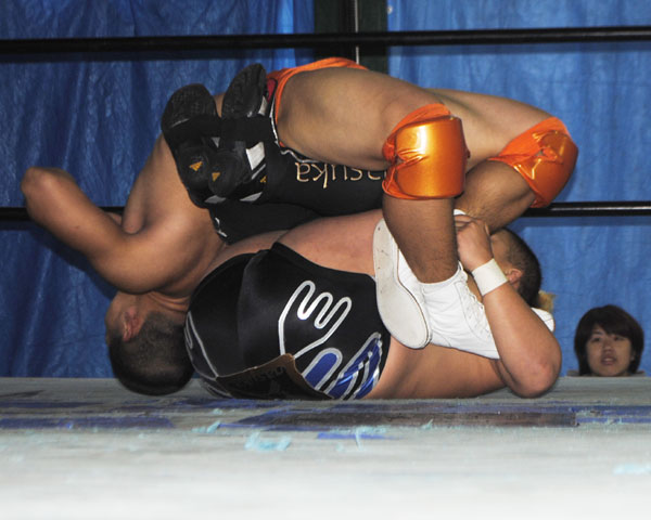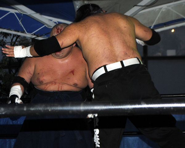 中嶋はカニ挟みで森嶋を転がすと、ターンバックルごと森嶋の顎を蹴り上げ、バックドロップで叩きつけるが垂直落下式ブレーンバスターとジャーマン狙いは投げることが出来ず、勝負と見た森嶋はラリアットからバックドロップを狙う。