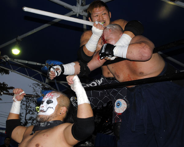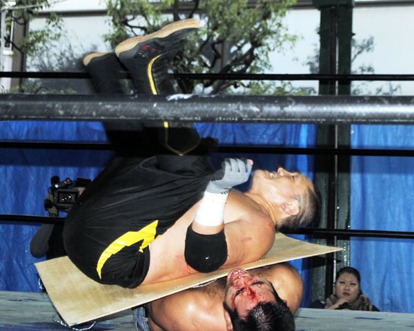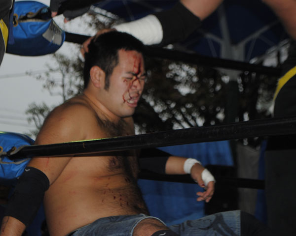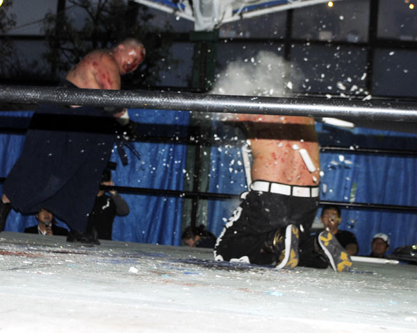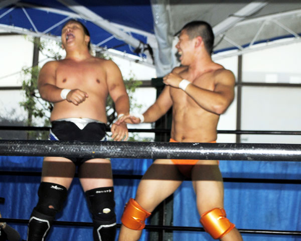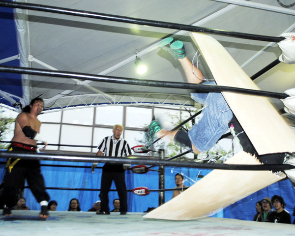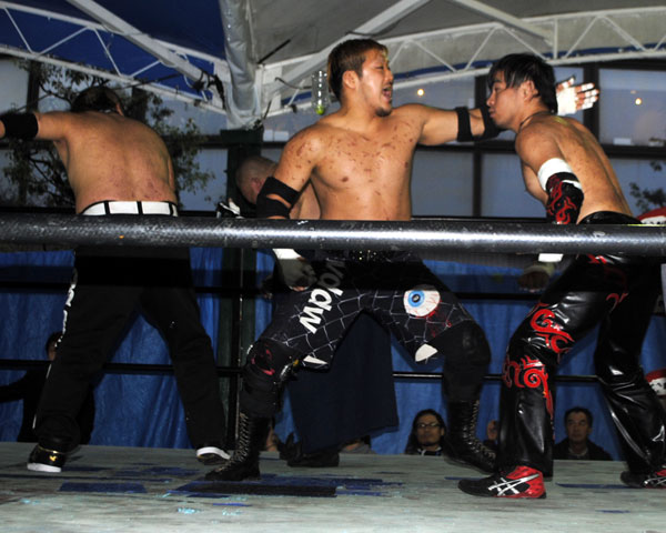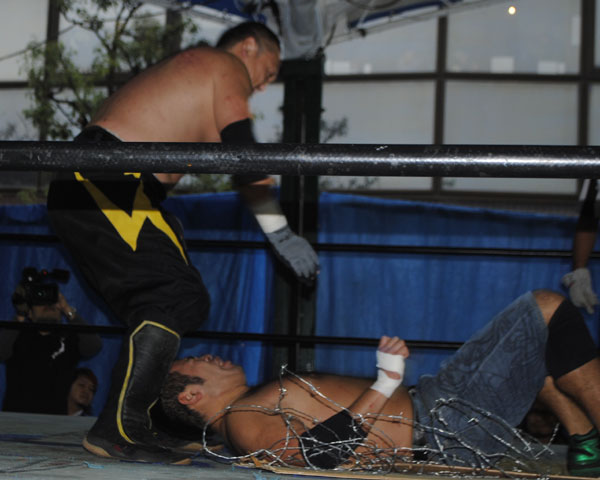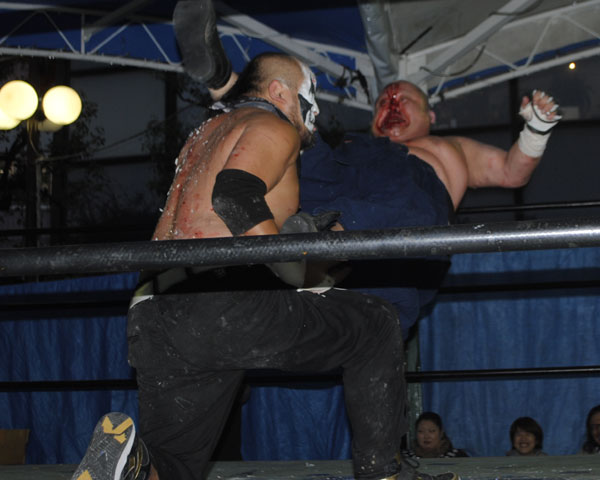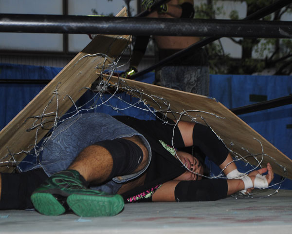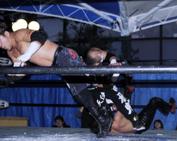 しかしイサミも串刺し攻撃から空中戦で反撃するが、ダイビングボディーアタックはHARASHIMAが剣山で迎撃、HARASHIMAはロープ越えのギロチンドロップを狙うが、イサミはかわしてスライディングキックでHARASHIMAを場外へ出すとトペを浴びせる。