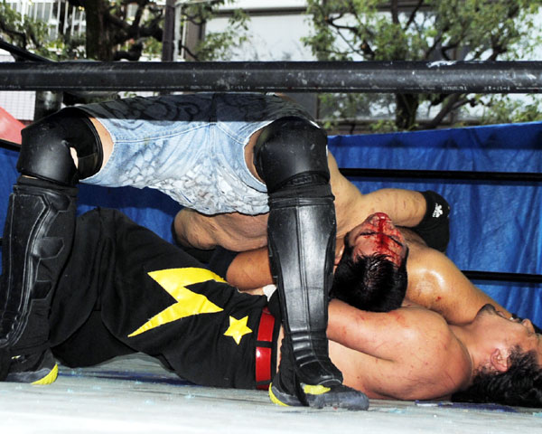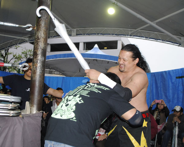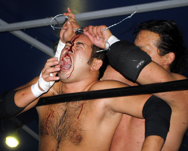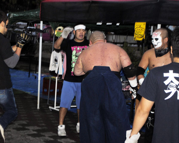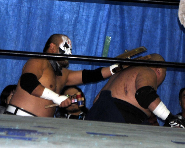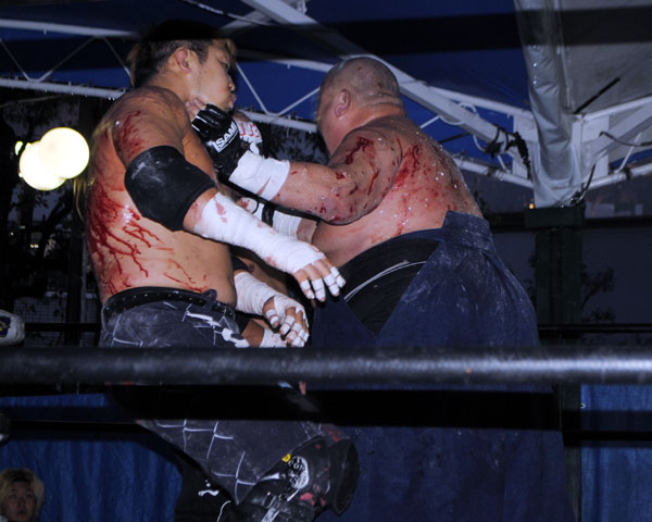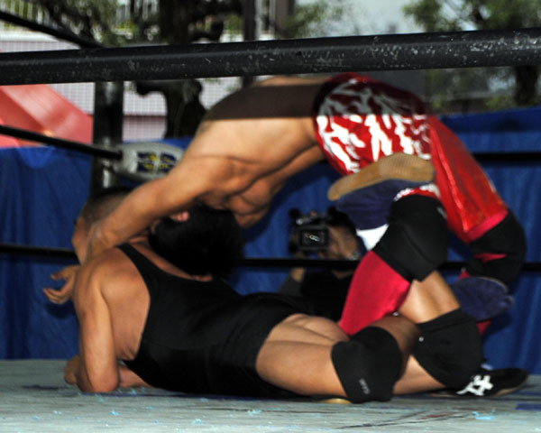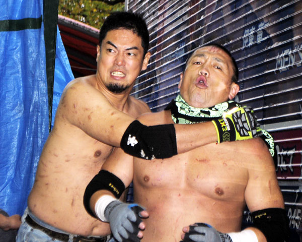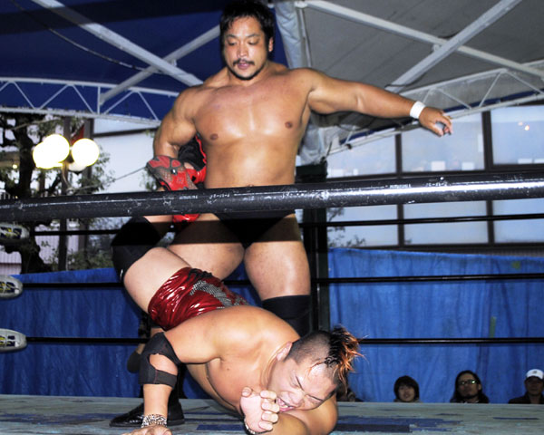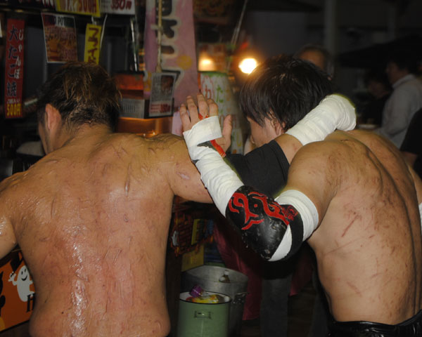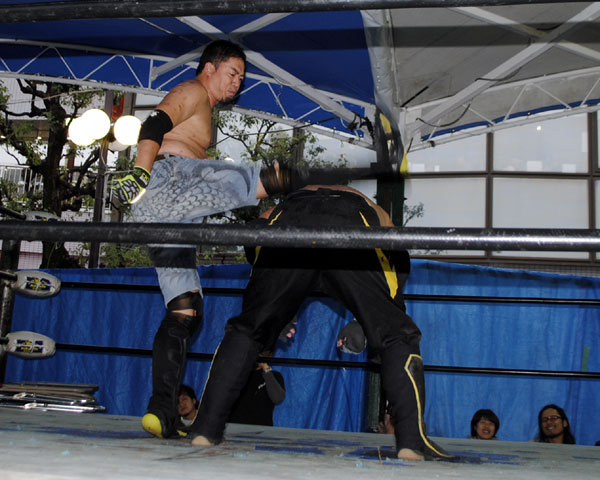 しかしイサミも串刺し攻撃から空中戦で反撃するが、ダイビングボディーアタックはHARASHIMAが剣山で迎撃、HARASHIMAはロープ越えのギロチンドロップを狙うが、イサミはかわしてスライディングキックでHARASHIMAを場外へ出すとトペを浴びせる。