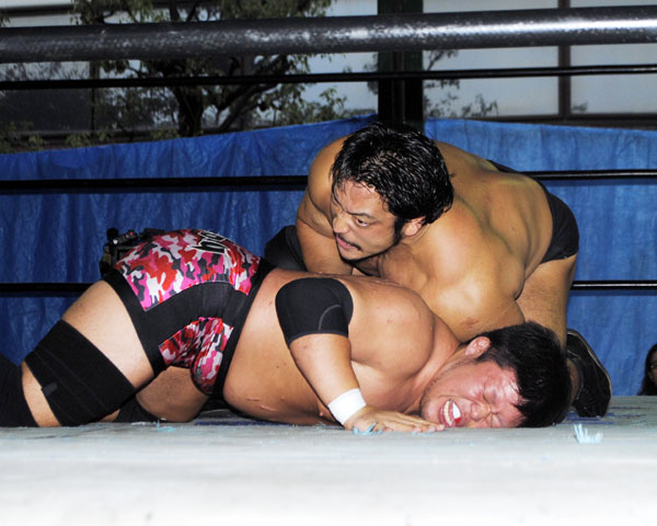 丸藤は小島の串刺し攻撃をコーナーを背にしたジャンピングハイキックからトラースキックコンポで迎撃すると不知火を決めるが、ホールシフト狙いは小島が垂直落下式ブレーンバスターで返し、ラリアットを狙うと丸藤は虎王で迎撃する。