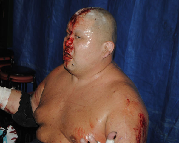 【永田の話】「(ストームはどうだった?)気持ちも入ってて、体型以上の圧力は感じたけど、この俺様にかかったら、こういう結果になるのは最初から分かってた。(2勝目だが?)最初から外国人選手を3戦連続で当ててきて、俺の様子とか調子を見てみようっていうノア側の魂胆なのかもしれないけど、結果はともかく良い仕上がりなんじゃないの? 初戦のヒーロー戦は、相手を掌(てのひら)の上に乗せながら、相手の力を9出させて10の力で仕留めた。2戦目のニコルス戦は、もうダメだ…とノアファンを神にも祈るような気持ちにさせて、最後は俺の負け。まぁハッピーエンドにしちまったけど、それも俺の“腕"だったと思うよ。そして今日は俺を相手にあそこまでムキになってきたクワイエット・ストームがいた。ノアの選手はあぐらかいて見てるだけか? 俺が最初に乗り込んできた時は、そんなことは無かったんじゃないのか?(次はマイバッハだが?)俺にヘタなことしてみろ。次はマスク剥ぎとって、アイツの顔をあらゆるメディアを通じて全世界に晒してやる。まぁ、ここからゼアッ!」