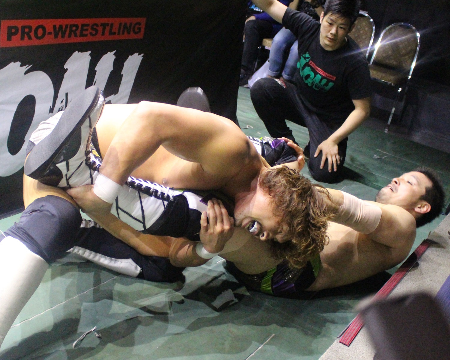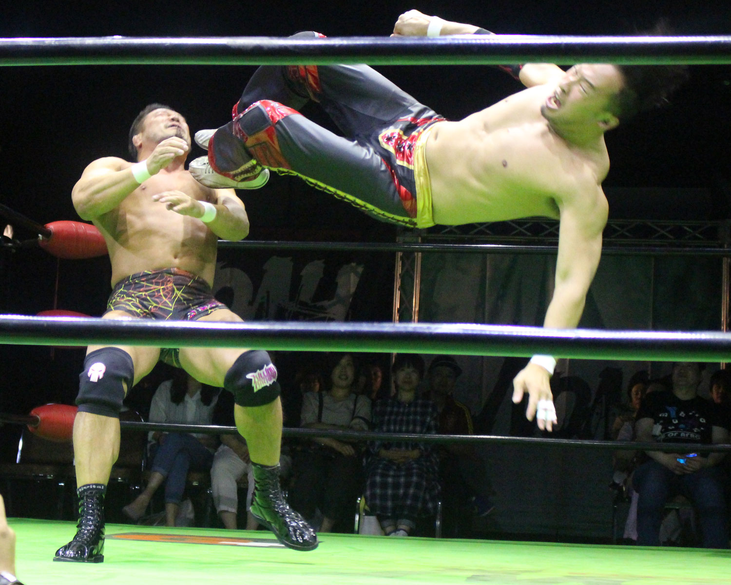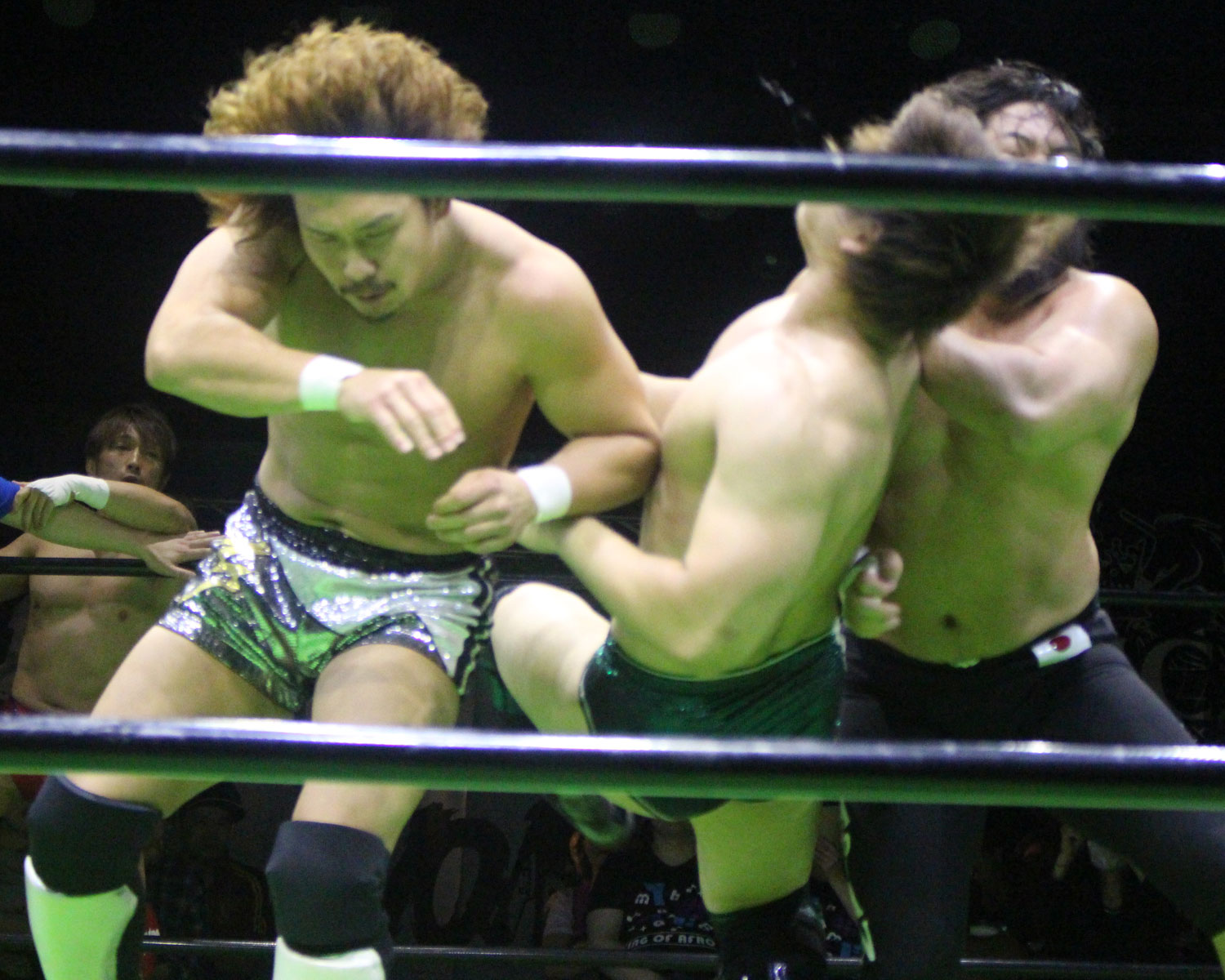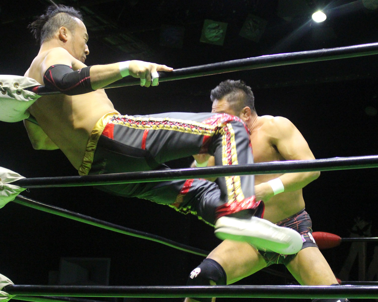 シュンは突進するBen-Kにドロップキックを放ち、場外に落ちたBen-Kに三角飛びプランチャを発射、リングに戻り飛距離のあるスワンダイブボディープレス、Ben-Kの串刺しを迎撃してクロスボディーを発射もmBen-Kがキャッチしてフロントスープレックスで投げる。