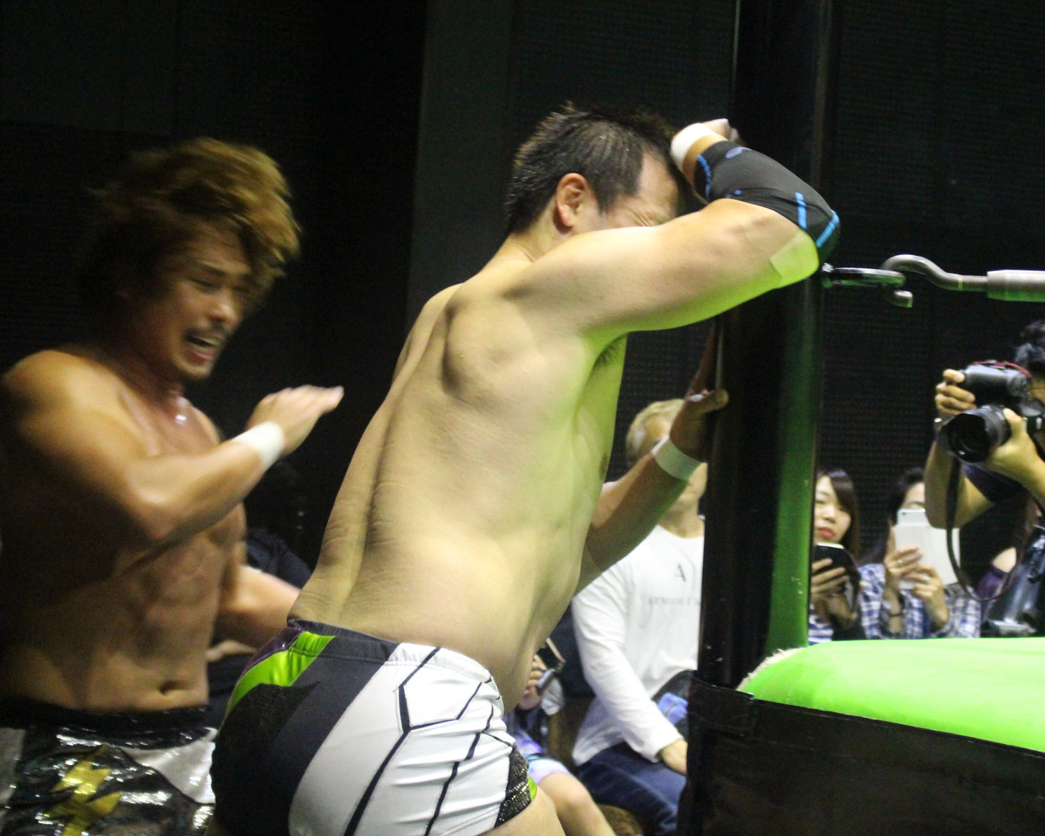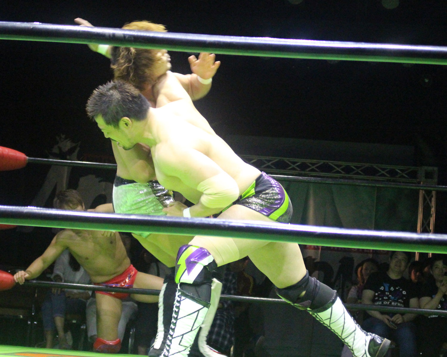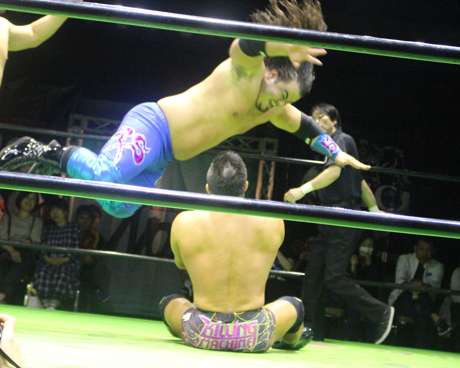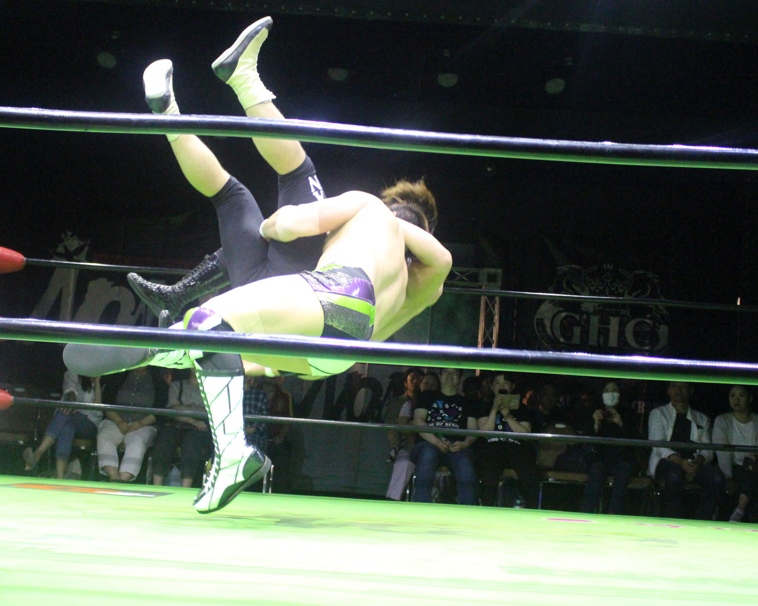 シュンは突進するBen-Kにドロップキックを放ち、場外に落ちたBen-Kに三角飛びプランチャを発射、リングに戻り飛距離のあるスワンダイブボディープレス、Ben-Kの串刺しを迎撃してクロスボディーを発射もmBen-Kがキャッチしてフロントスープレックスで投げる。