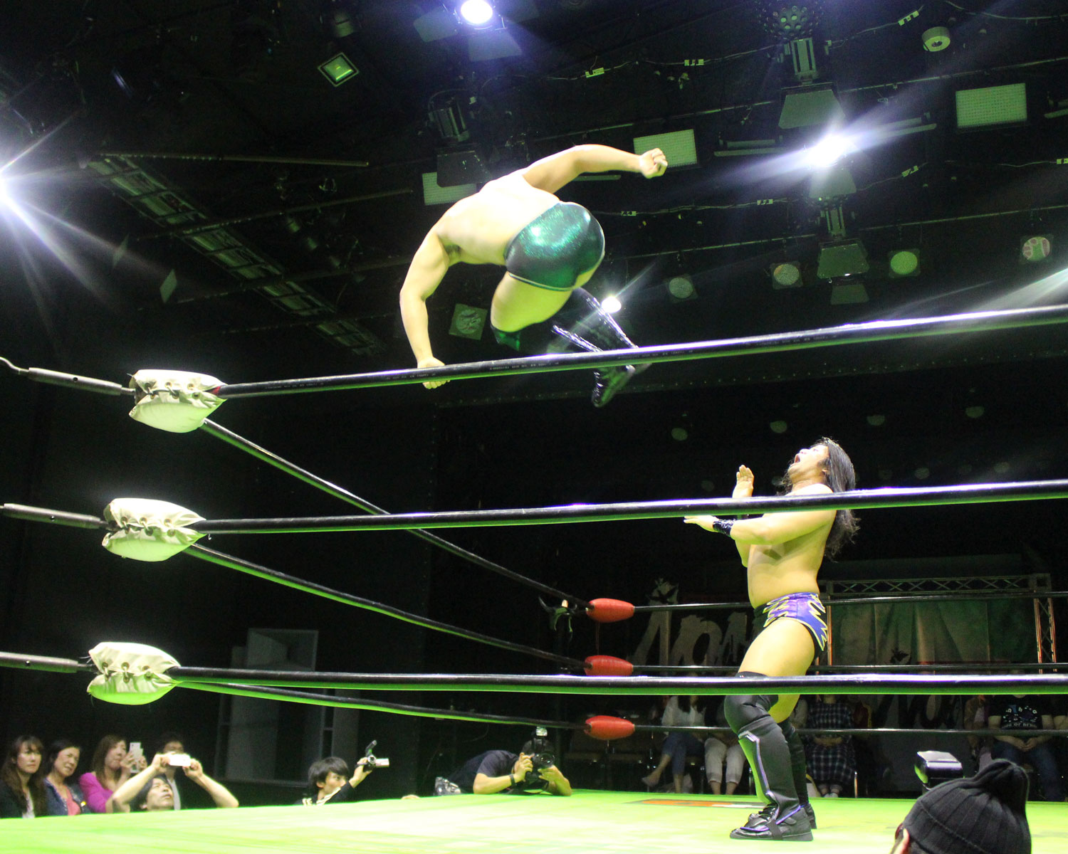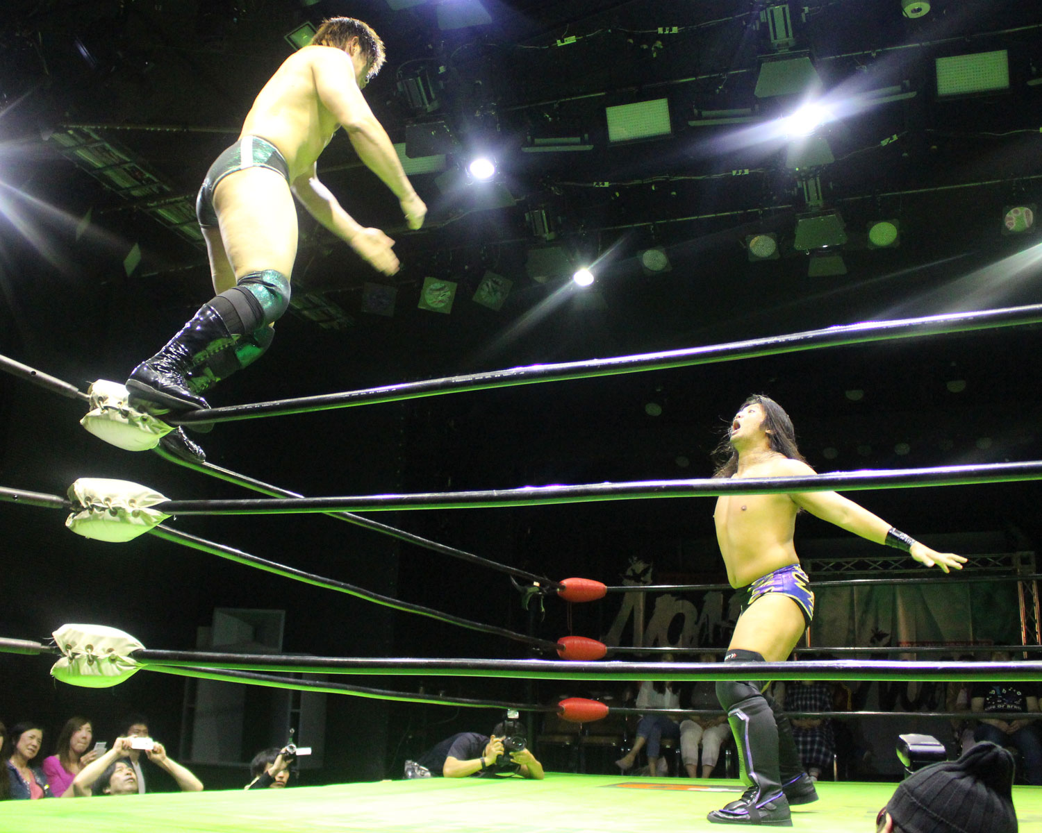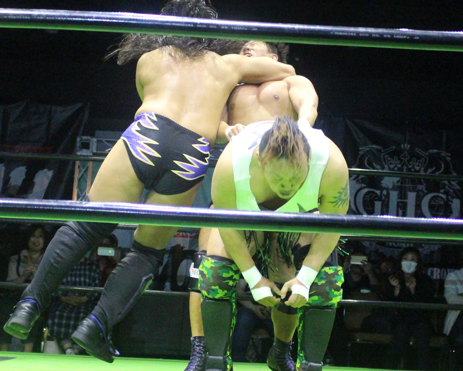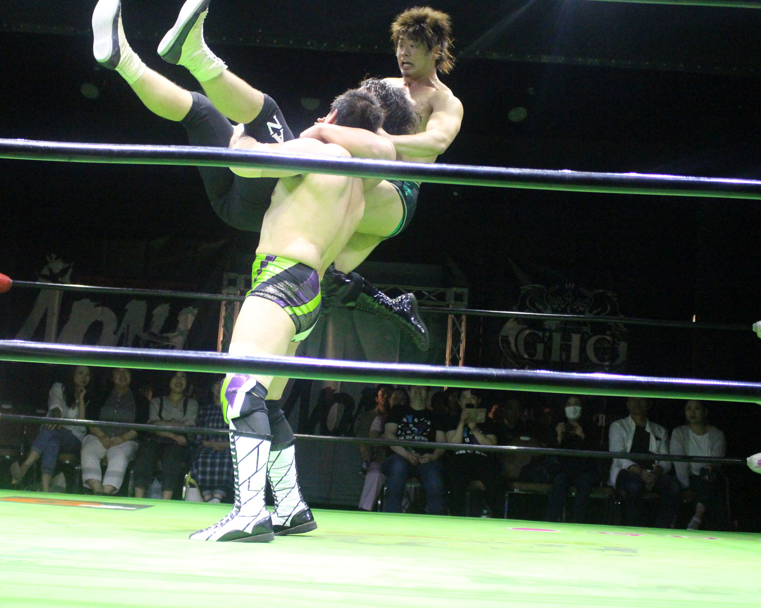 シュンは突進するBen-Kにドロップキックを放ち、場外に落ちたBen-Kに三角飛びプランチャを発射、リングに戻り飛距離のあるスワンダイブボディープレス、Ben-Kの串刺しを迎撃してクロスボディーを発射もmBen-Kがキャッチしてフロントスープレックスで投げる。