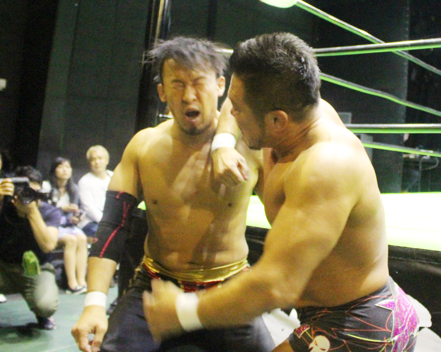 張り手合戦、ラリアットも相打ち、SHOが突進したところで、セイビンがラリアットを連発し、クレイドル・ショックを狙うが、逃れたSHOは3連続ジャーマンから脇固め、ローリング式腕十字も、セイビンは十字架固めで切り返してからスーパーキックの連打を浴びせる。