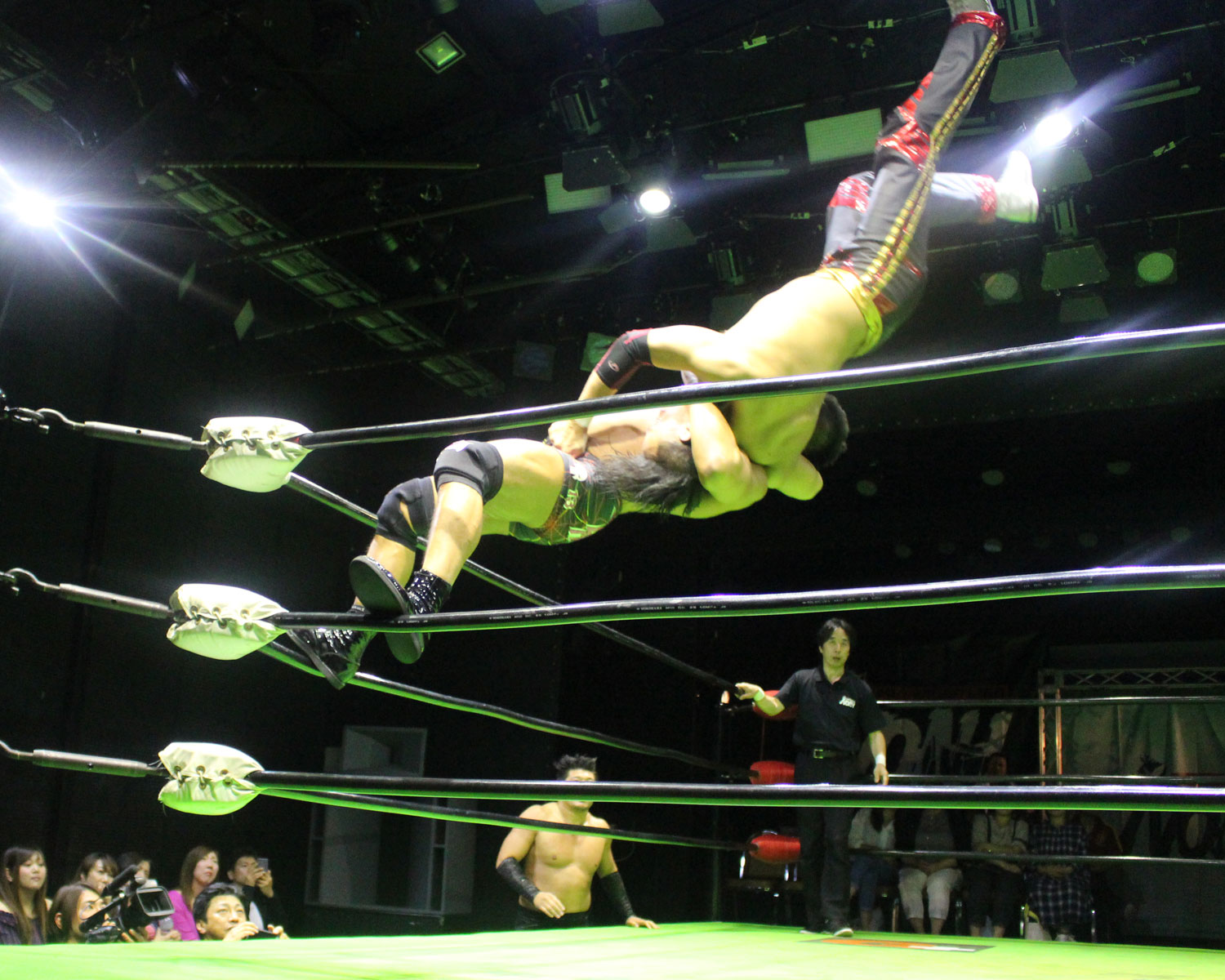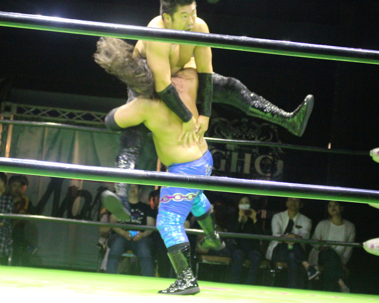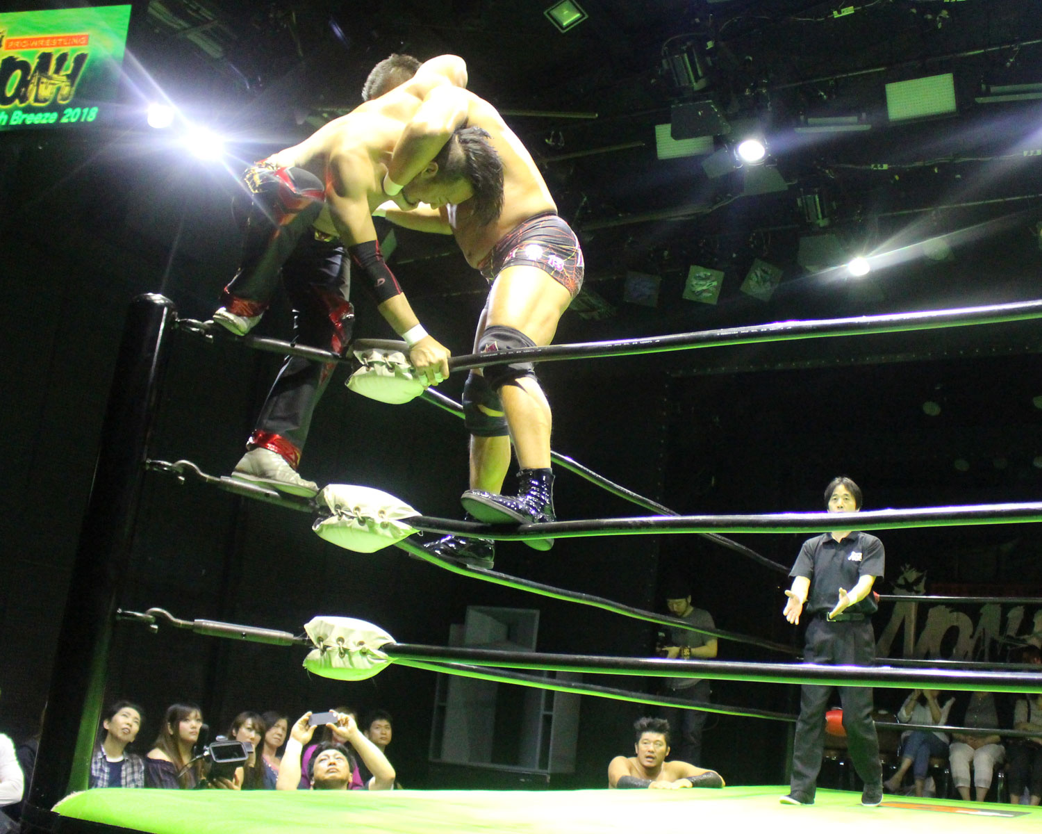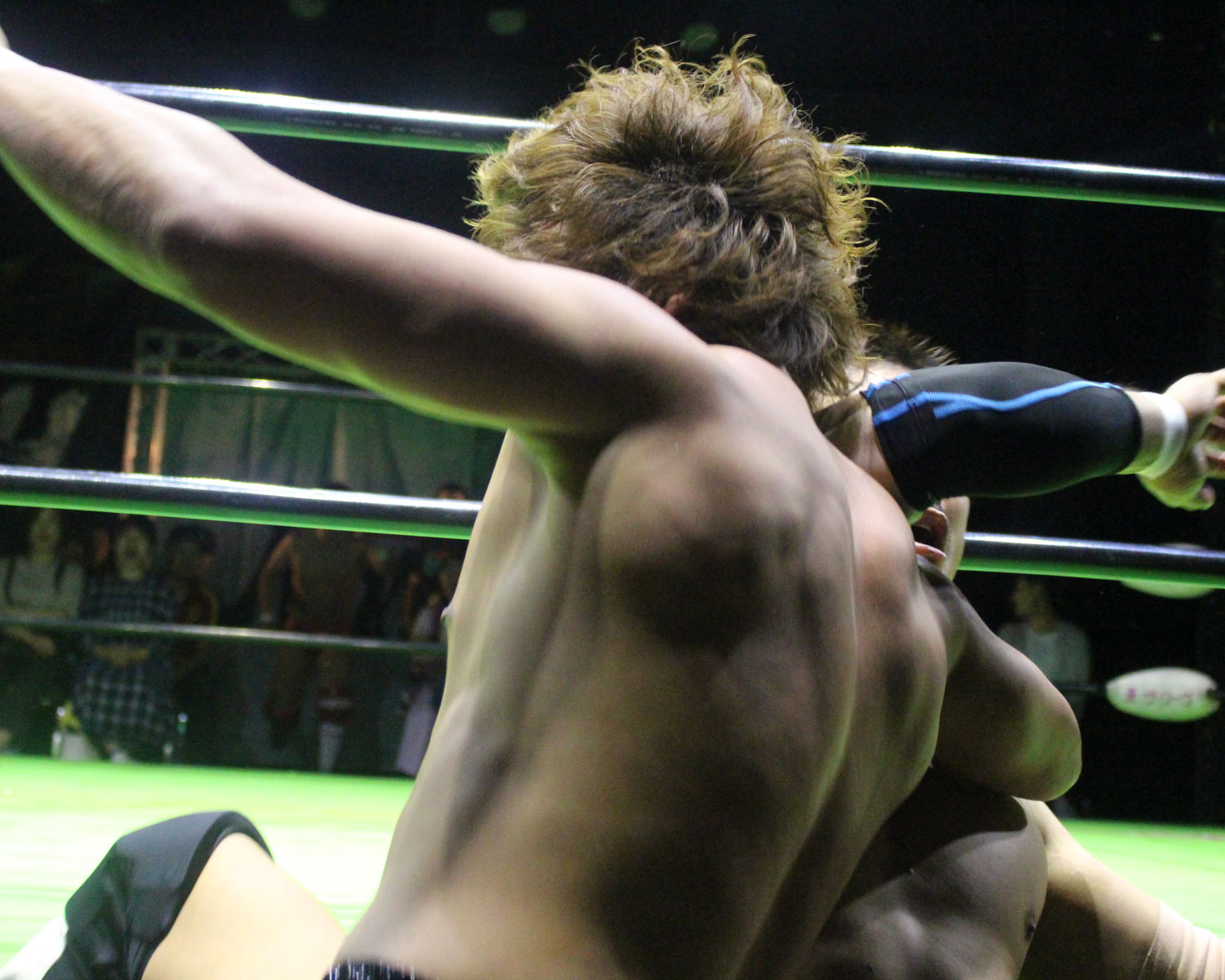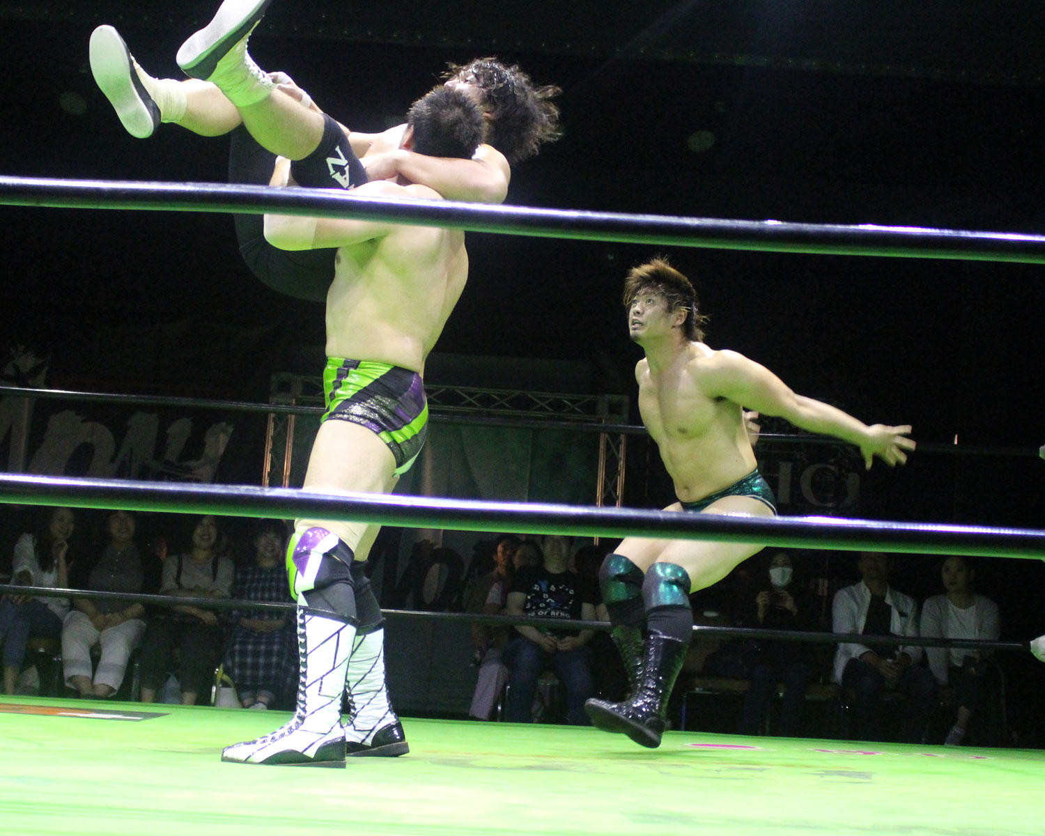 逃れたセイビンはヘッドロック高速DDTで反撃、セイビンはソバット、SHOの回転エビ固めをランニングローキック、場外に逃れたSHOにエプロンダッシュのランニングローキックからトペコンを発射、リングに戻ってミサイルキックと一気に流れを変え、セイビンは串刺しビックブーツからトップコーナーから雪崩式ブレーンバスター、しかしロープに飛び乗ってからのトルネードDDTは、SHOがキャッチしてアバランシュホールドで叩きつける。