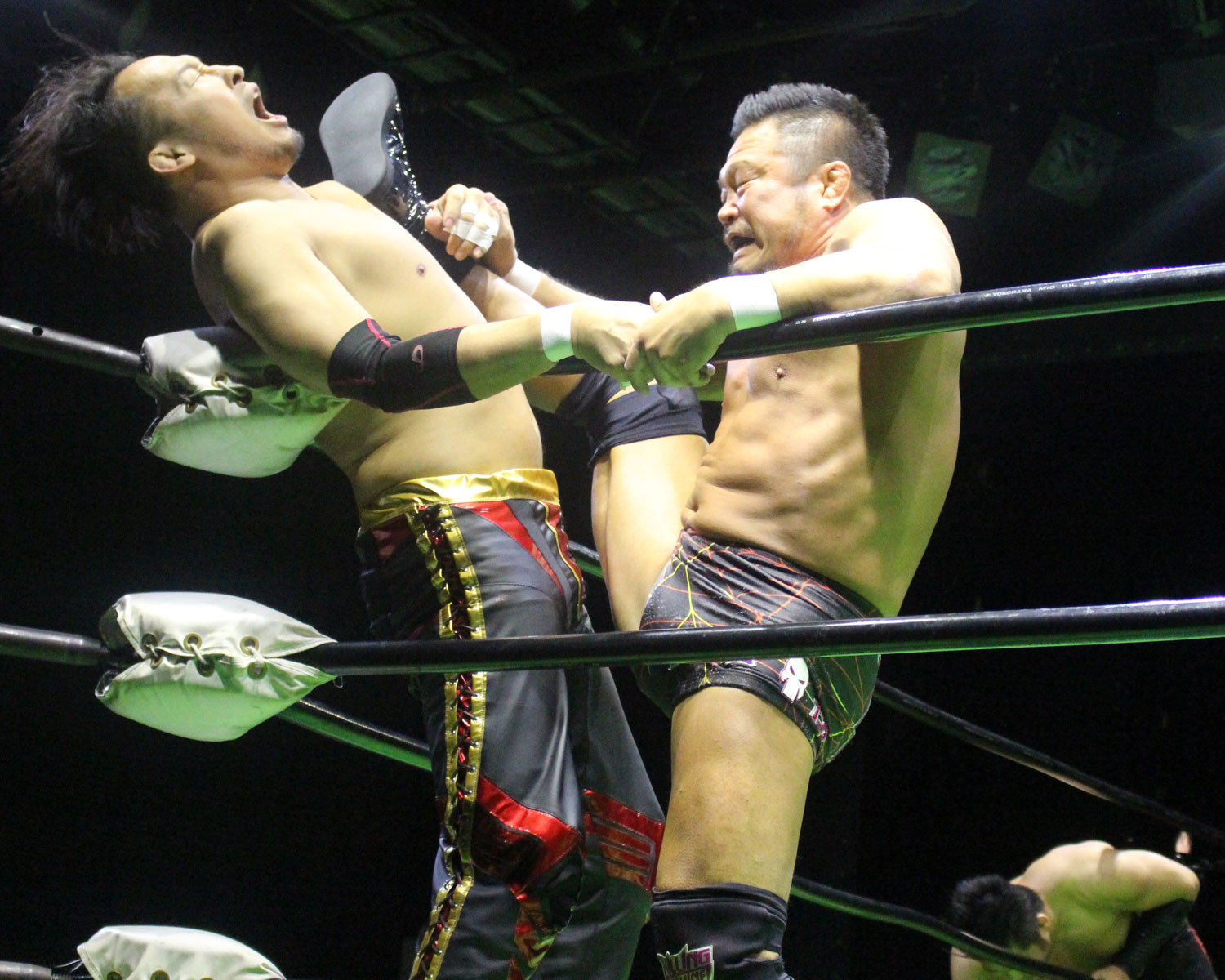 リーの飛び膝に対し田口はヒップアタックの連打も、ジャーマンで投げたリーはデスヌカドーラを狙い、田口が首固めで切り返すも、リーはスーパーキックからデスヌカドーラで3カウント!田口が上手く自分の世界に引き込めていたが、詰めが甘かった。セイビンvsSHOは、セイビンが低空ドロップキックから、ロメロスペシャルと見せかけ両膝裏を踏みつけて足攻めを狙うも、SHOはロープ越しのアームブリーカーで反撃し、座り込んだセイビンにスライディングキック、コーナーを使ってのアームロック、リングに戻ってクロスアームブリーカーからグラウンド卍、セイビンのエルボーを受けきって胴絞めスリーパーから腕十字と腕攻めでリードを奪う。