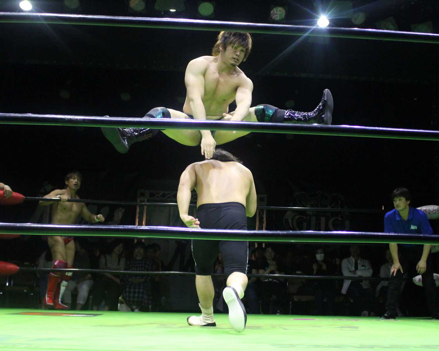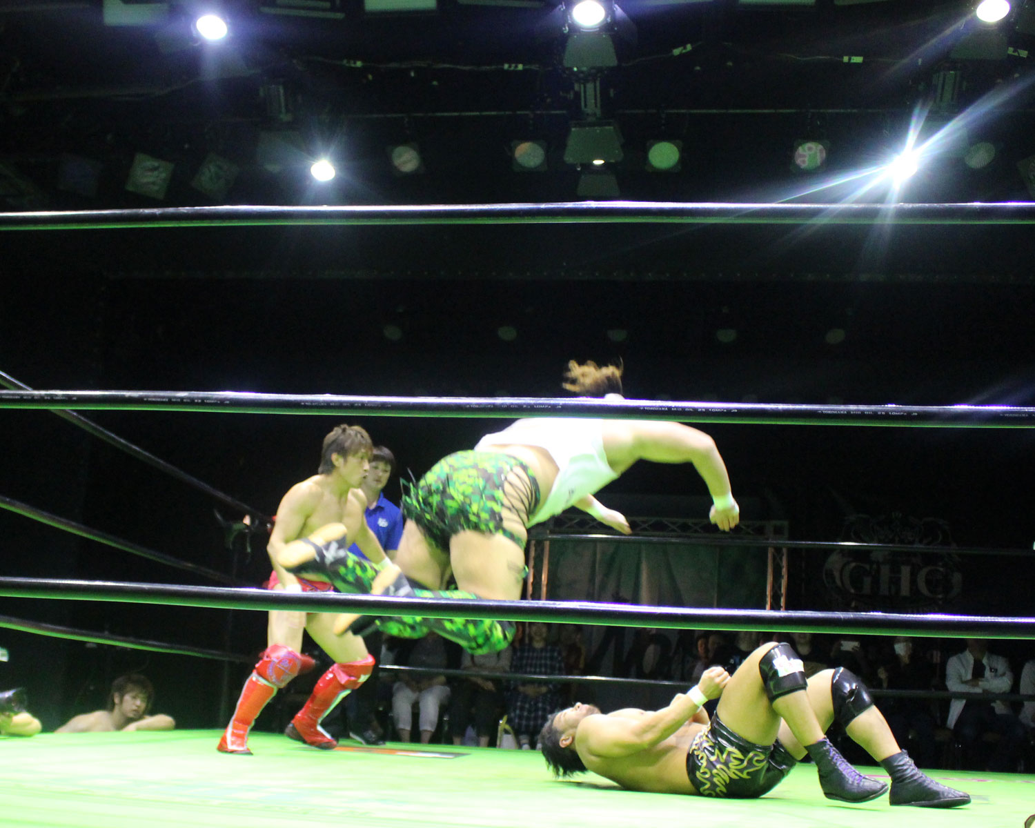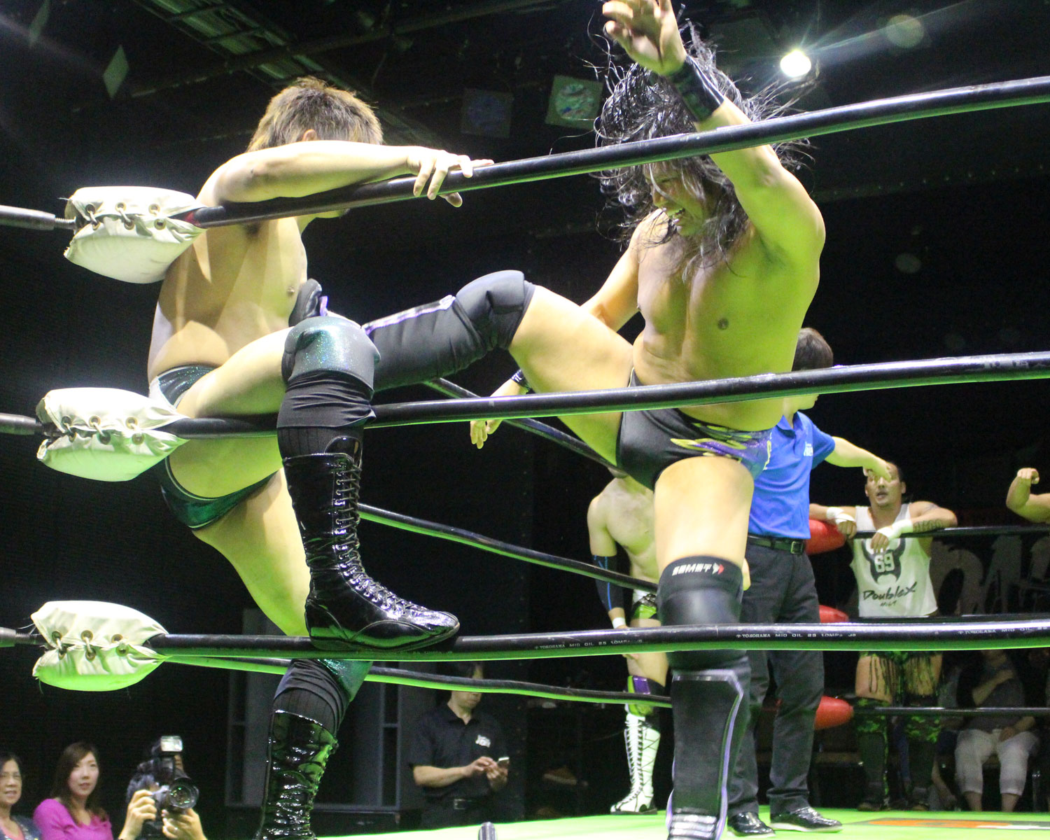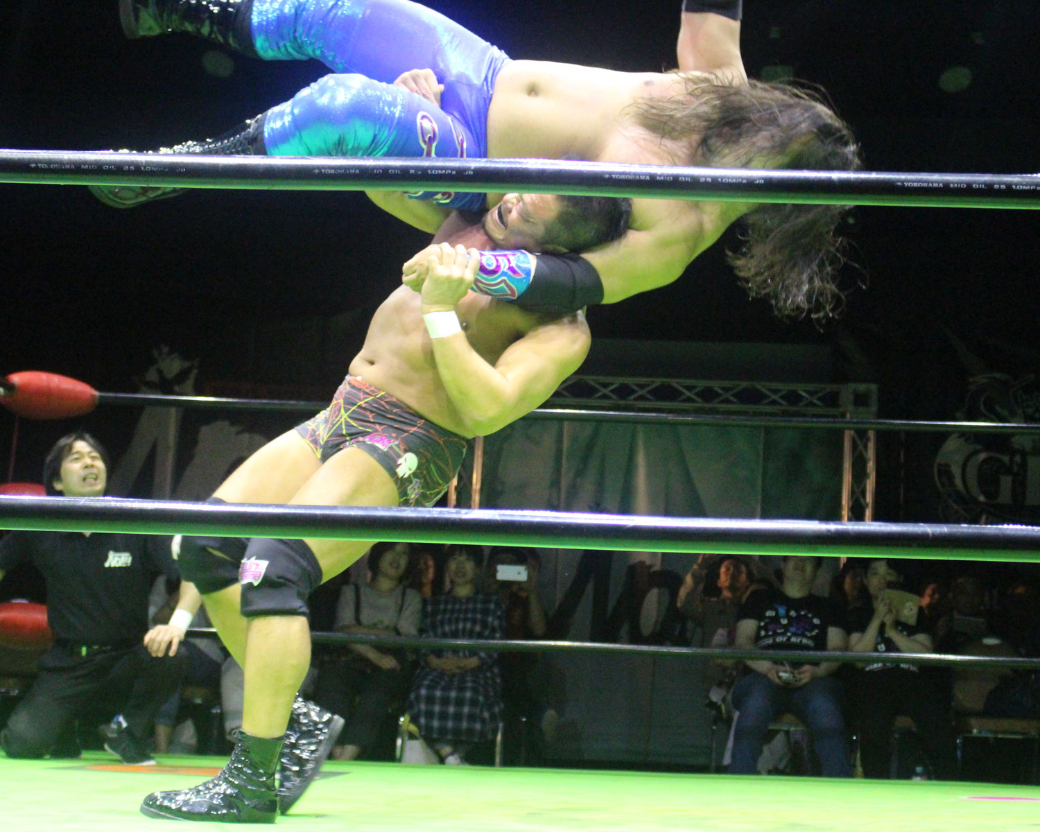 田口はリーを場外へ出すと三角飛びプランチャを発射し、リングに戻ってスワンダイブヒップアタック、もたれるリーにヒップアタックの連打、リーのドロップキックもかわしてヒップアタックと猛反撃するが、ギタったところで、リーが尻めがけてドロップキックを発射、だがリーは抱えると着地した田口がどどん狙いはリーが切り返し、、田口がラ・マヒストラルから丸め込み合戦も、リーがロープ越しのハイキックからのコーナーの攻撃を狙いは、田口は雪崩式狙うと、宙吊りになった田口にパタラス・エネル・ペチョを狙うが、かわした田口がオーマイ&ガーアンクルで捕獲する。