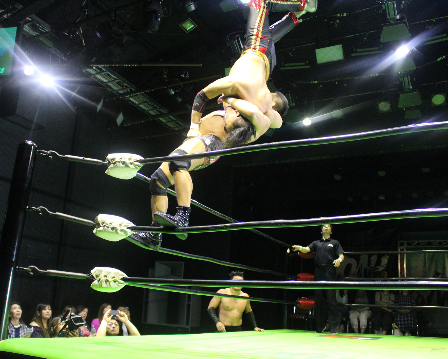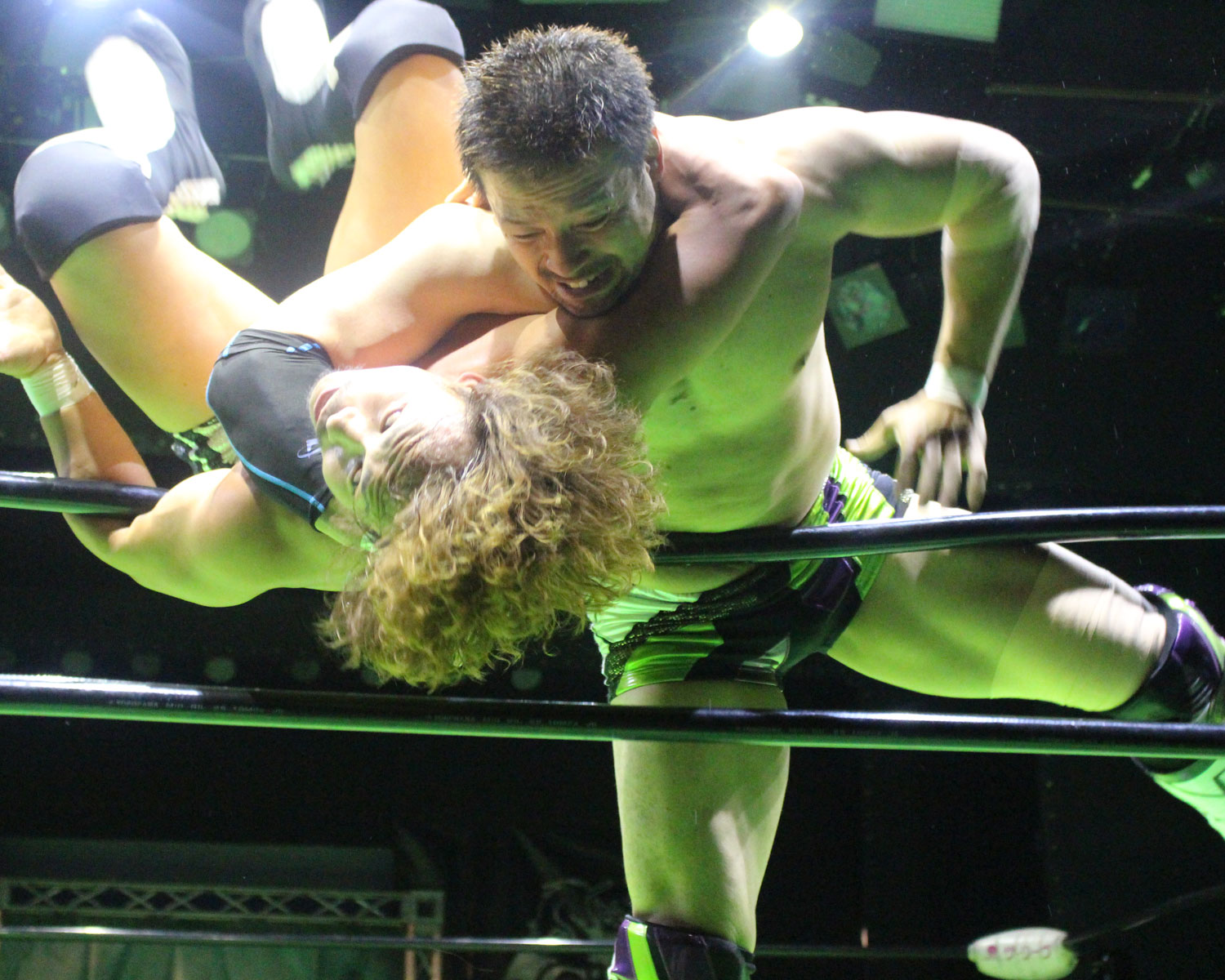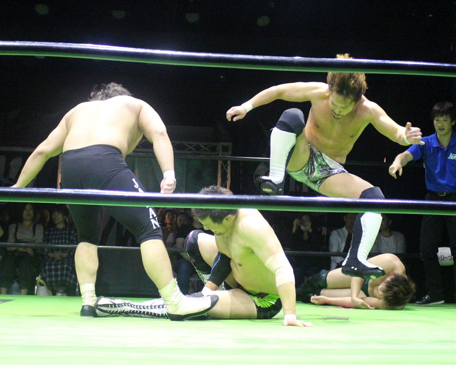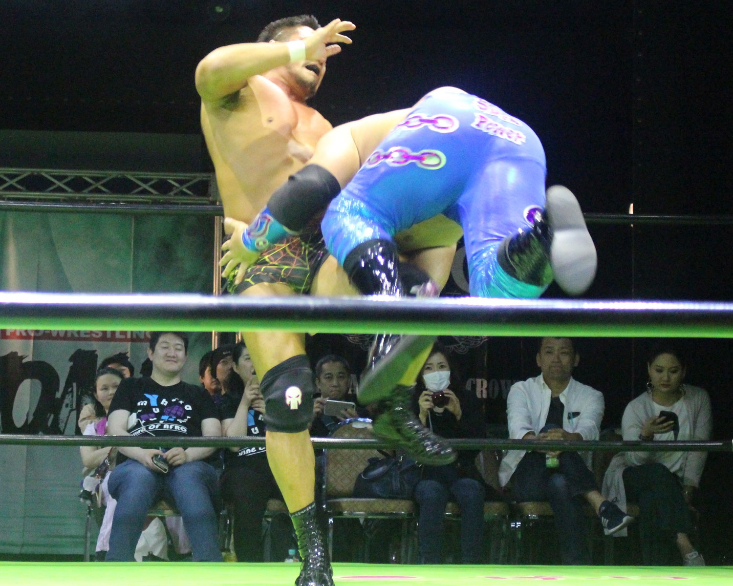 田口はリーを場外へ出すと三角飛びプランチャを発射し、リングに戻ってスワンダイブヒップアタック、もたれるリーにヒップアタックの連打、リーのドロップキックもかわしてヒップアタックと猛反撃するが、ギタったところで、リーが尻めがけてドロップキックを発射、だがリーは抱えると着地した田口がどどん狙いはリーが切り返し、、田口がラ・マヒストラルから丸め込み合戦も、リーがロープ越しのハイキックからのコーナーの攻撃を狙いは、田口は雪崩式狙うと、宙吊りになった田口にパタラス・エネル・ペチョを狙うが、かわした田口がオーマイ&ガーアンクルで捕獲する。