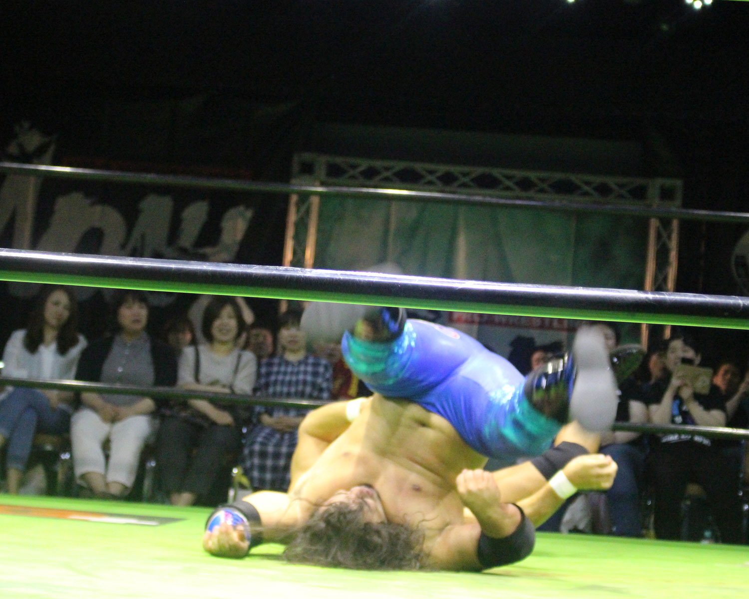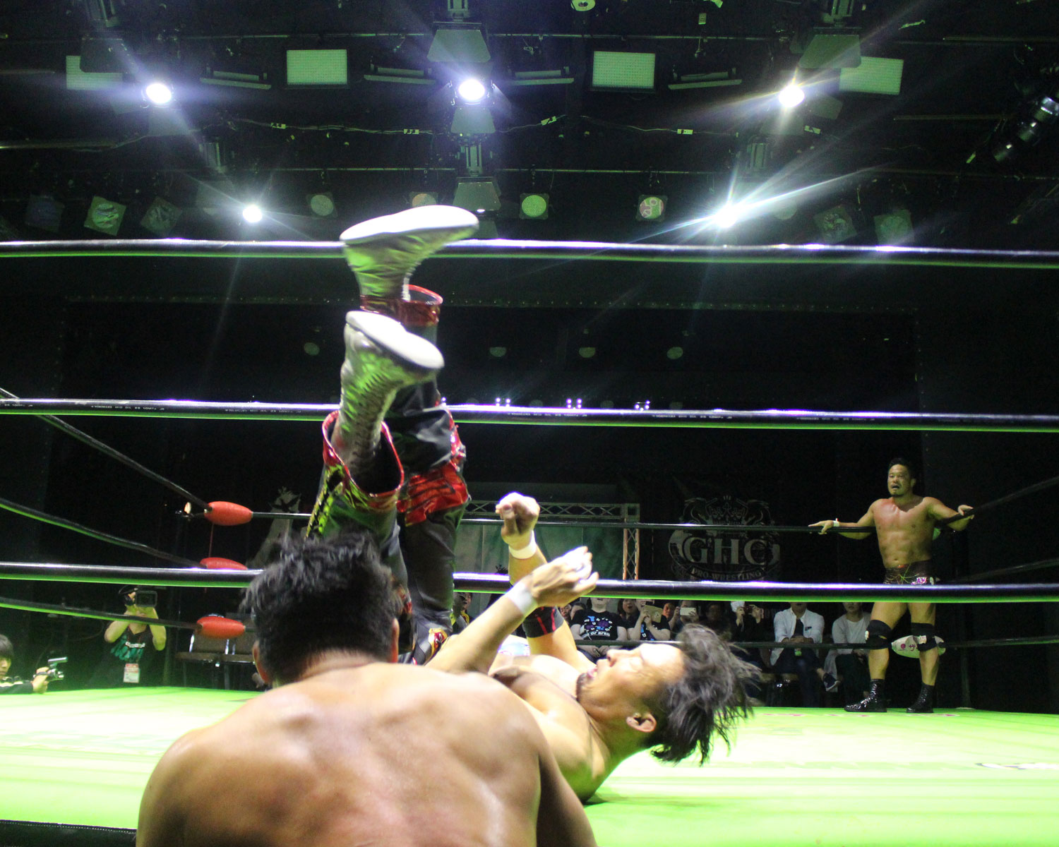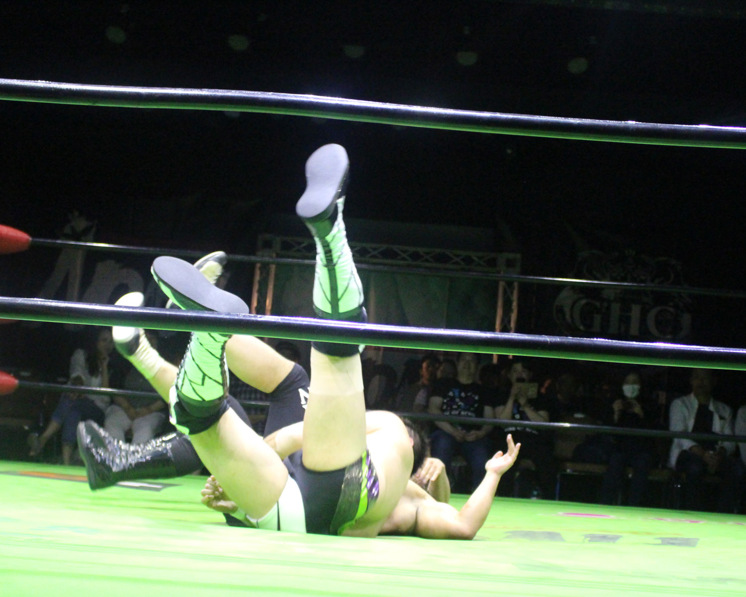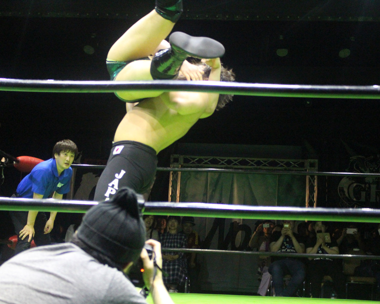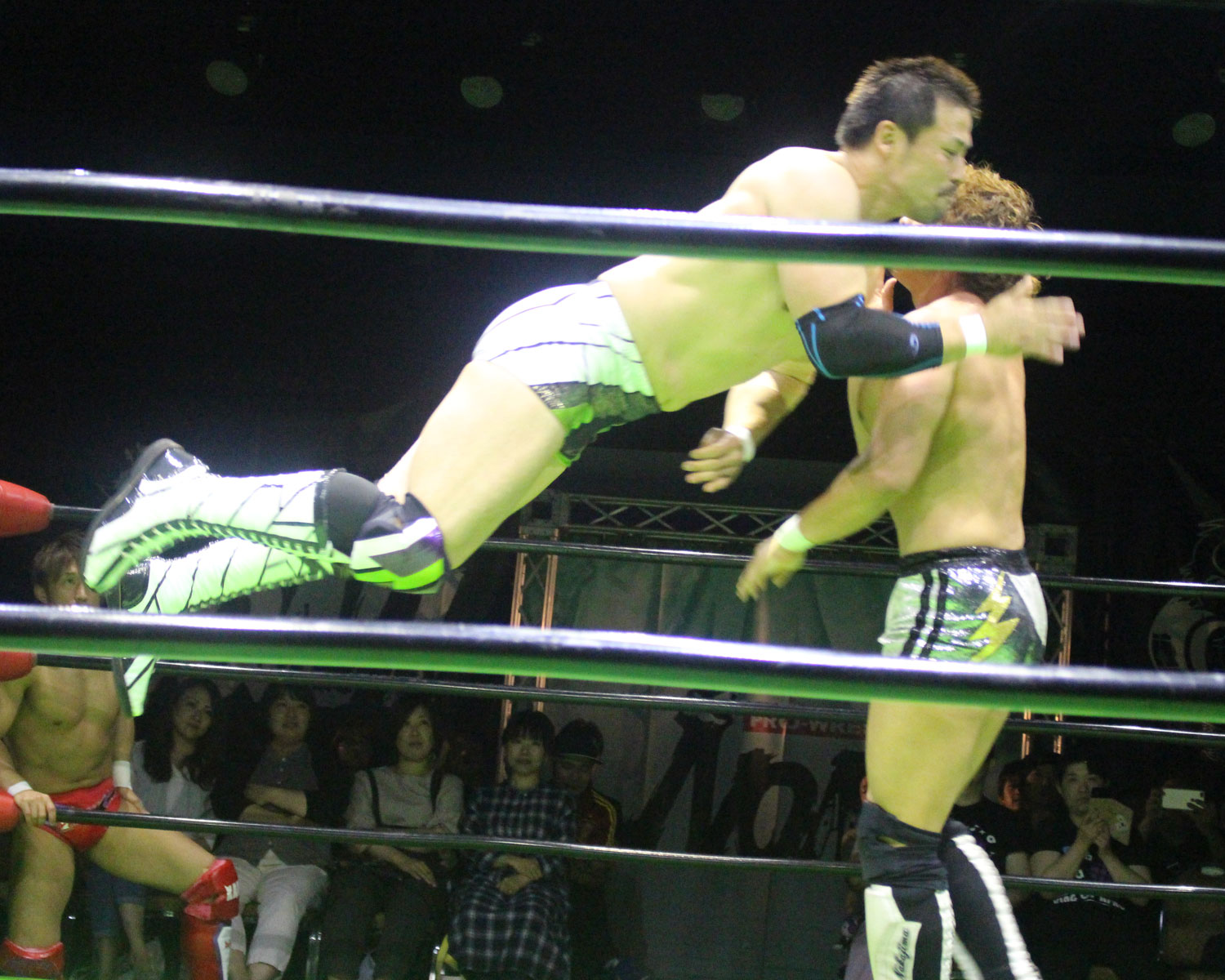 田口はリーを場外へ出すと三角飛びプランチャを発射し、リングに戻ってスワンダイブヒップアタック、もたれるリーにヒップアタックの連打、リーのドロップキックもかわしてヒップアタックと猛反撃するが、ギタったところで、リーが尻めがけてドロップキックを発射、だがリーは抱えると着地した田口がどどん狙いはリーが切り返し、、田口がラ・マヒストラルから丸め込み合戦も、リーがロープ越しのハイキックからのコーナーの攻撃を狙いは、田口は雪崩式狙うと、宙吊りになった田口にパタラス・エネル・ペチョを狙うが、かわした田口がオーマイ&ガーアンクルで捕獲する。