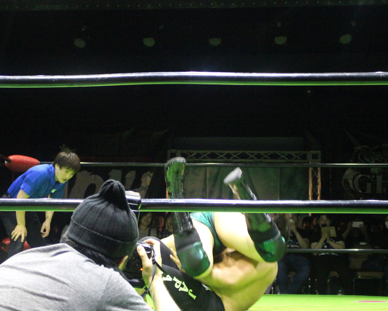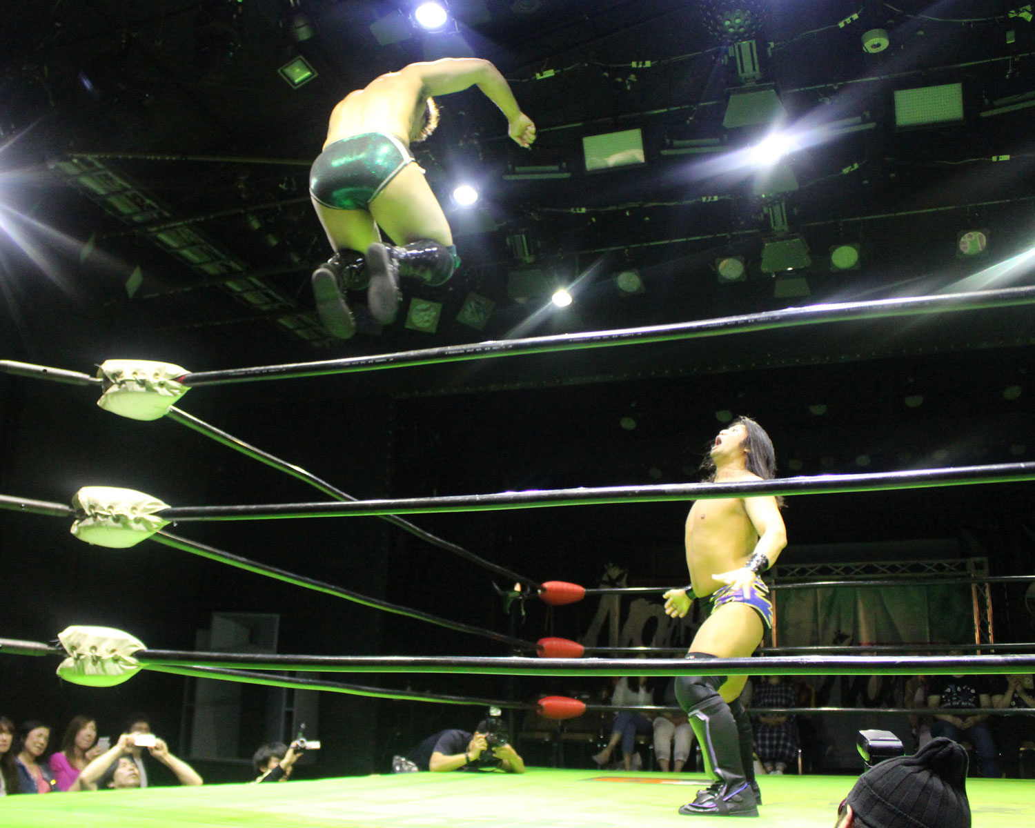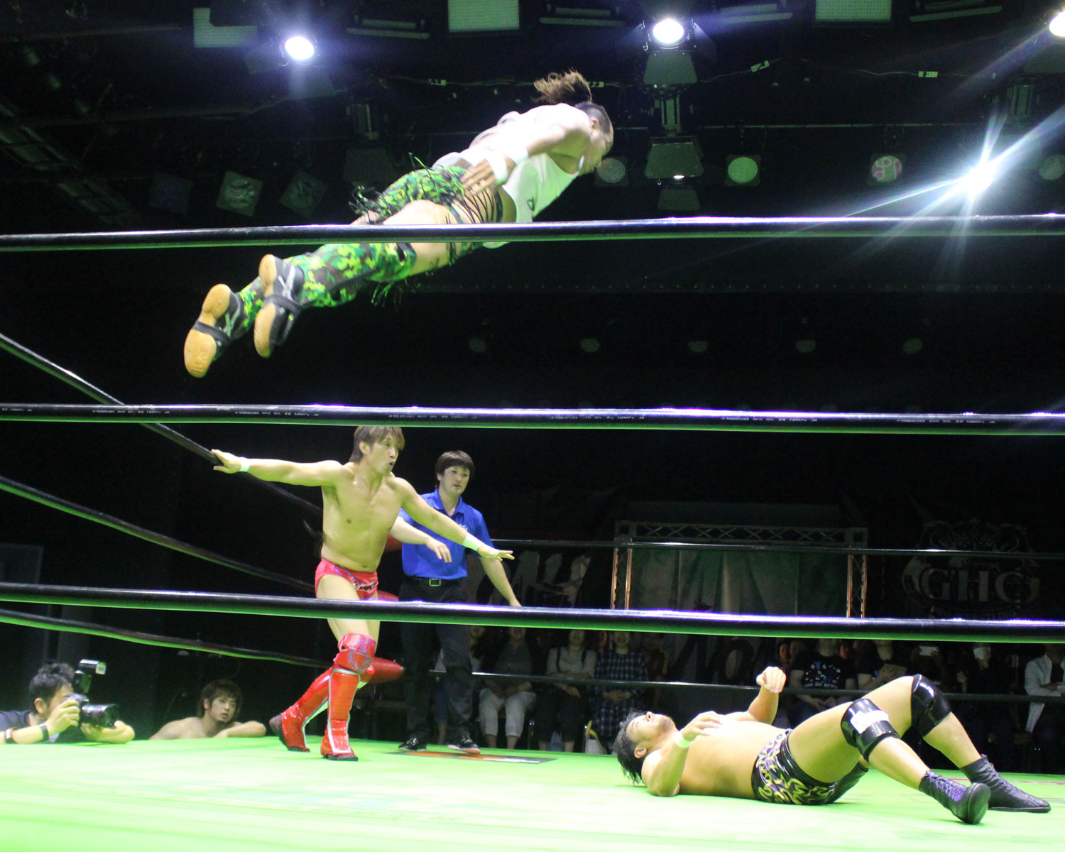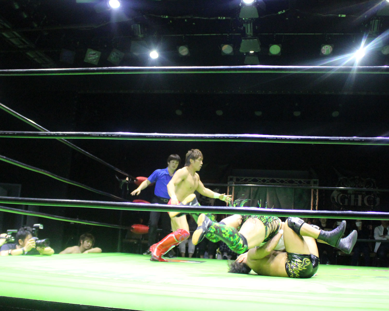 田口はリーを場外へ出すと三角飛びプランチャを発射し、リングに戻ってスワンダイブヒップアタック、もたれるリーにヒップアタックの連打、リーのドロップキックもかわしてヒップアタックと猛反撃するが、ギタったところで、リーが尻めがけてドロップキックを発射、だがリーは抱えると着地した田口がどどん狙いはリーが切り返し、、田口がラ・マヒストラルから丸め込み合戦も、リーがロープ越しのハイキックからのコーナーの攻撃を狙いは、田口は雪崩式狙うと、宙吊りになった田口にパタラス・エネル・ペチョを狙うが、かわした田口がオーマイ&ガーアンクルで捕獲する。