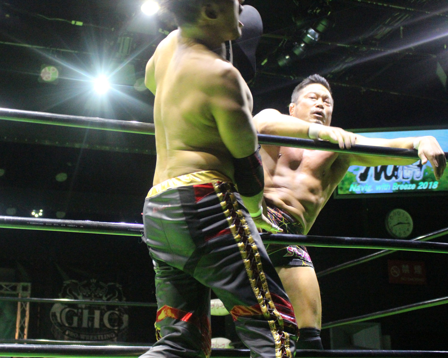 AブロックのBen-Kvsシュンは、シュンはバイシクルキックからBen-Kを場外に追いやり、トペフェイントも、着地した瞬間を逃さなかったBen-Kはリングに戻ってショルダータックルで強襲、キャメルクラッチやカナディアンバックブリーカードロップと腰攻めでリードを奪う。