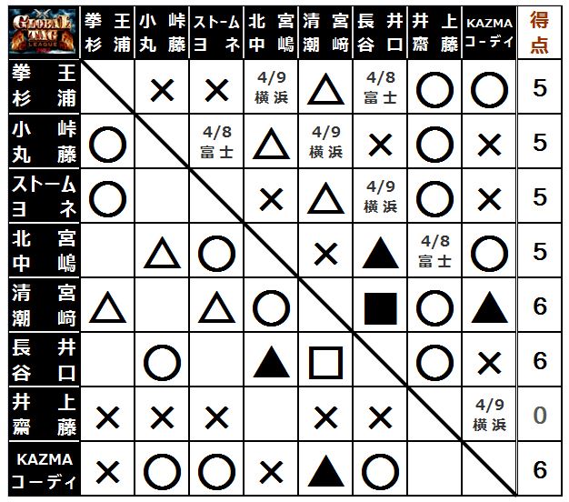[3勝1敗2分1両者リングアウト=8点]○潮崎豪 清宮海斗(18分28秒 片エビ固め)[3勝3敗1分=7点]丸藤正道 ×小峠篤司
