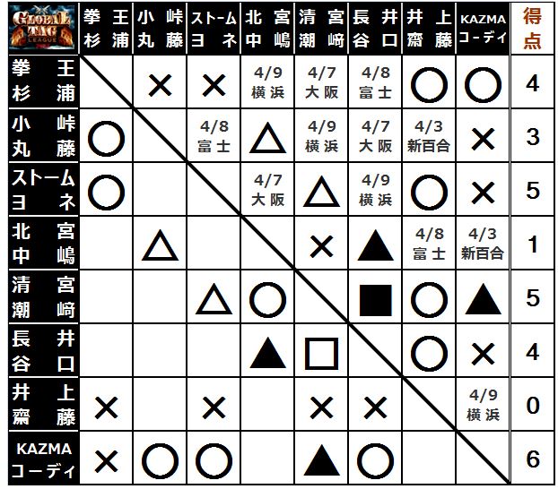 これまでの経過を見ると下馬評を覆してKAZMA&コーディが単独トップ、ファンキーパワーズと潮崎&清宮組が1点差で追いかけ、王者組のジ・アグレッションは3戦して1点どまりと厳しい状況となった。