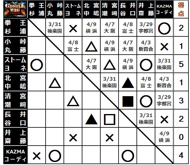 [1勝1敗1分=3点]丸藤正道 ○小峠篤司(18分10秒 キドクラッチ)[2勝2敗=4点]X杉浦貴 拳王(試合終了後頭突きのダメージから杉浦は立ち上がれず。眉間から血を流して荒ぶる小峠は拳王を場外に投げ捨てると、額から流血した杉浦の首根っこを掴んで勝ち誇った。そして、場外に降りた杉浦をリング上から挑発。赤コーナーにあったGHCのベルトを手にすると、あえて杉浦に返す
