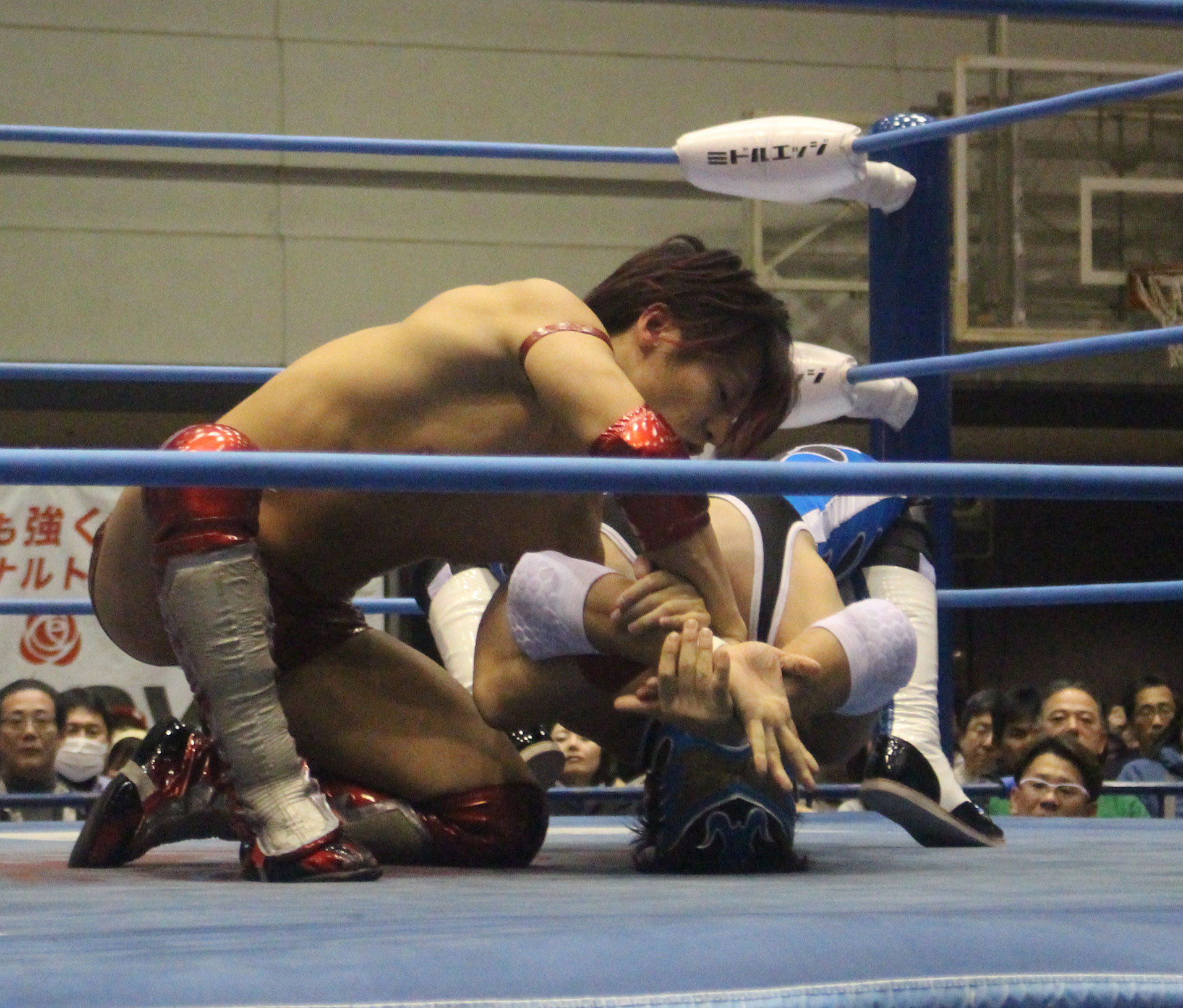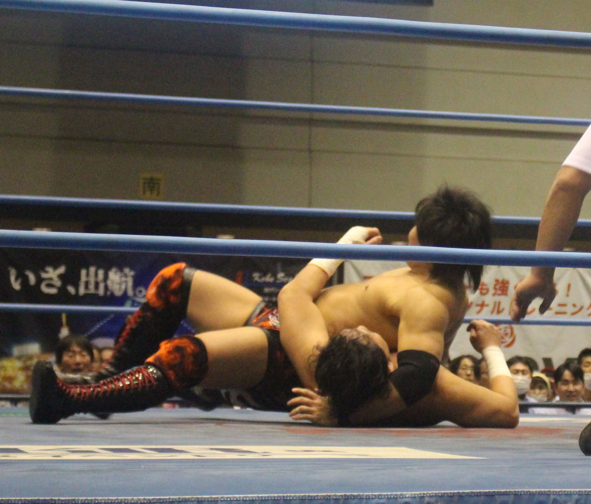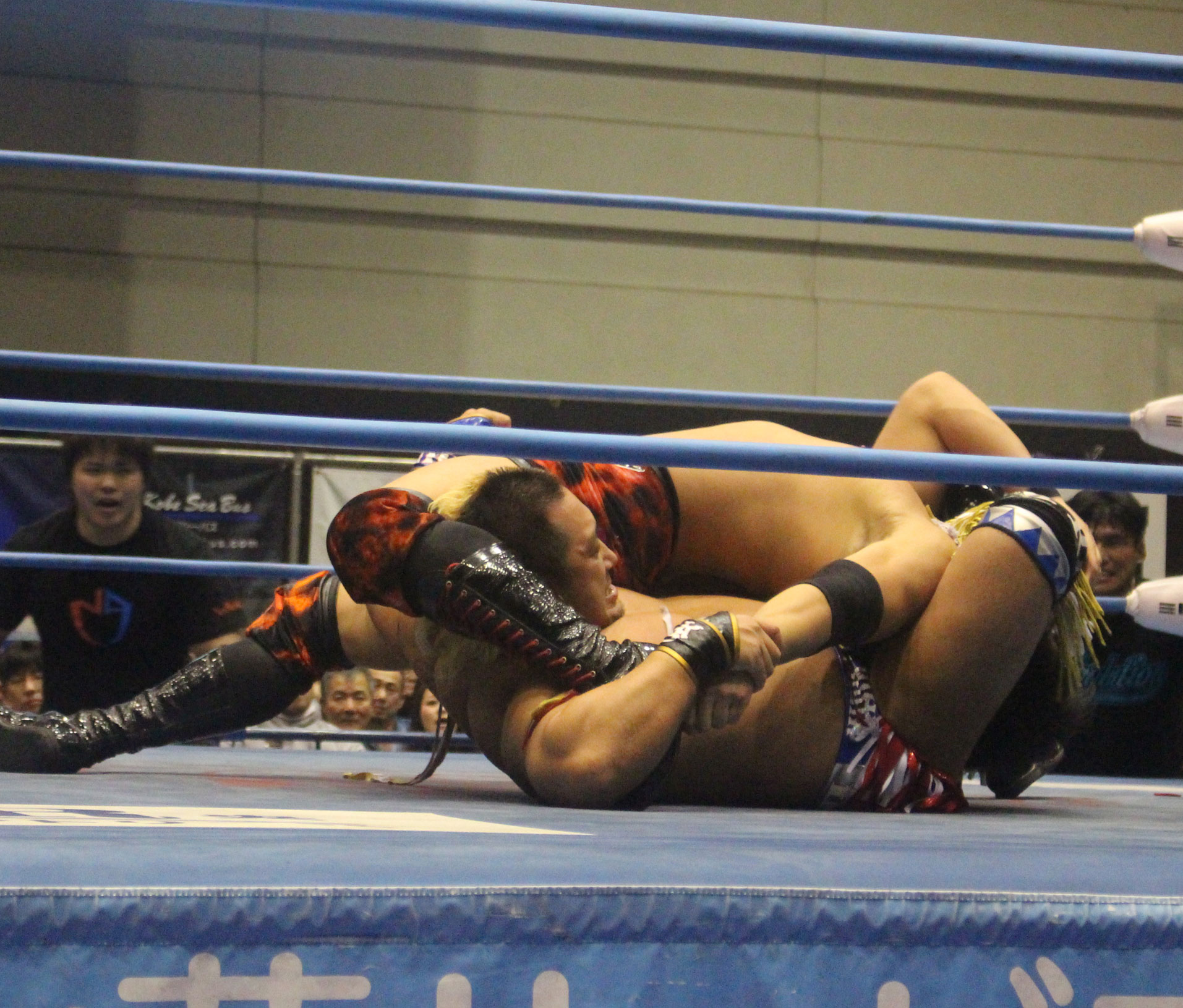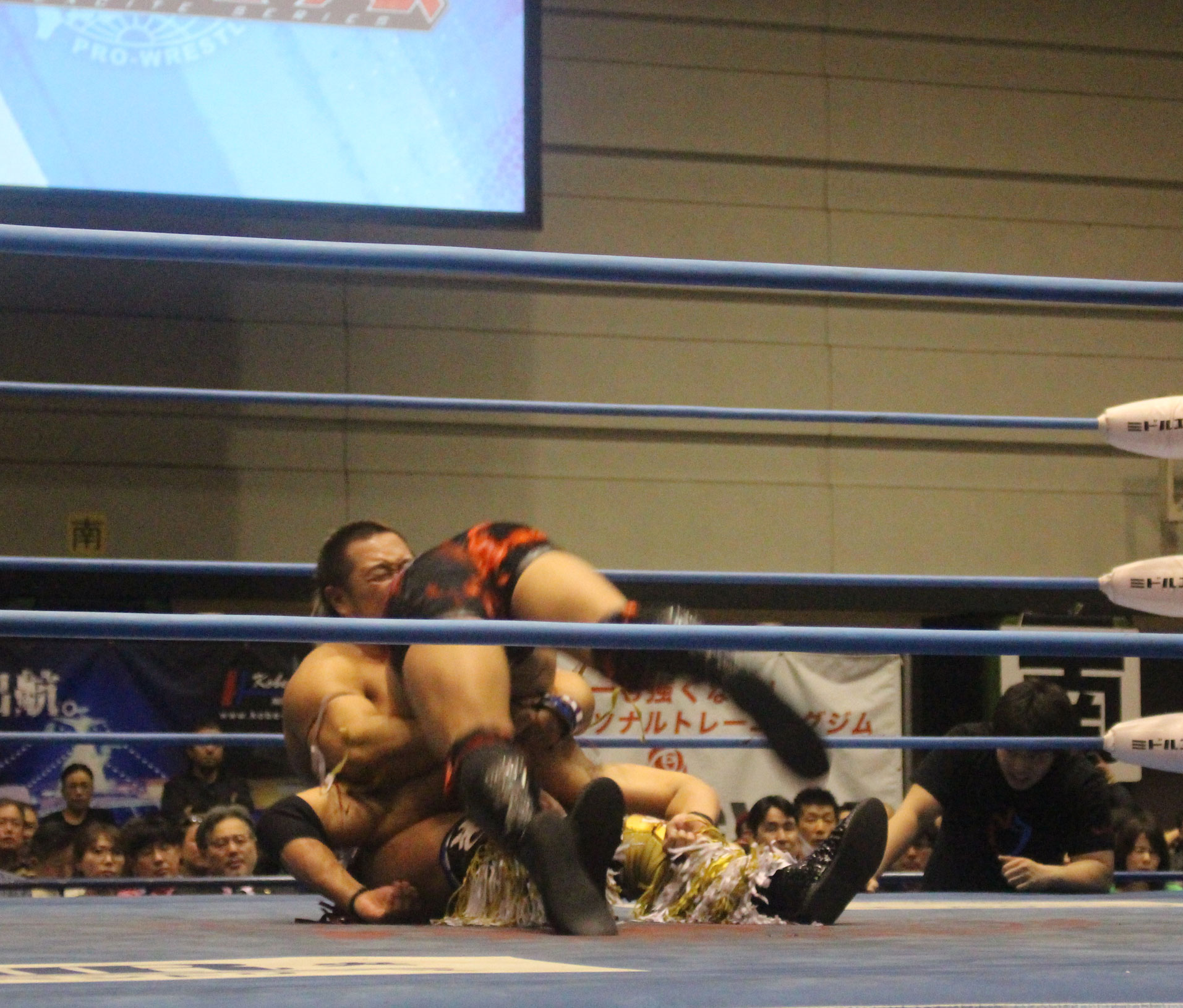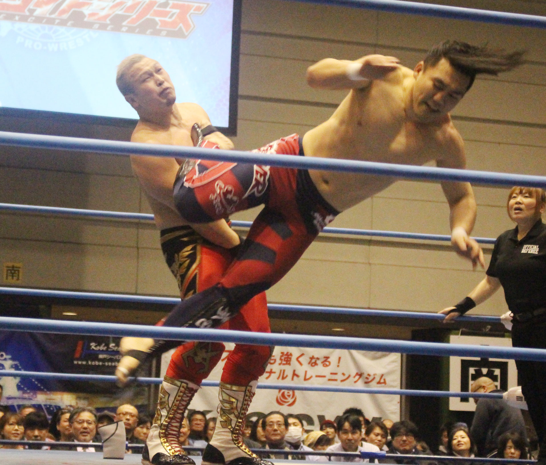 圧倒する近藤はKUBINAGEからランセルセを狙うが、岩本はニーアッパーで迎撃、近藤も左膝攻めで応戦するが、岩本は起死回生の一本背負いからネックスクリュー、エプロンでの大外刈りと猛反撃する。