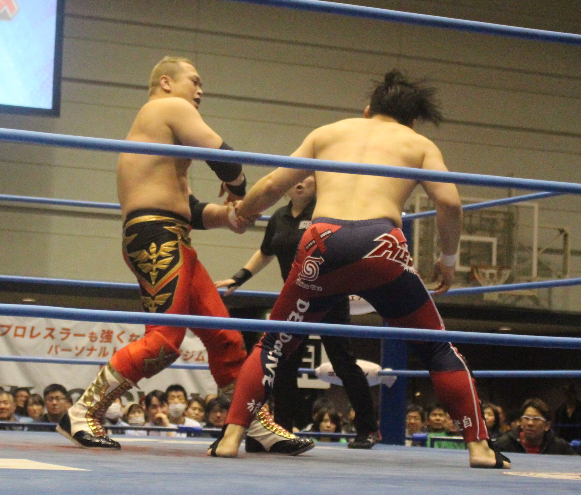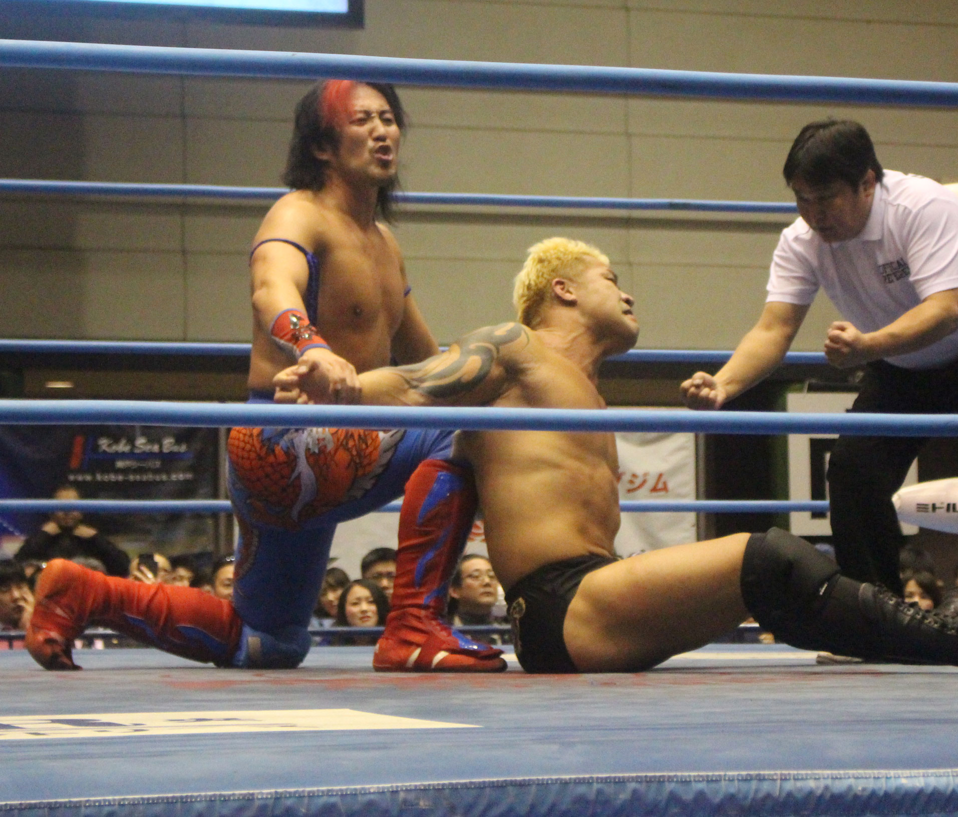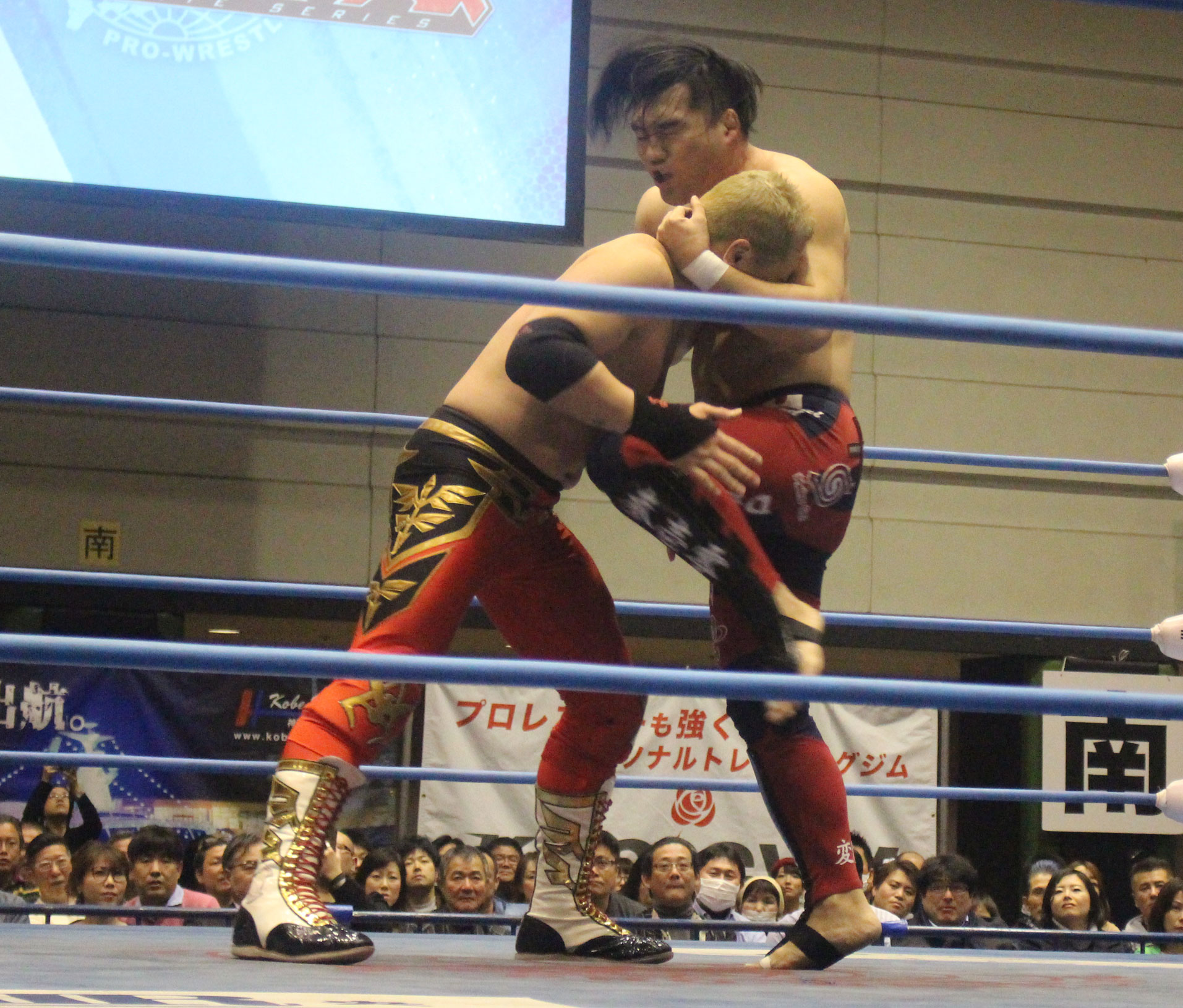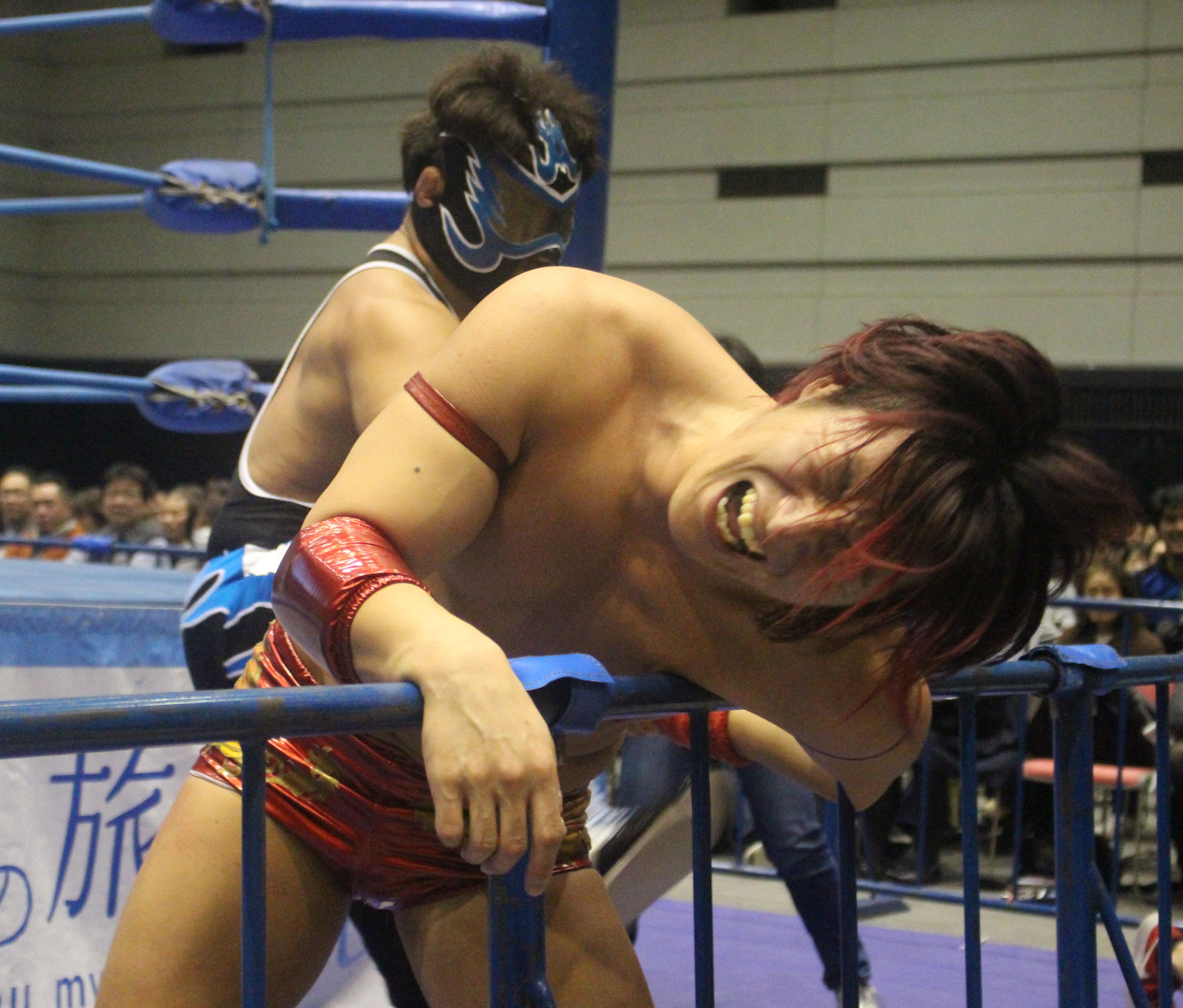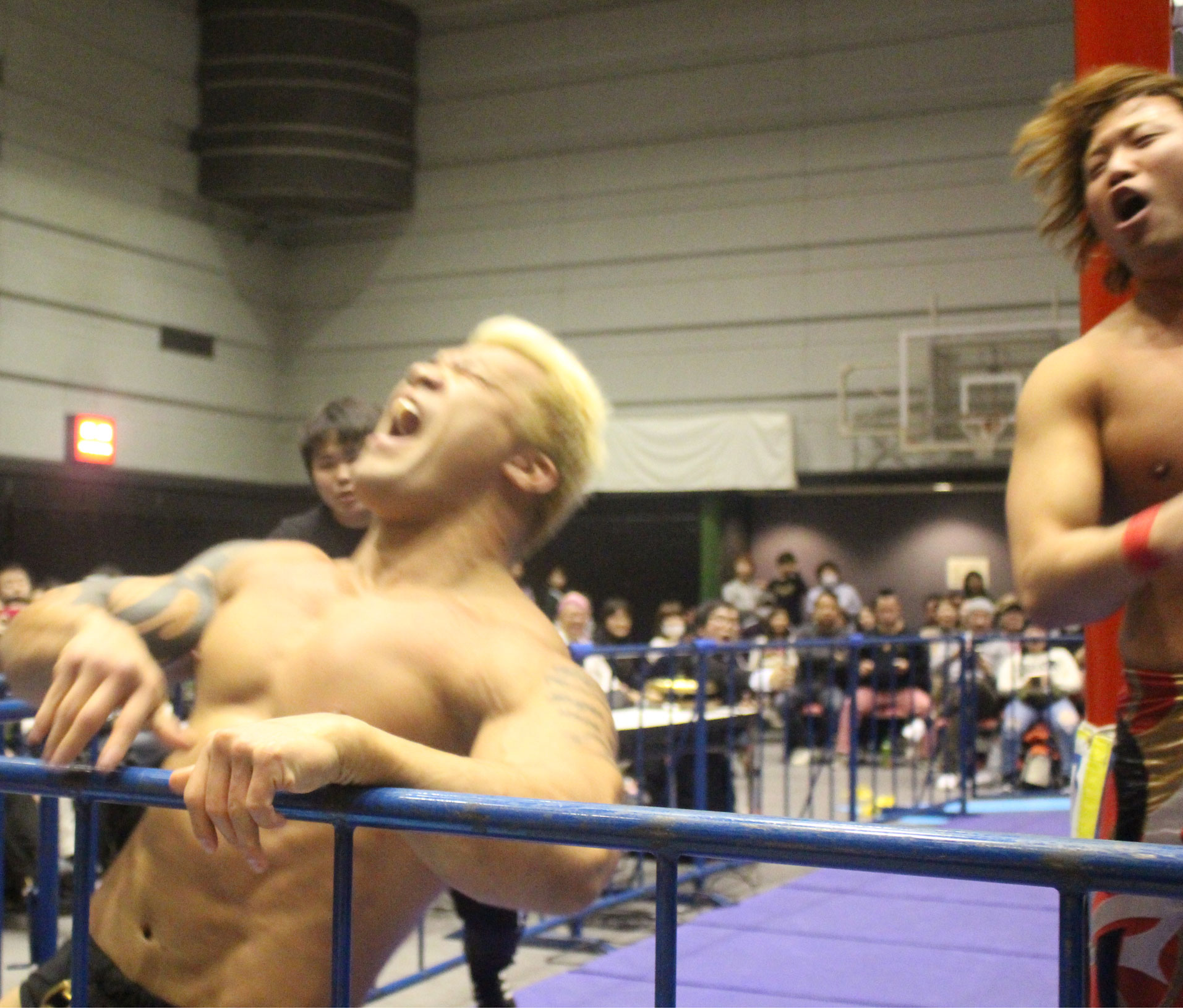 圧倒する近藤はKUBINAGEからランセルセを狙うが、岩本はニーアッパーで迎撃、近藤も左膝攻めで応戦するが、岩本は起死回生の一本背負いからネックスクリュー、エプロンでの大外刈りと猛反撃する。