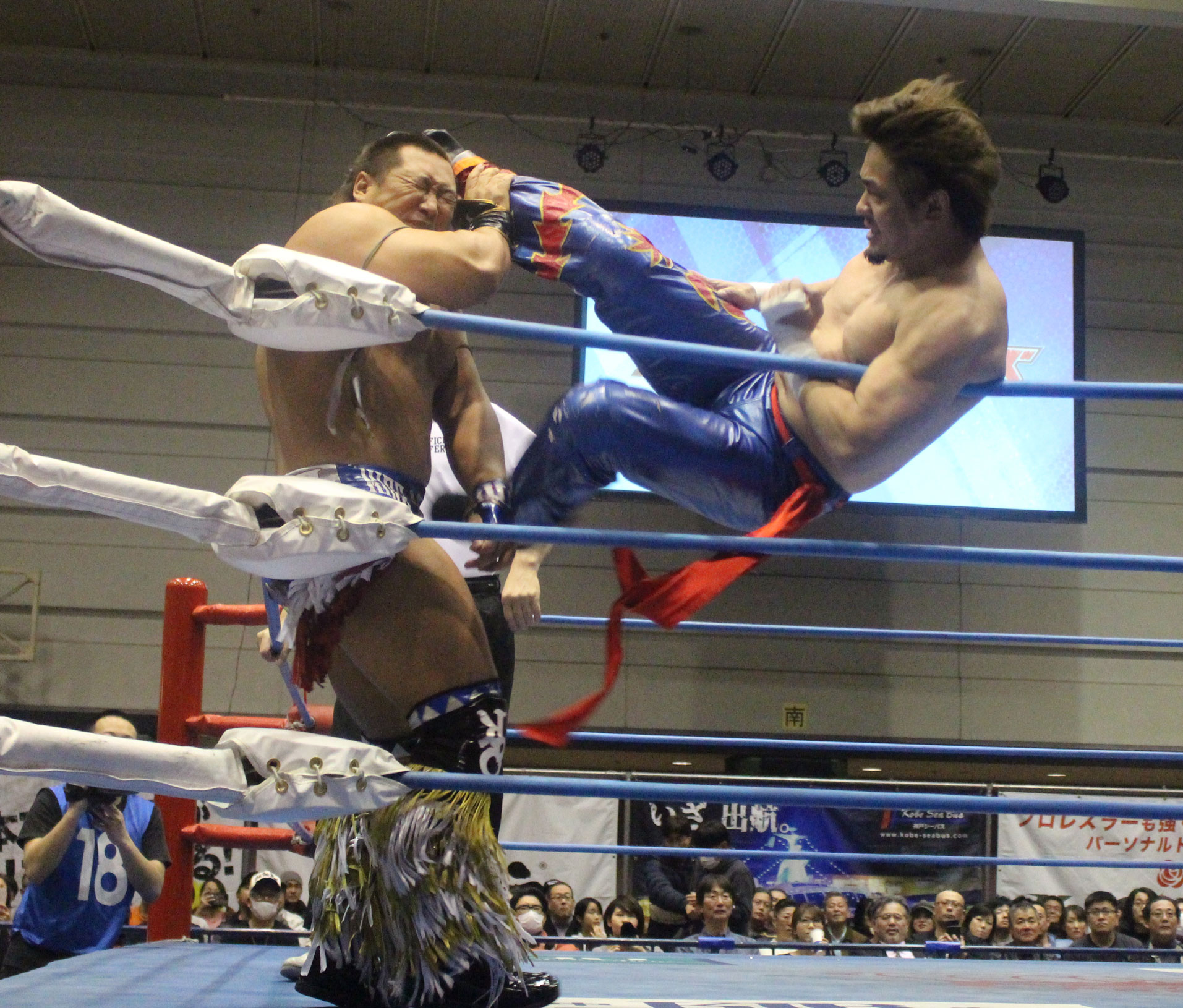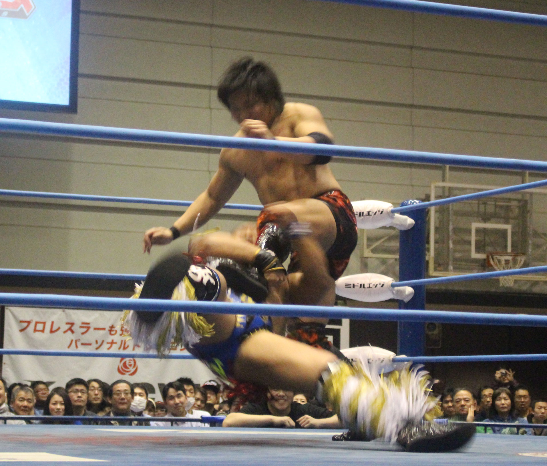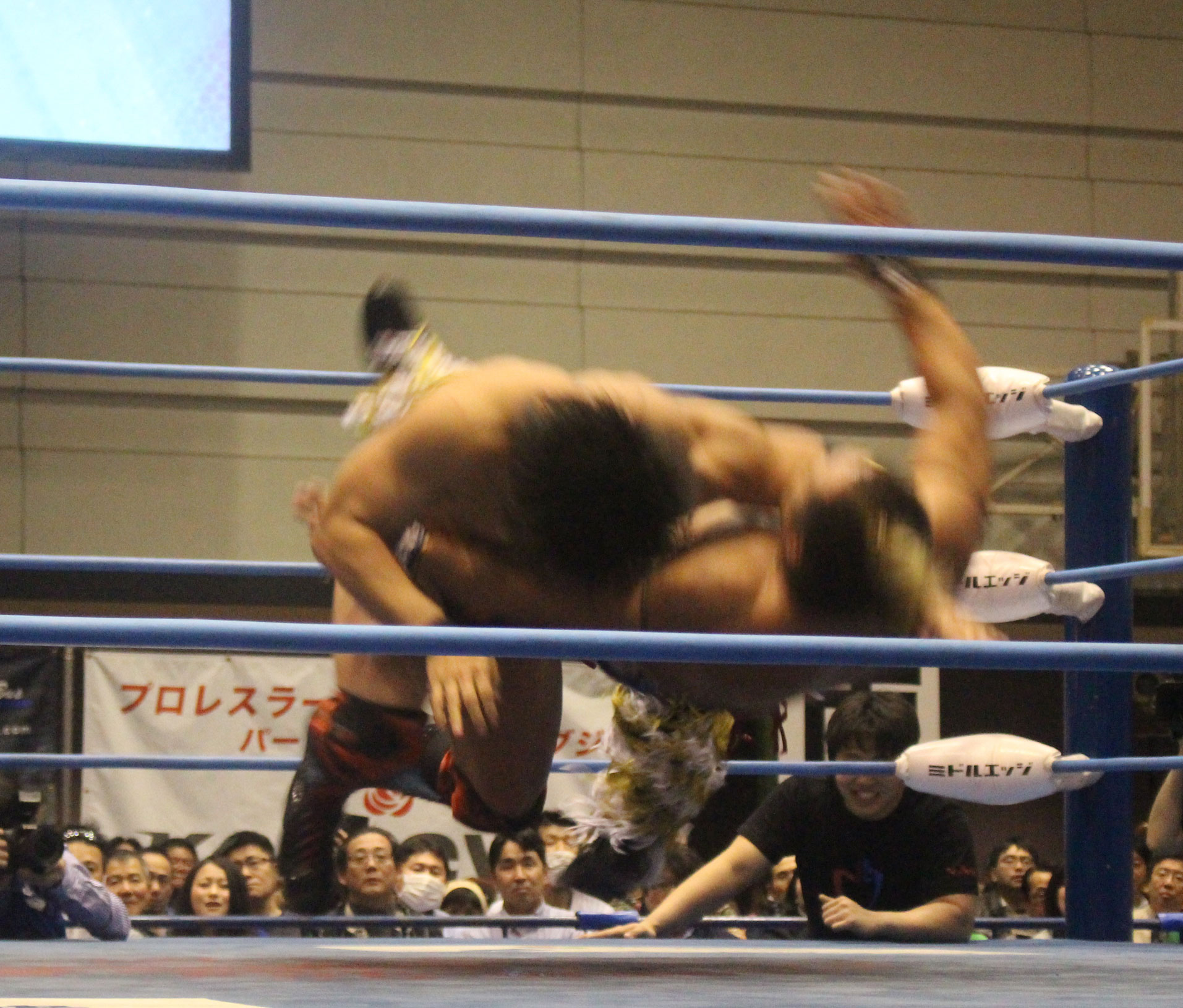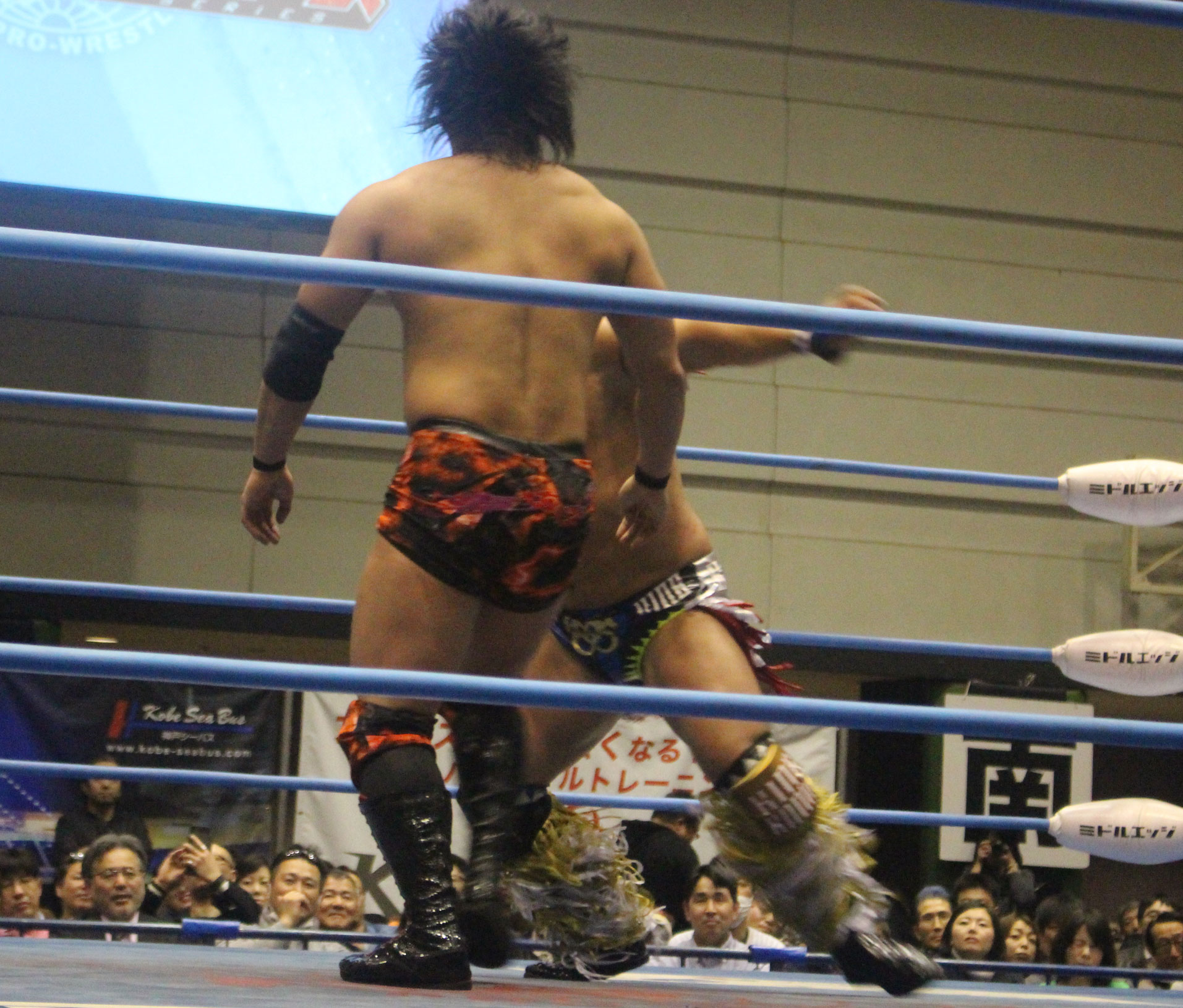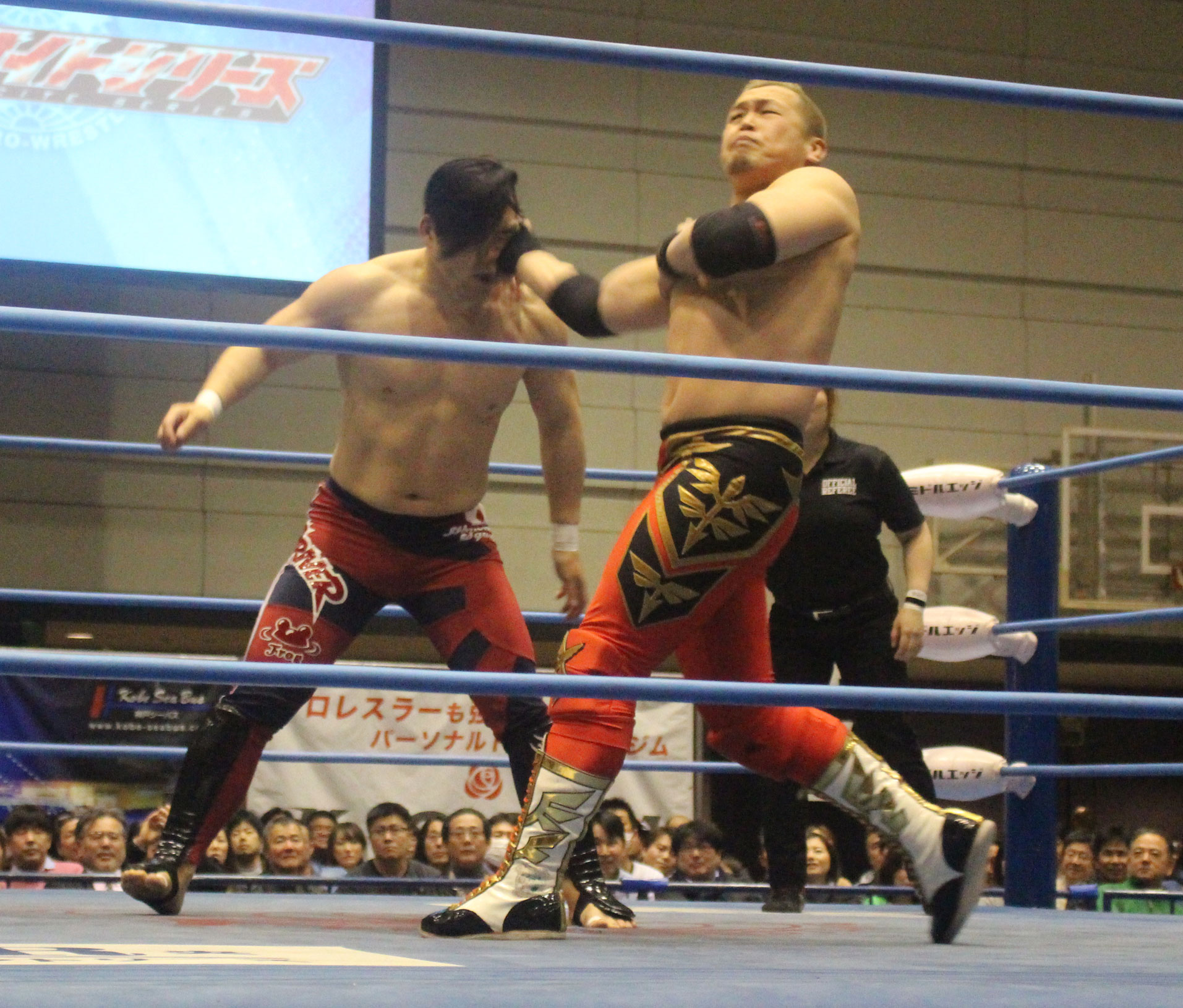 圧倒する近藤はKUBINAGEからランセルセを狙うが、岩本はニーアッパーで迎撃、近藤も左膝攻めで応戦するが、岩本は起死回生の一本背負いからネックスクリュー、エプロンでの大外刈りと猛反撃する。