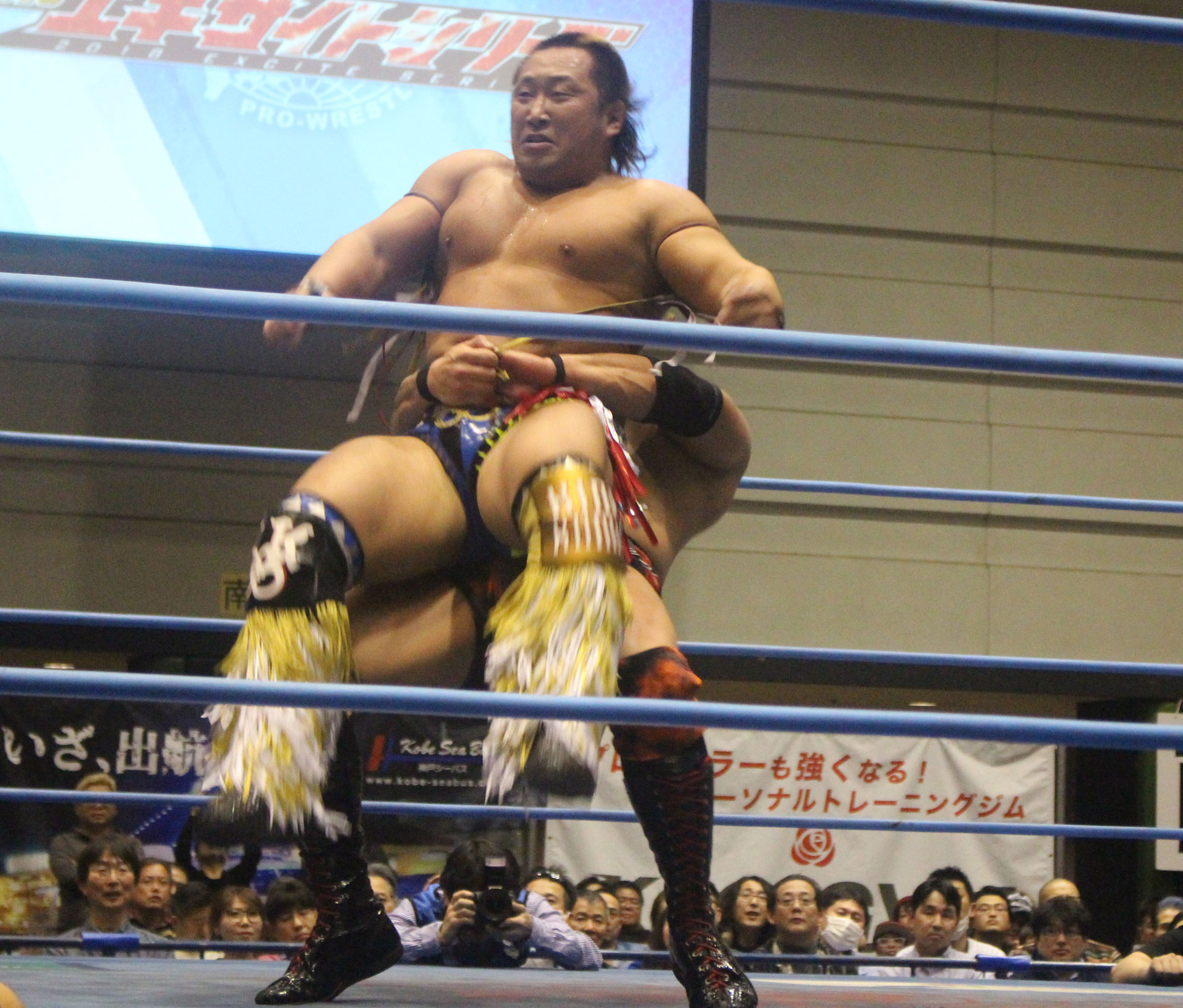 優勝決定戦の内容からしても、岩本は懸命に追い上げたが完敗、ジャベや武藤敬司を彷彿させる低空ドロップキックなどの膝攻めのパターンを見ても、パワーだけでないことを充分に見せつけた。世界タッグ選手権は今回は挑戦者のビッグガンズのホームである大阪ということで、アウウェイモードとなった王者組がゼウスを捕らえ、鉄柵へのスタンガン、鉄柱を使っての首攻め、ヨシタツが顔面ウォッシュとゼウスの首攻めを展開、ヨシタツがコンプリートショットからのヨシタツロックで捕獲してゼウスのスタミナを奪いにかかる。