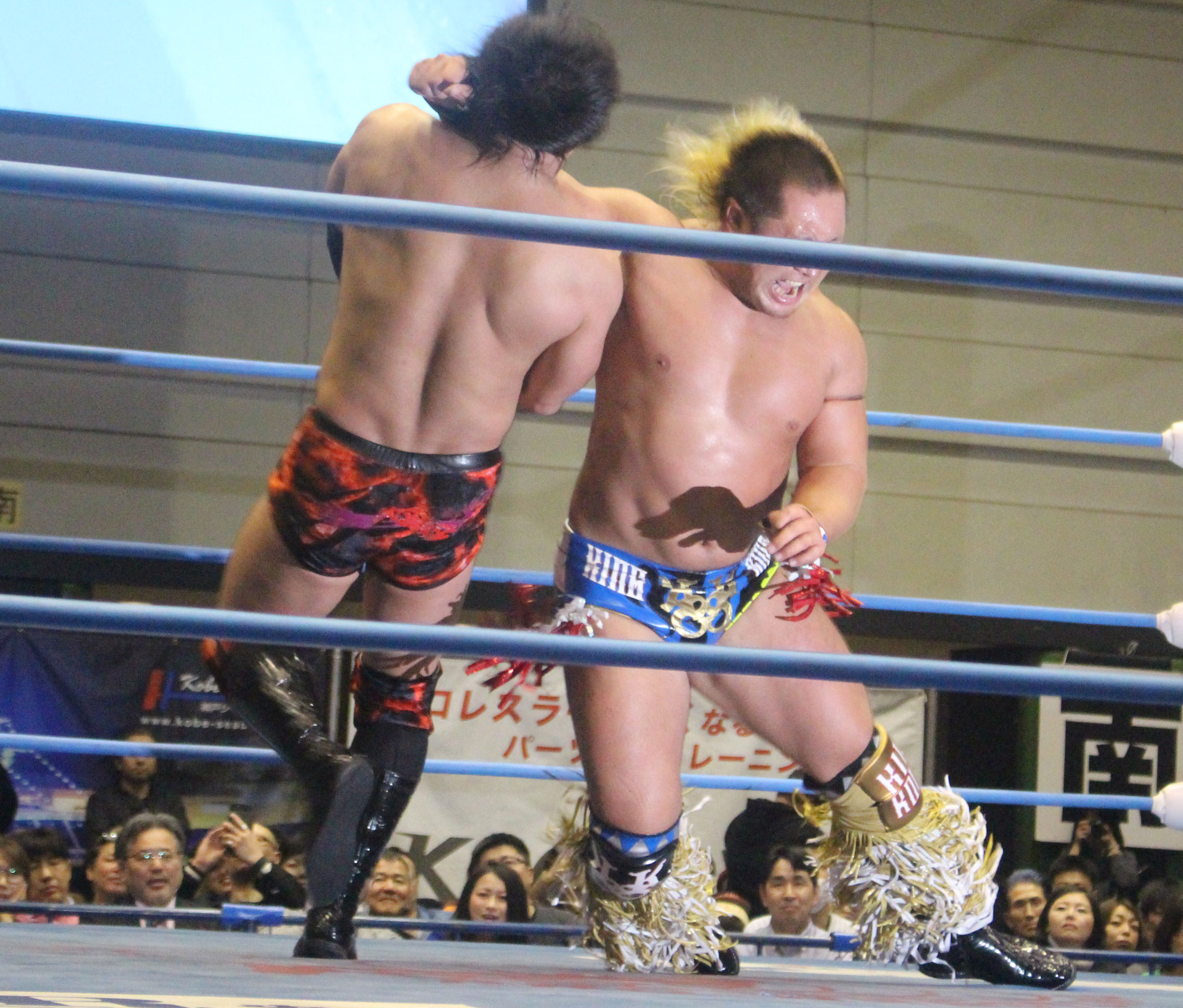 リングに戻った岩本は勝負を狙って孤高の芸術を狙うが、阻止した近藤がローキック、低空ドロップキックと膝攻め、再度ゴリラクラッチ、ランセルセからオーバードーズと追い詰めにかかり、キングコングラリアットで勝負に出るが、岩本はエルボーで迎撃し、延髄斬りからニーアッパー、またキングコングラリアットをかわしてニーアッパーからジャーマン、フルネルソンスープレックスからの大外刈りと猛ラッシュをかける。