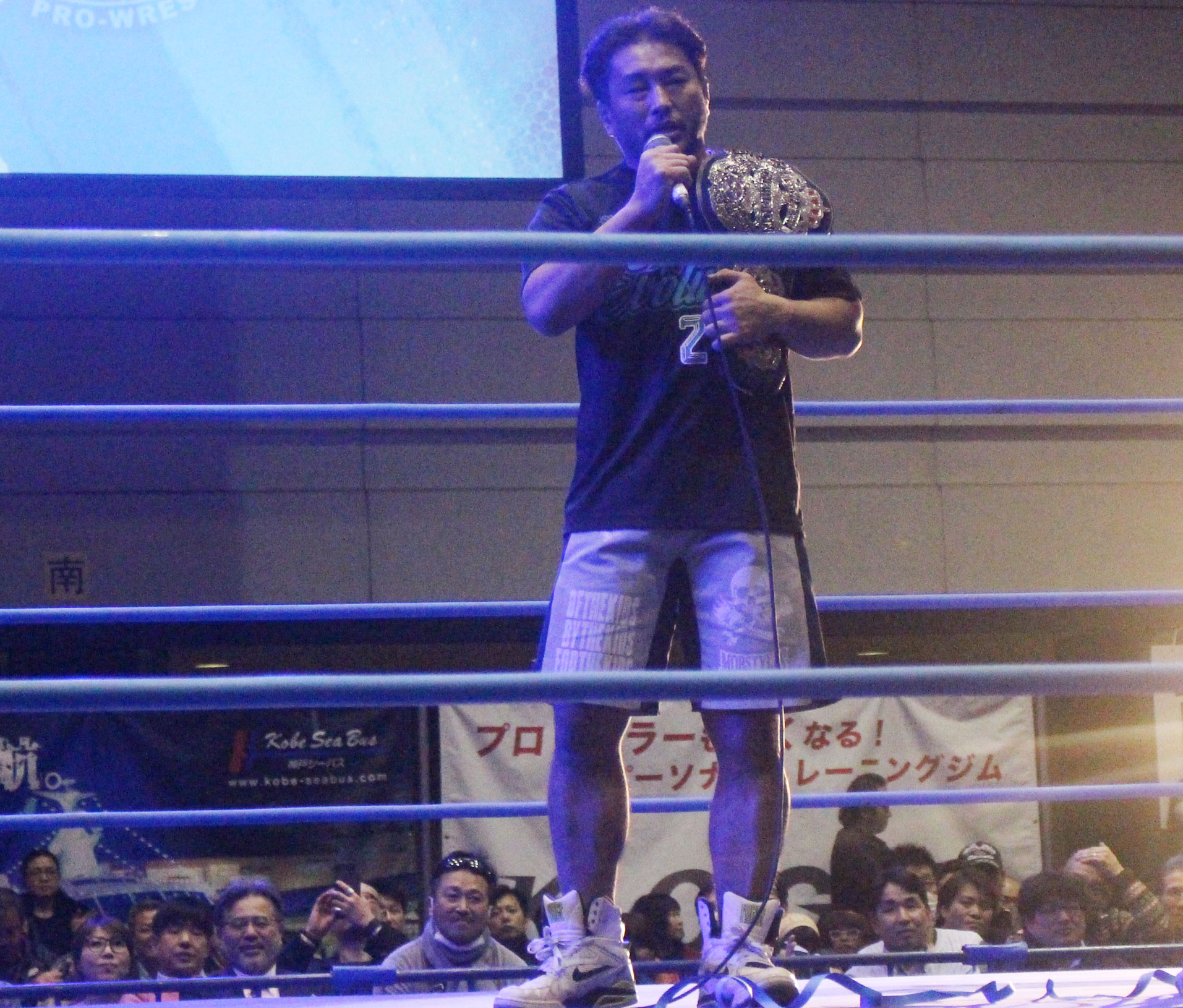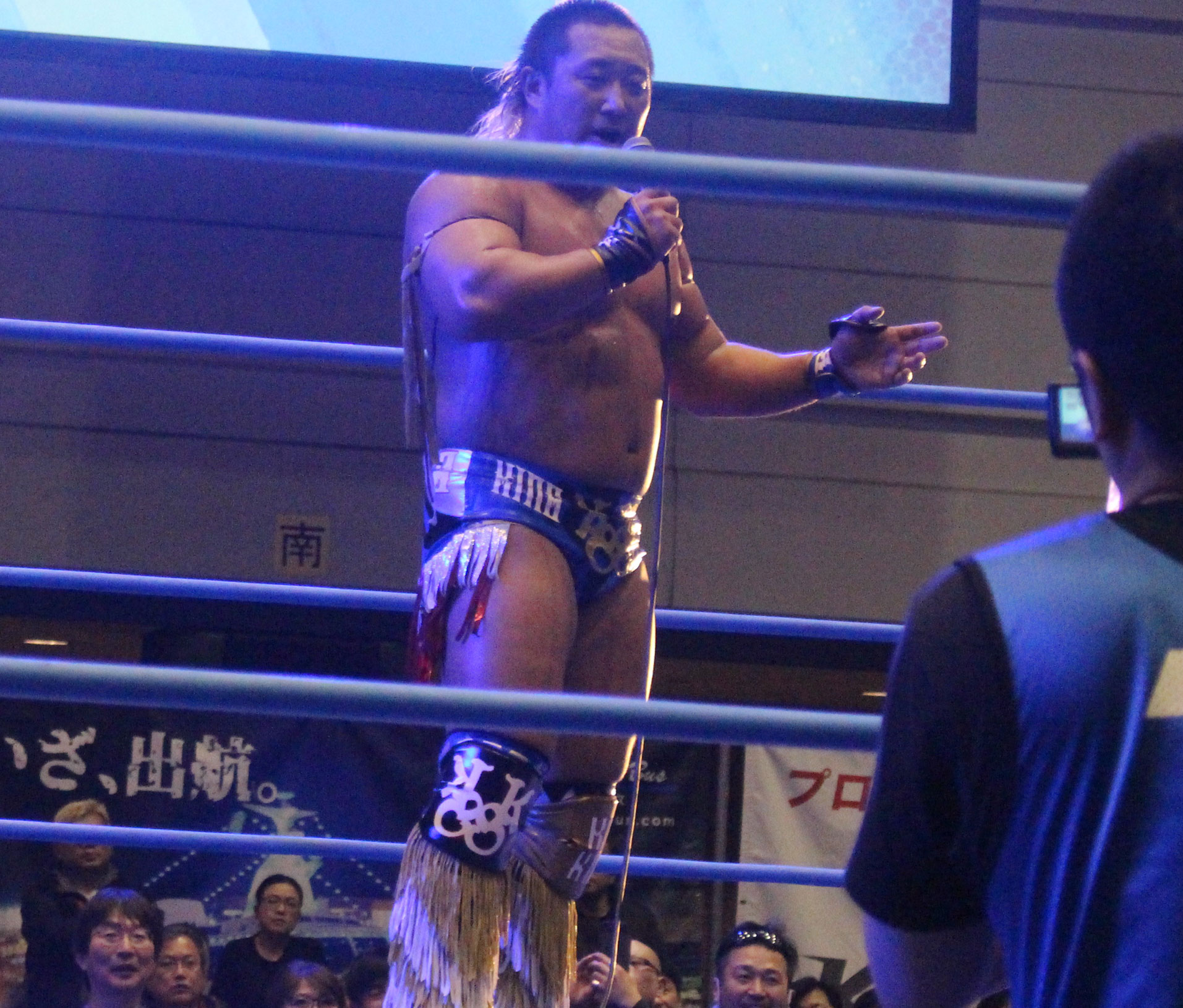 ※キングコングラリアット(試合終了後、優勝トロフィーを授与された近藤はマイクを持つ)