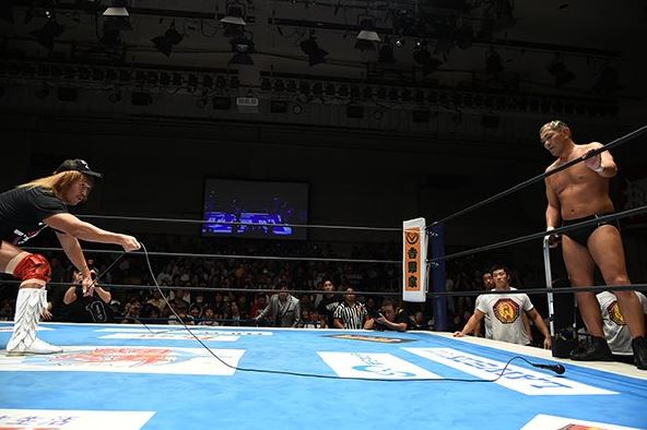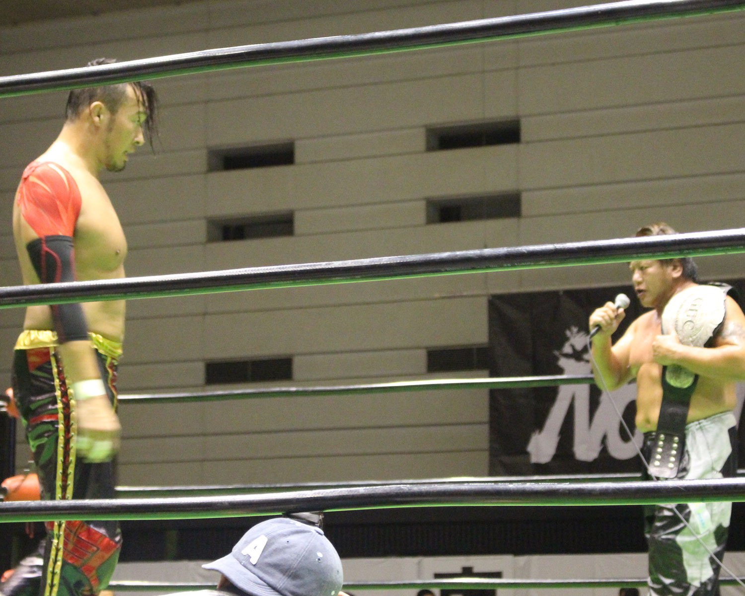 丸藤「そうだな、悔しいけど、憧れか。一番上の存在に行っちまったからな。やってて、正直そう思うよ。今まで言わなかったけど。世界を股にかけて試合をしているあいつは羨ましいし。だけど、だからこそ、俺は彼がいないこのステージでしっかり試合をしていこうと思うし。ここに残って、今日、みんな第1試合から凄くいい試合をしてくれて、お客さんも満足してくれたと思うんで。また、この緑のマットにしっかり足を付けて、根を張って、若い人間の壁になって。しっかり戦いたいなと思います」