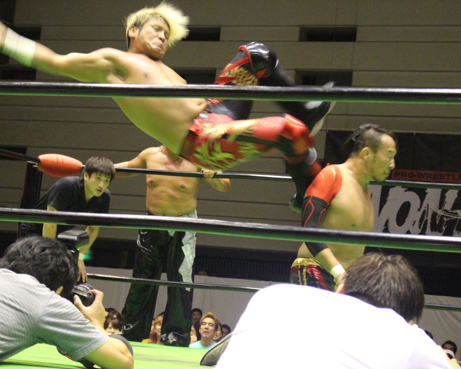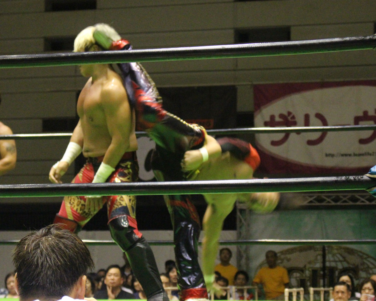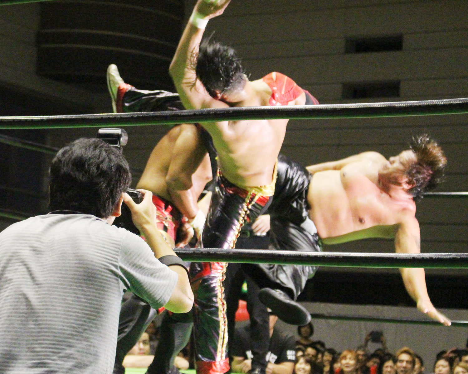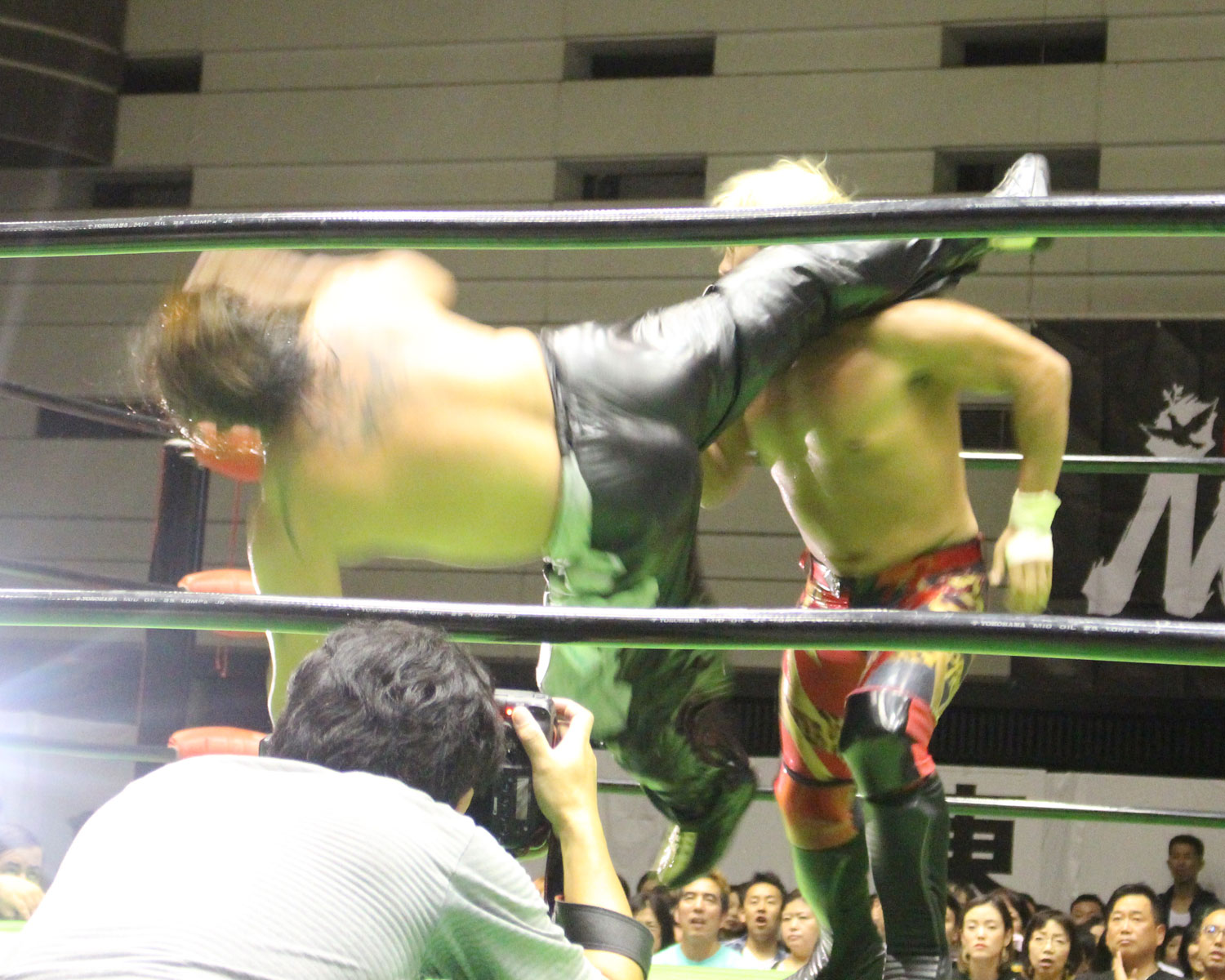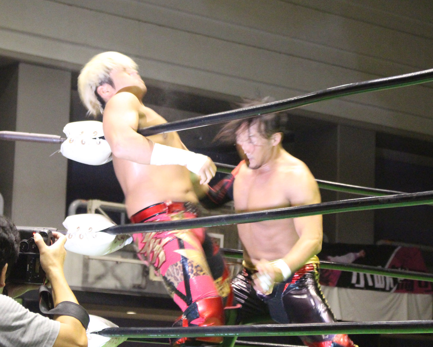 場外戦で丸藤がイタミを鉄柵外へ出すと、スーパーケブラータを狙うが、イタミが阻止し、リングに戻ってダイビングラリアットからステップキックも、丸藤も同じ技でやり返し、イタミもステップキックからライガーボム狙いは、着地した丸藤がカウンターでトラースキックを浴びせる。