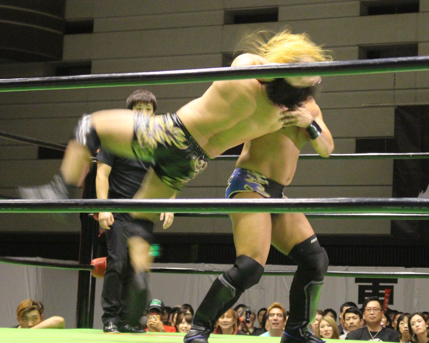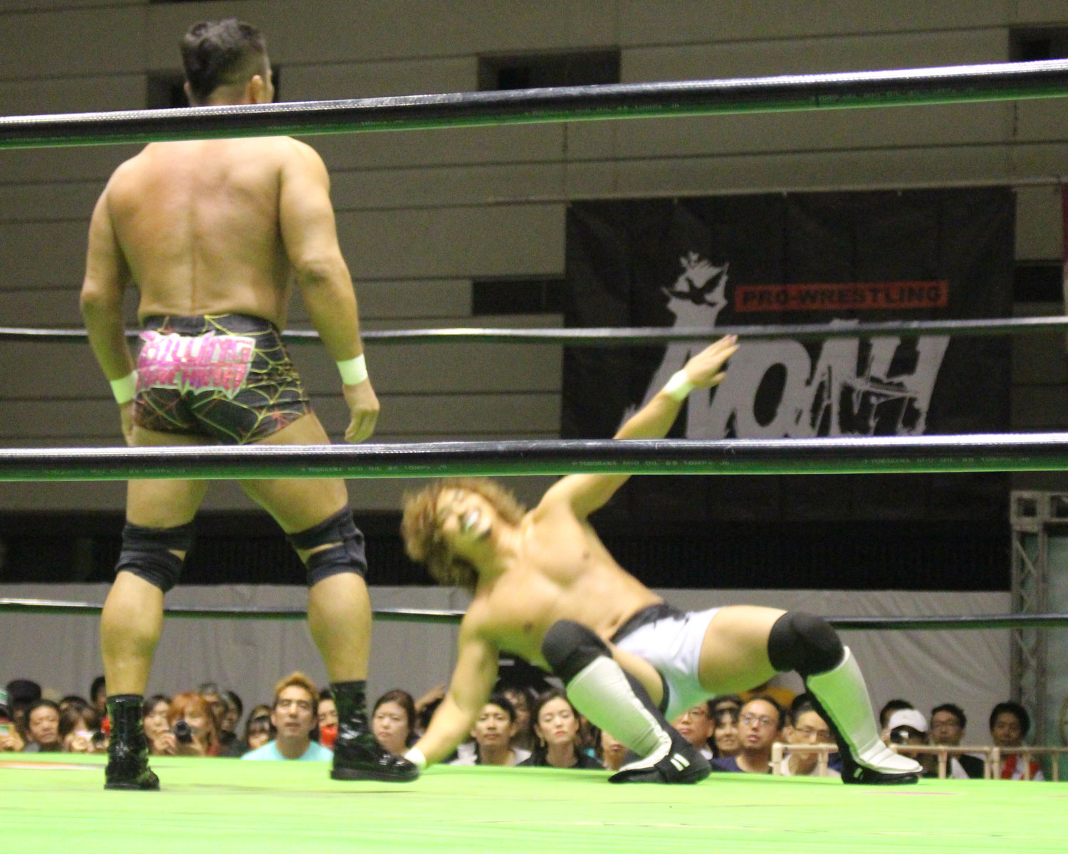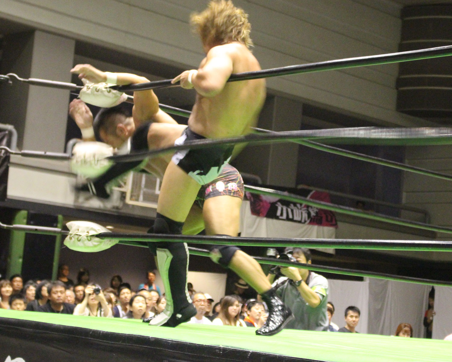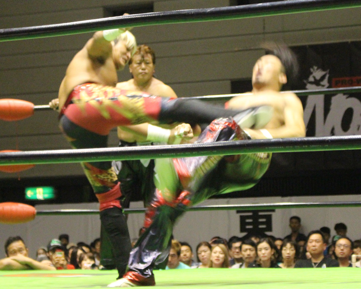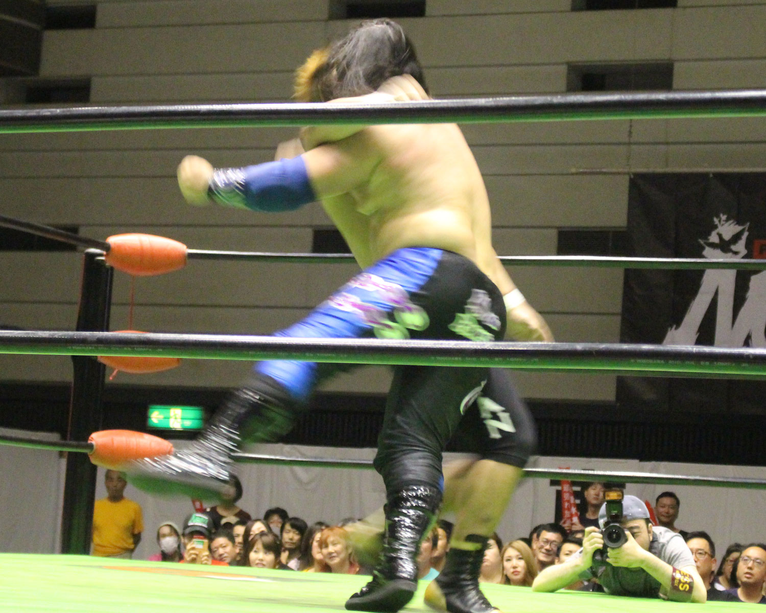 場外戦で丸藤がイタミを鉄柵外へ出すと、スーパーケブラータを狙うが、イタミが阻止し、リングに戻ってダイビングラリアットからステップキックも、丸藤も同じ技でやり返し、イタミもステップキックからライガーボム狙いは、着地した丸藤がカウンターでトラースキックを浴びせる。