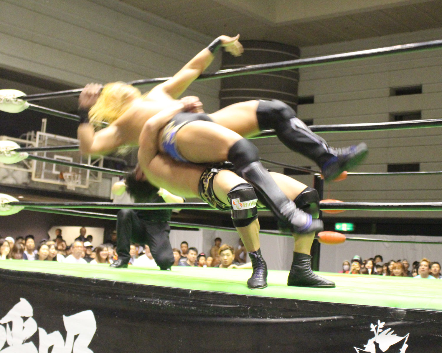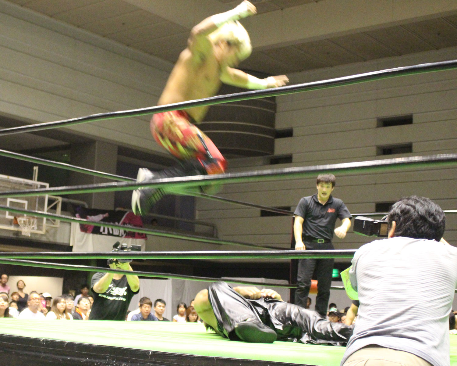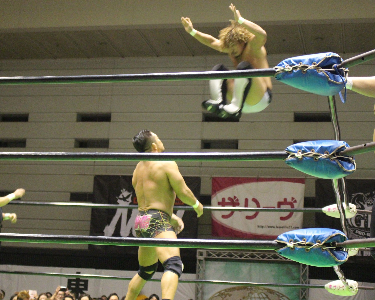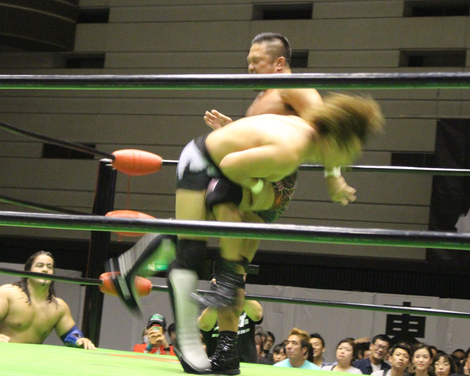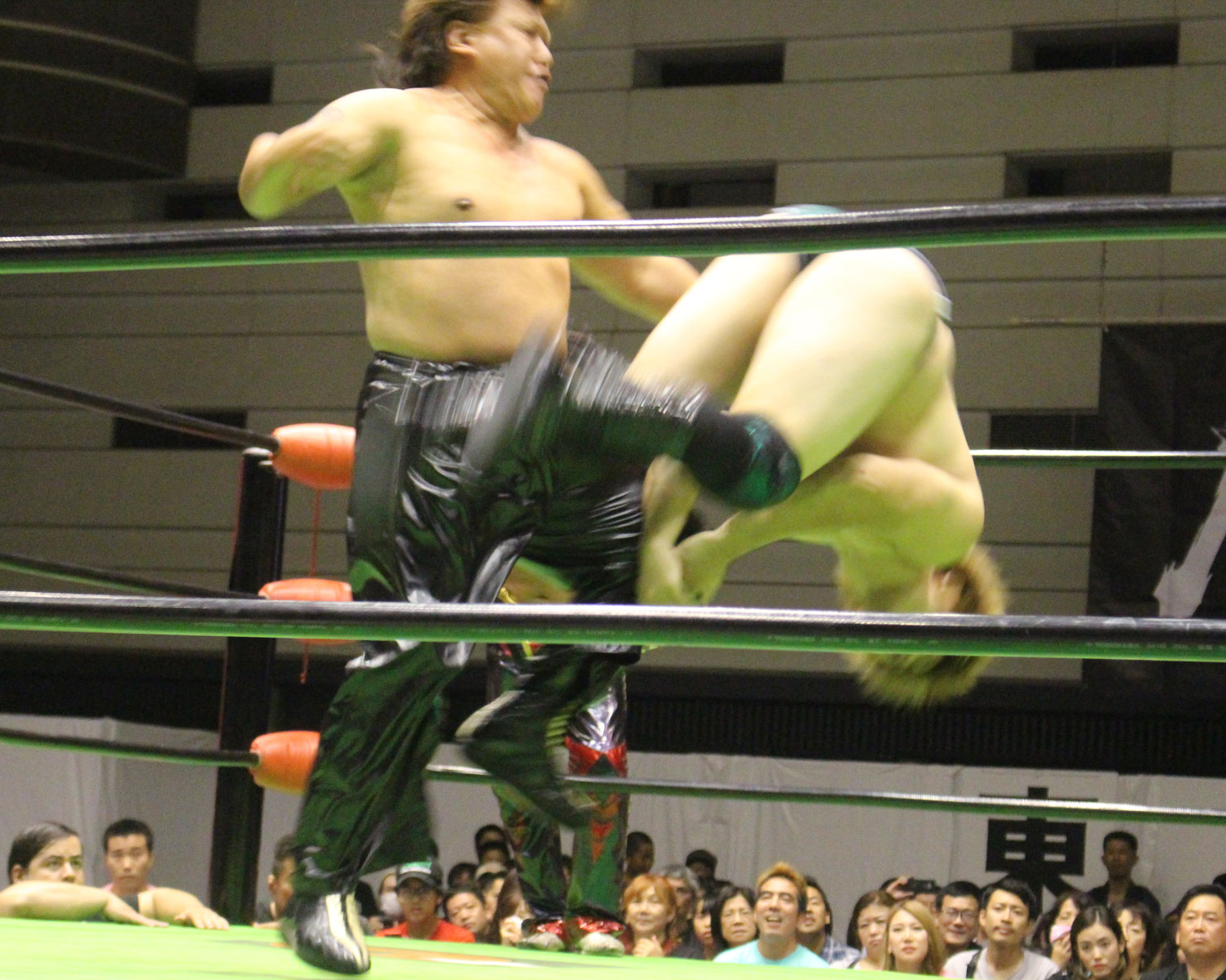 場外戦で丸藤がイタミを鉄柵外へ出すと、スーパーケブラータを狙うが、イタミが阻止し、リングに戻ってダイビングラリアットからステップキックも、丸藤も同じ技でやり返し、イタミもステップキックからライガーボム狙いは、着地した丸藤がカウンターでトラースキックを浴びせる。