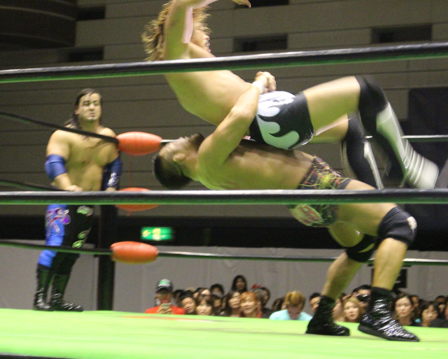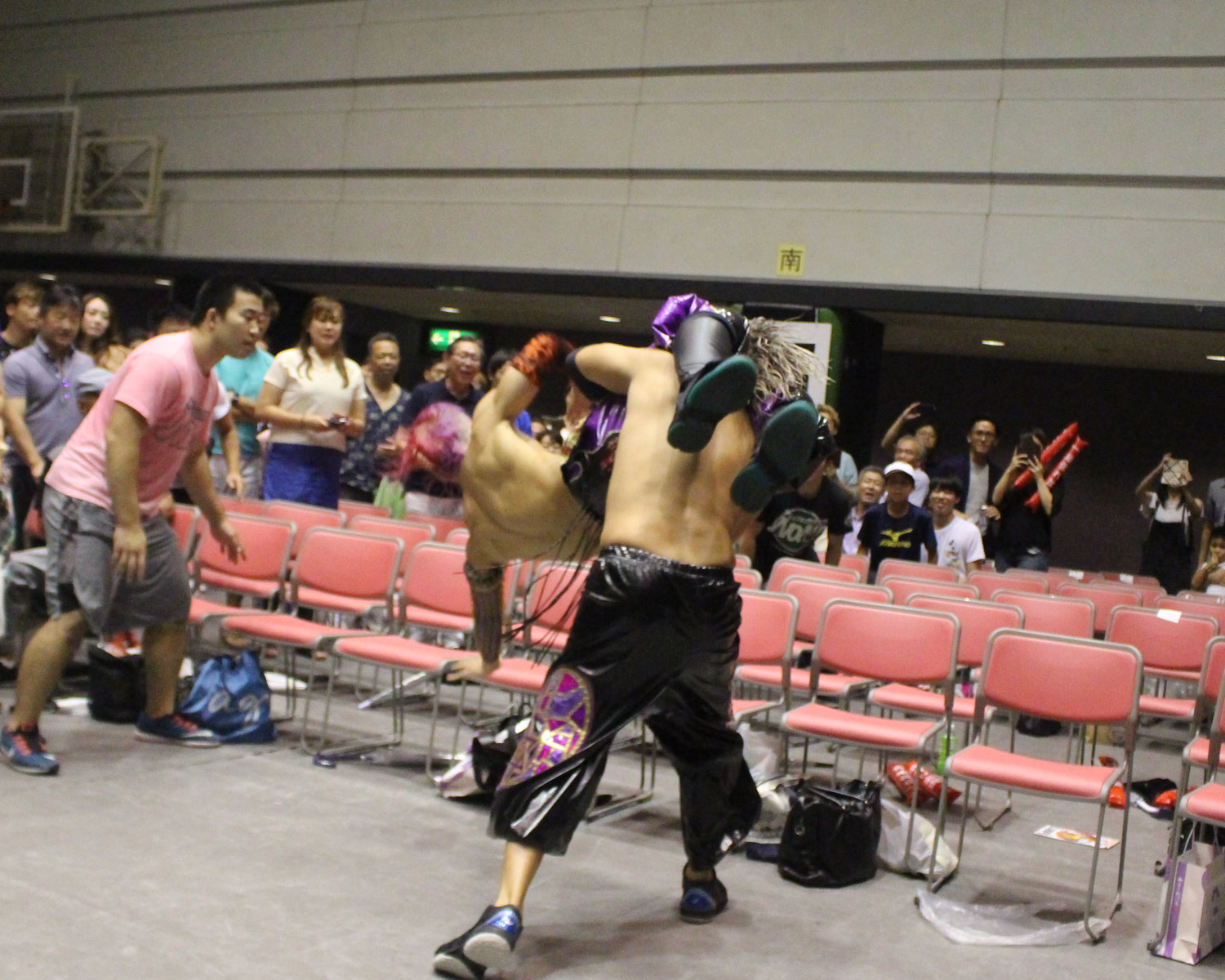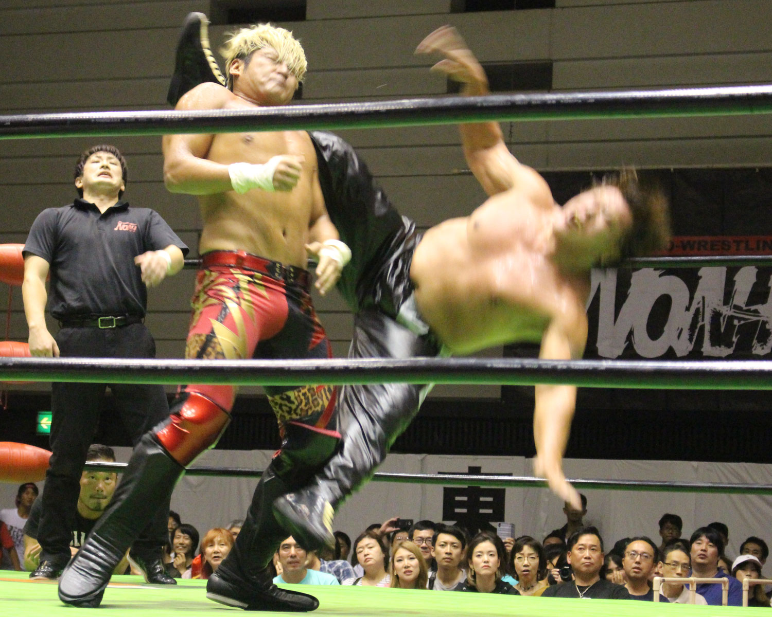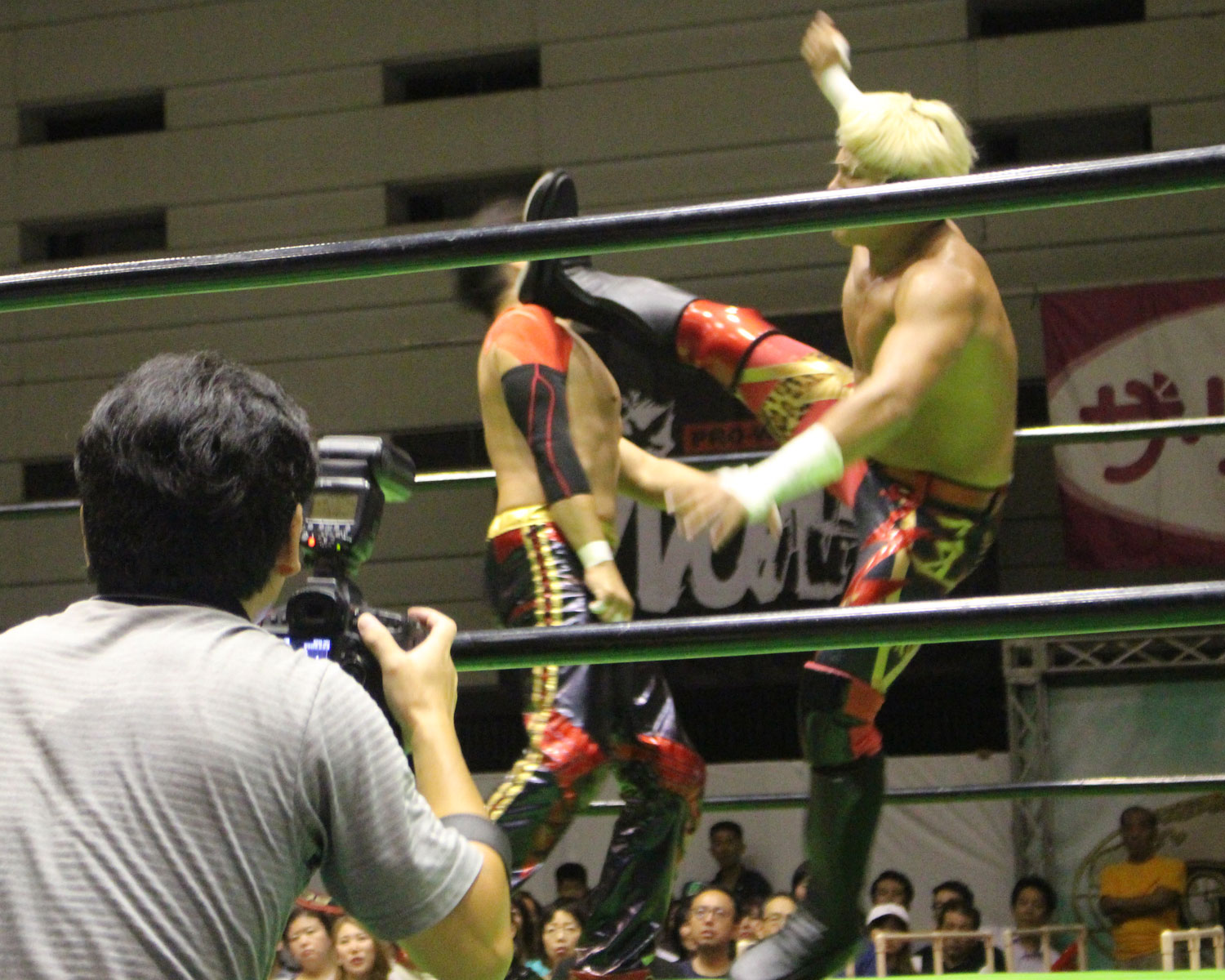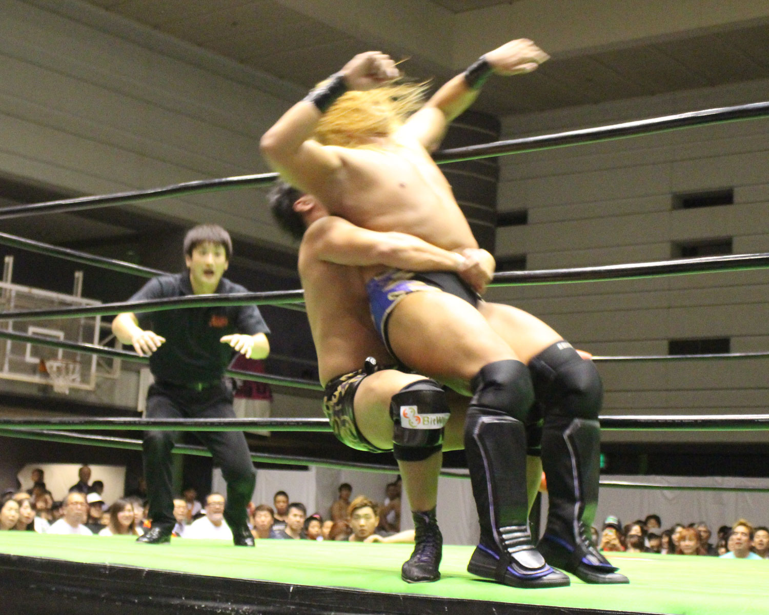 場外戦で丸藤がイタミを鉄柵外へ出すと、スーパーケブラータを狙うが、イタミが阻止し、リングに戻ってダイビングラリアットからステップキックも、丸藤も同じ技でやり返し、イタミもステップキックからライガーボム狙いは、着地した丸藤がカウンターでトラースキックを浴びせる。