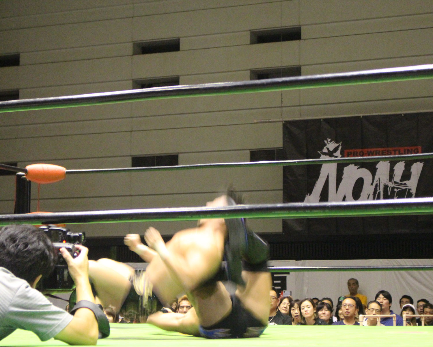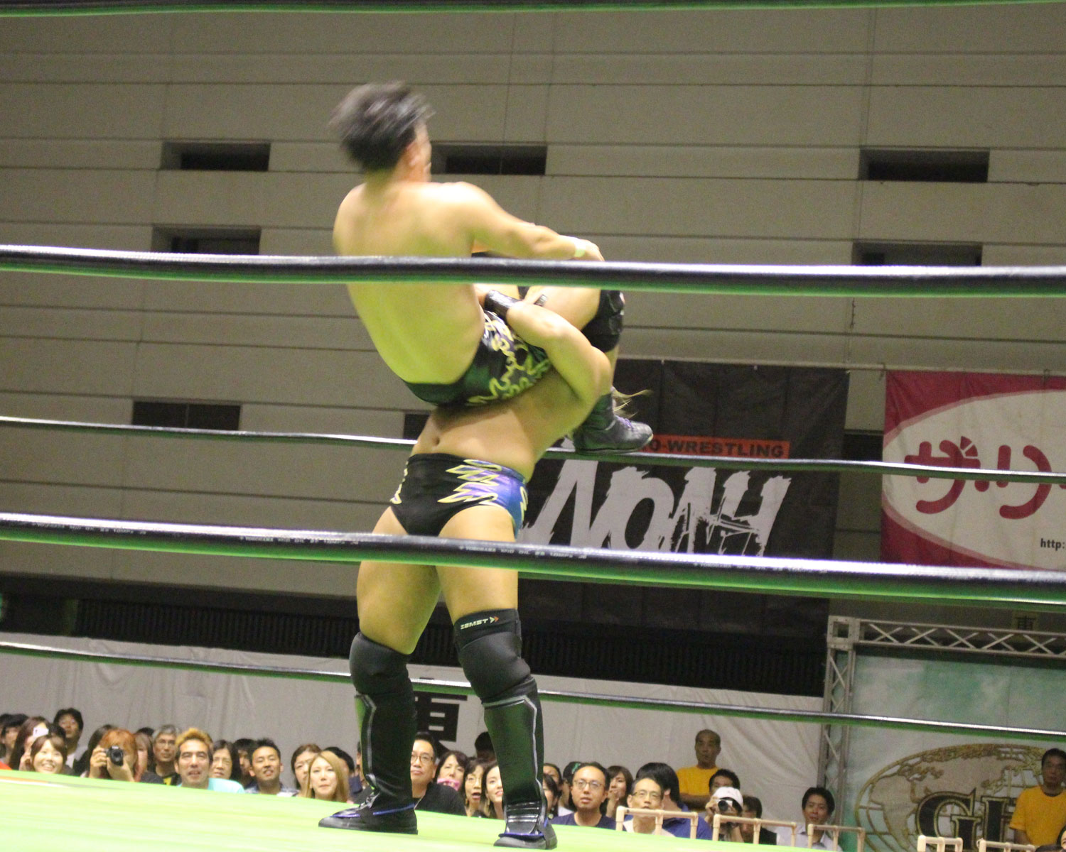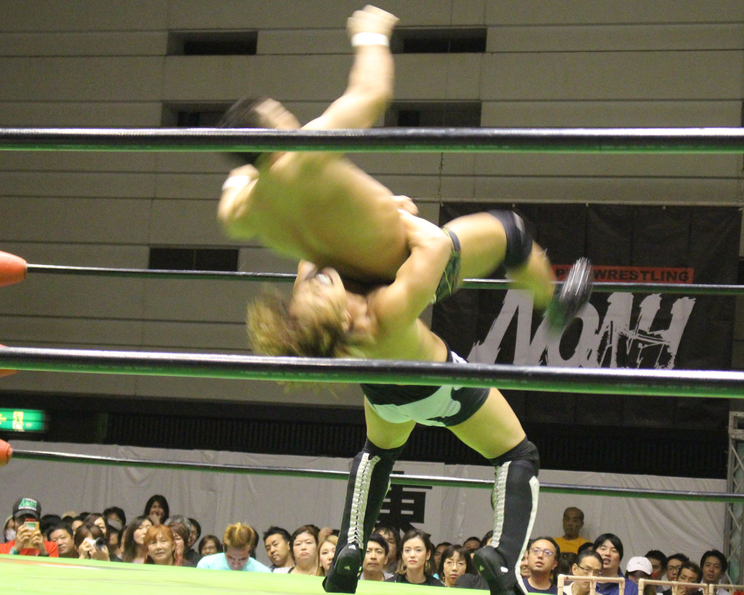 しかし中嶋に顎を蹴り上げらると、場外に逃れた杉浦をフェンスなどで痛めつけ、リング内では北宮がストームを仕留めにかかるが、サイトースープレックスを体を浴びせて潰したストームが低空クロスボディーからウデラリアットで逆転勝利も、中嶋は構わず杉浦を痛めつけて高笑いとなった。大阪大会は英雄伝目当てのファンも多かったが、NOAHの試合でもノリが良く大いに沸いた。両国大会からNOAHも良いムードで来ているだけに、持続させるだけでなく発展させて欲しい。