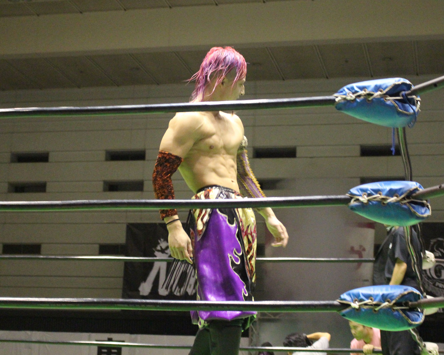 丸藤の側転からのドロップキックに対して、清宮もドロップキックで応戦、ジャーマンで投げるが、タイガースープレックス狙いは丸藤が堪え、清宮の串刺し狙いをかわした丸藤が串刺し虎王を炸裂させて、両者は交代する。