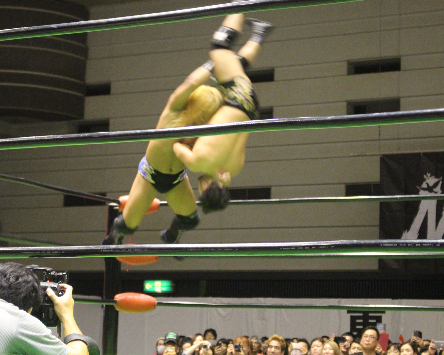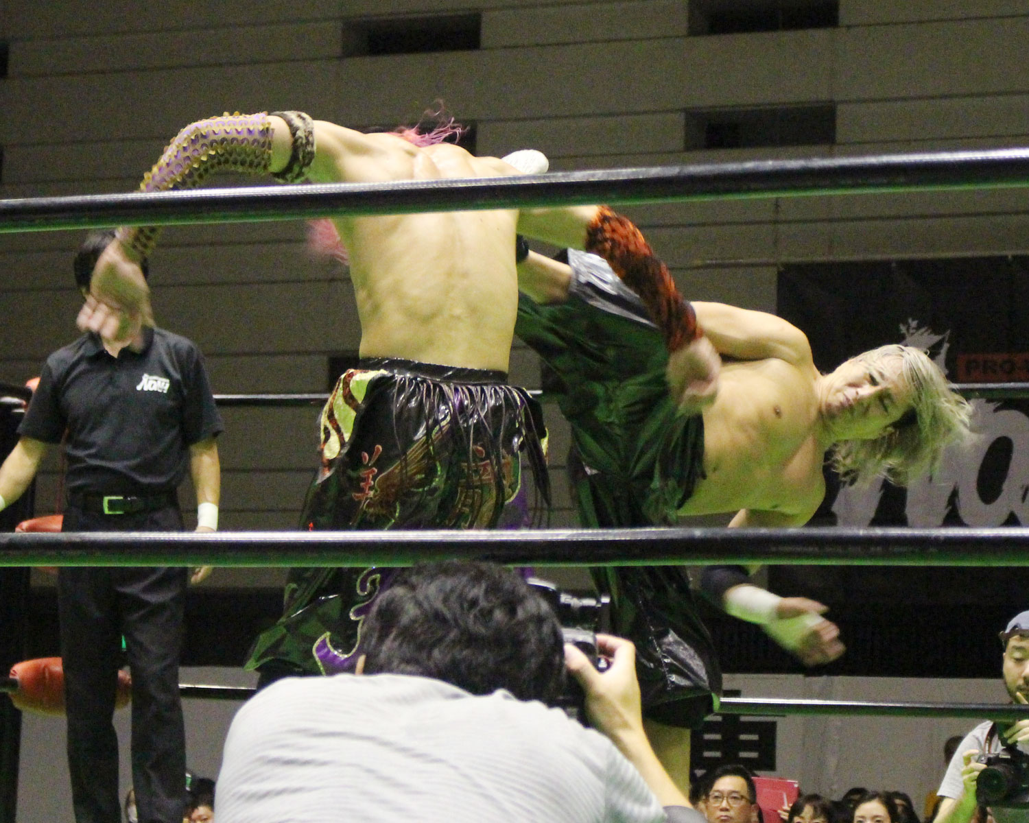 これでリードを奪ったYO-HEYは再度の場外戦ではノータッチトペコンも披露、HAYATAのハンドスプリングエルボーもドロップキックで迎撃してリードを奪うが、勝負を狙った顔面GはHAYATAが叩きつけ、すざましい読み合いを繰り広げるも、HAYATAがスーパーキックを炸裂させると、ツイスト・オブ・フェイトを決め、ムーンサルトプレスで勝負を狙うが、かわされて自爆となってしまう。