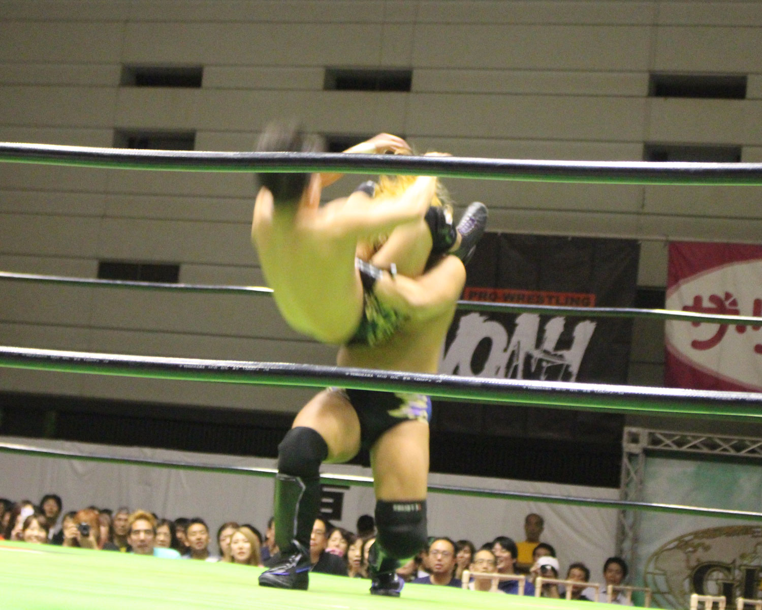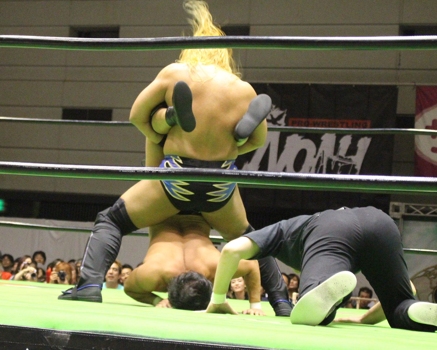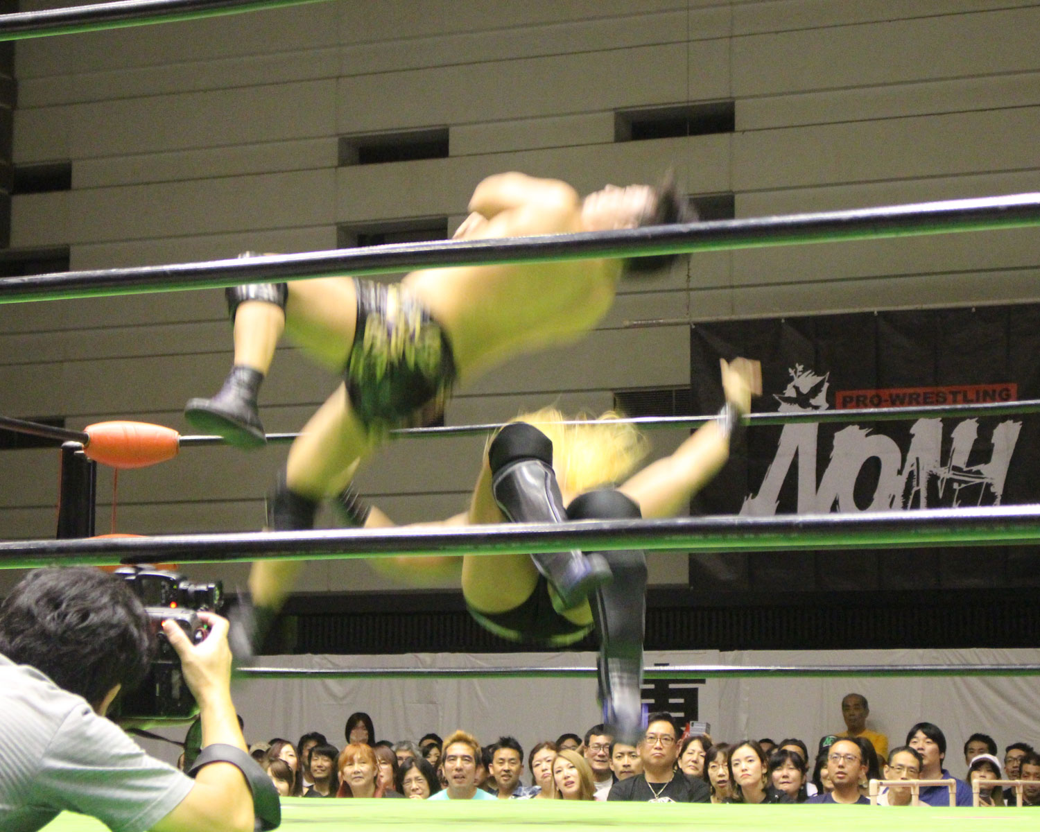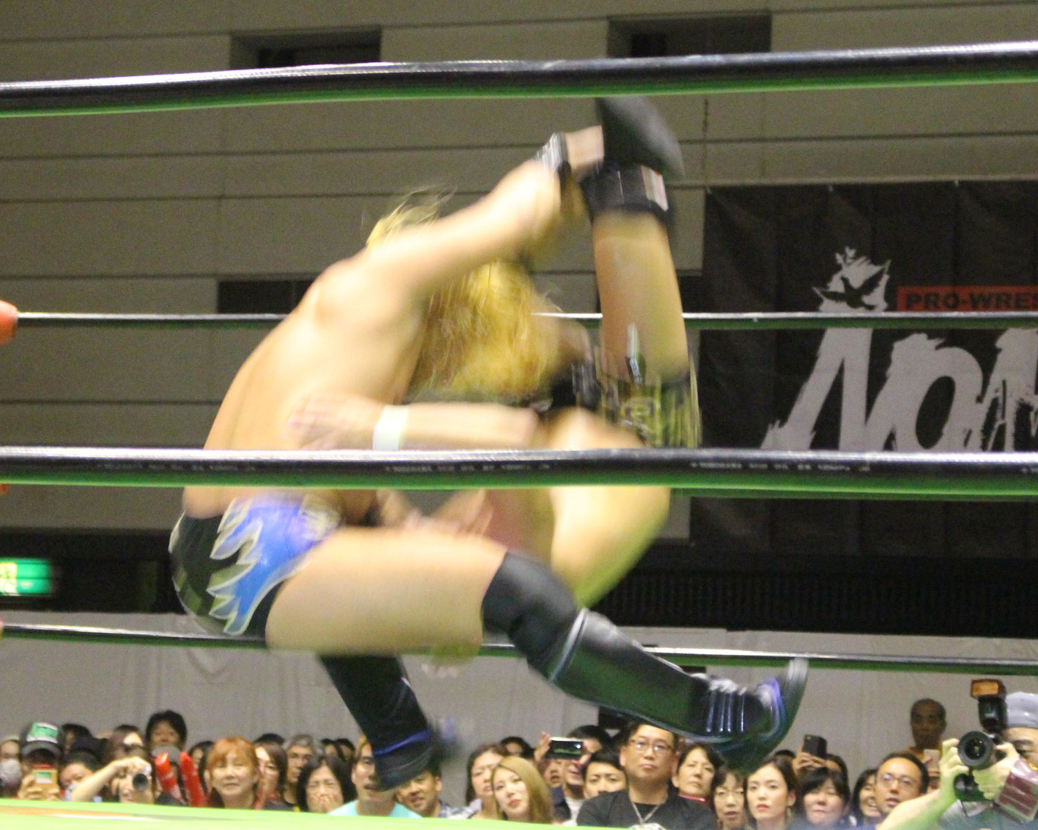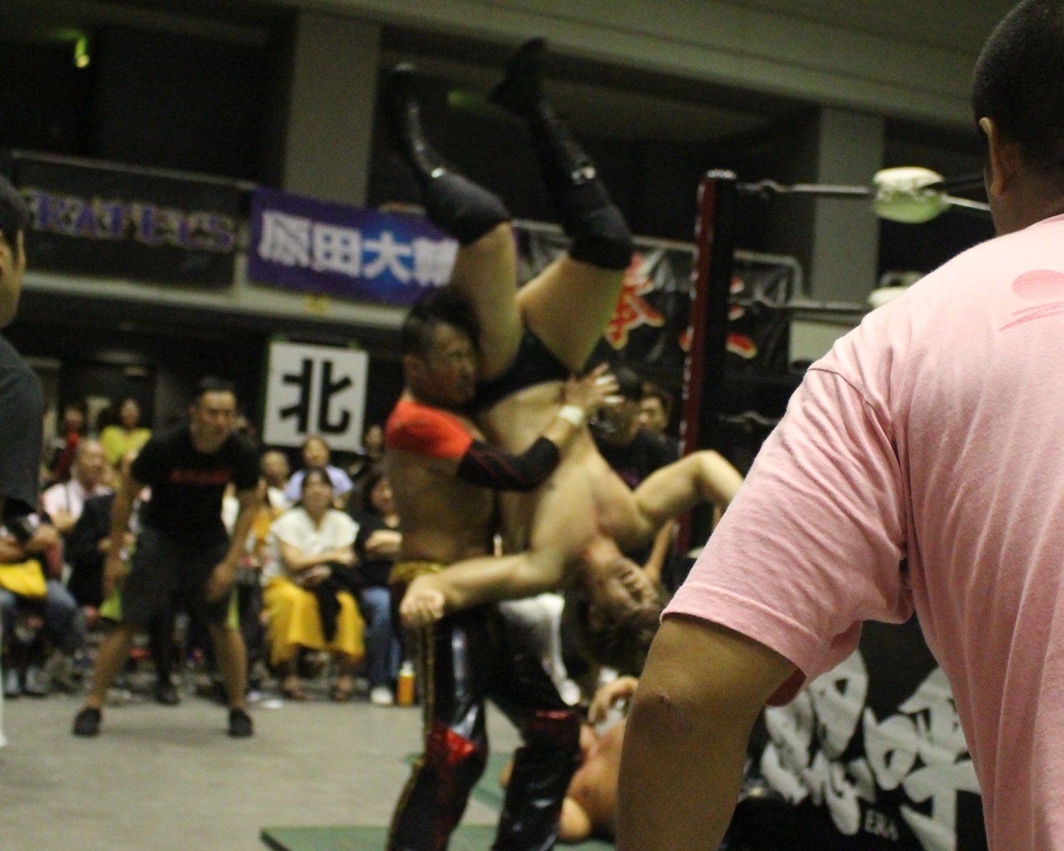 しかし秋山を担ごうとした原田を秋山がパワーボムで叩きつけると、失速した原田をエプロンにセットしてギロチンニーを投下、青木もドロップキック、原だの回転エビ固め狙いを逆エビ固めで切り返すなどして続き、原田を捕らえ、秋山は頭突きからパイルドライバー、串刺しジャンピングニーも、原田がボディーエルボーで反撃してエルボーアタックを浴びせて杉浦に交代する。