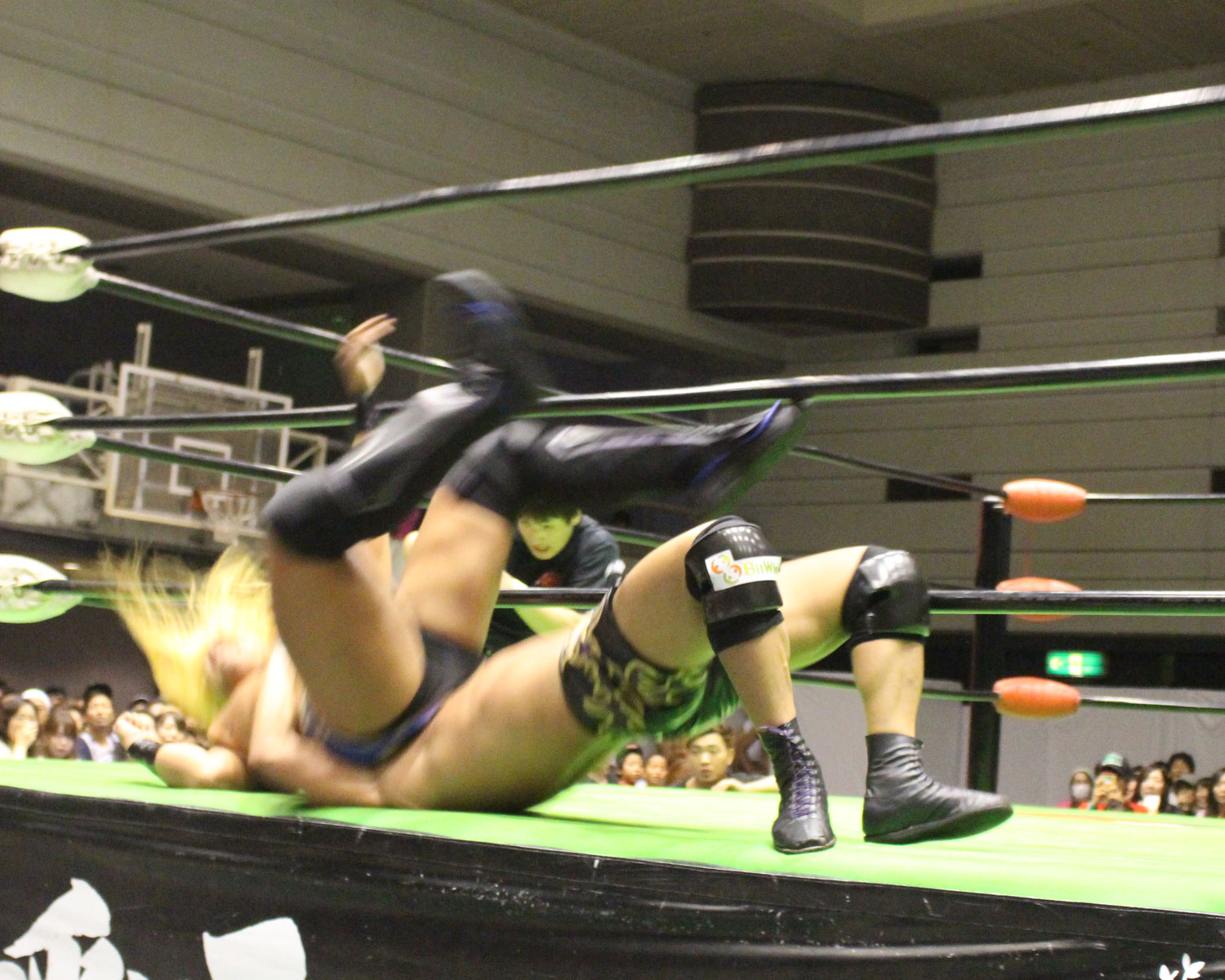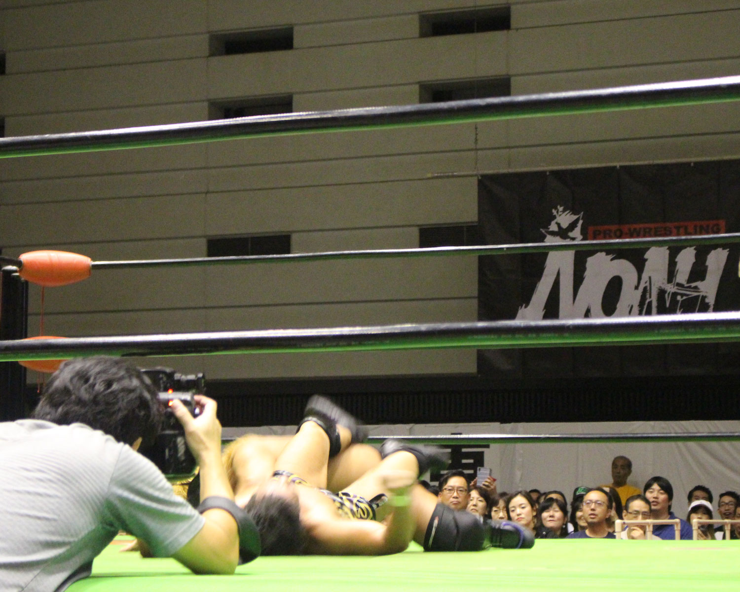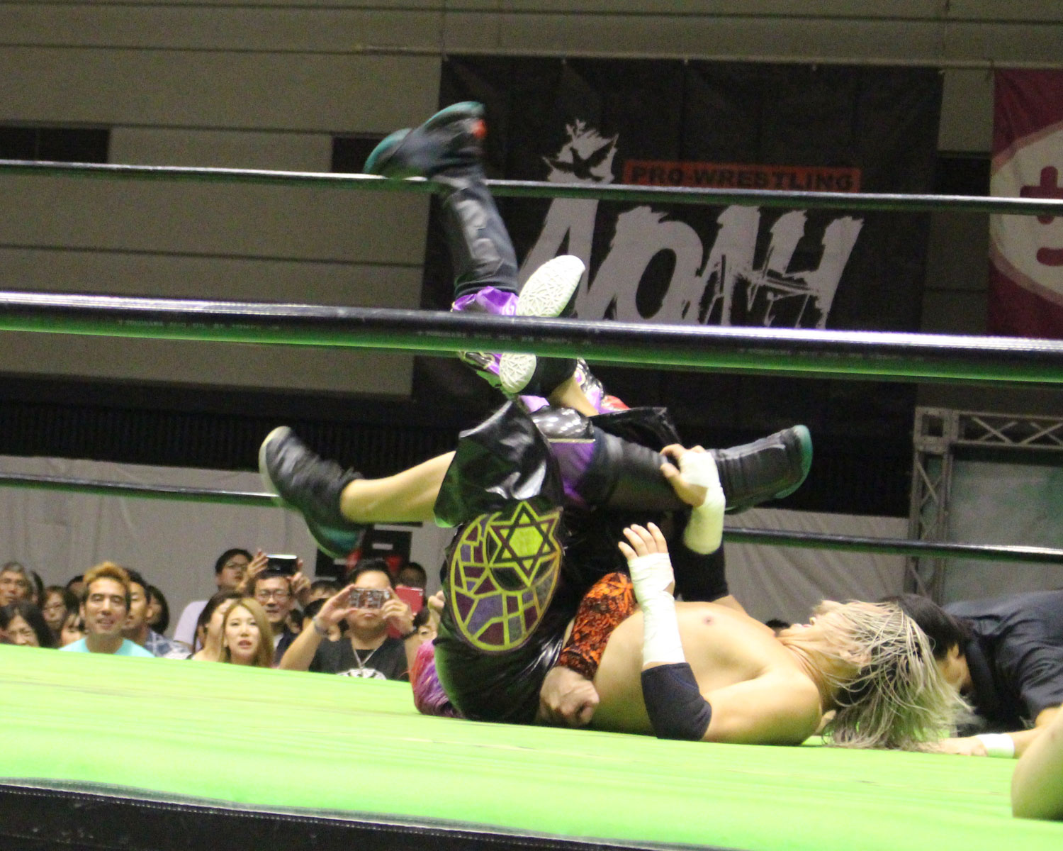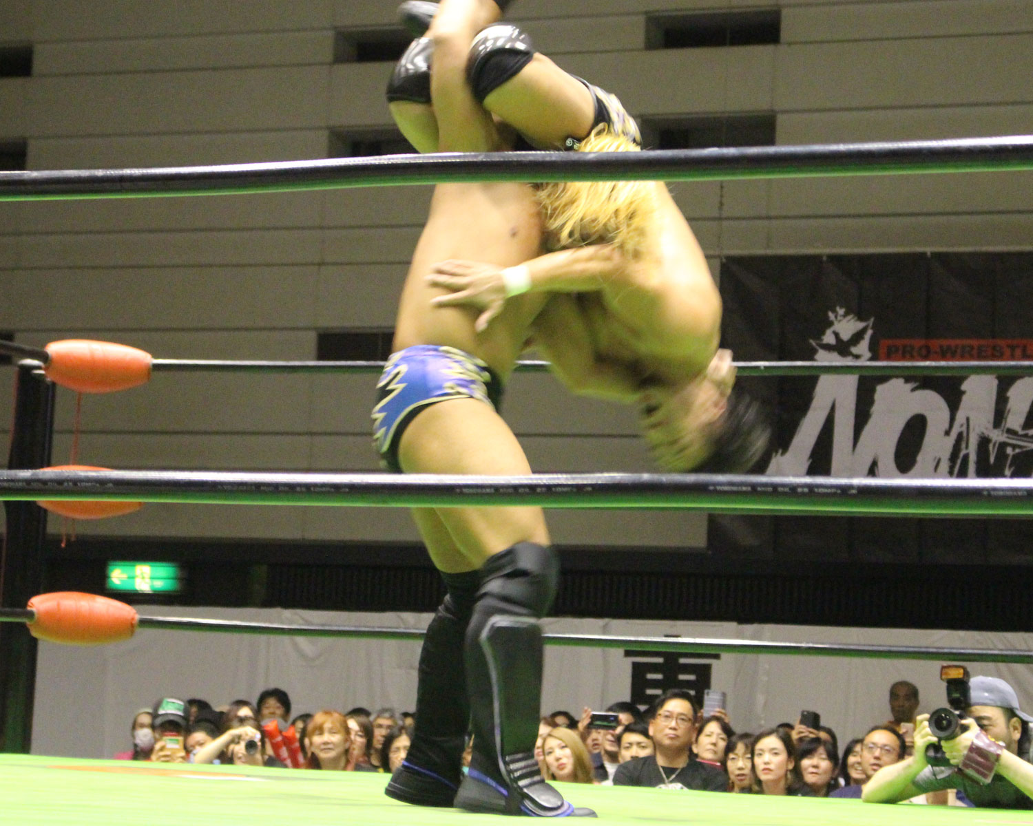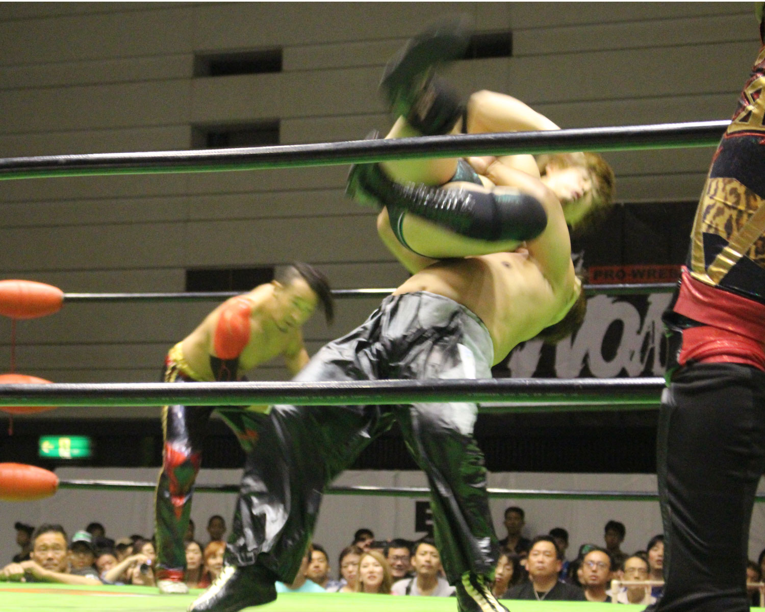 しかし秋山を担ごうとした原田を秋山がパワーボムで叩きつけると、失速した原田をエプロンにセットしてギロチンニーを投下、青木もドロップキック、原だの回転エビ固め狙いを逆エビ固めで切り返すなどして続き、原田を捕らえ、秋山は頭突きからパイルドライバー、串刺しジャンピングニーも、原田がボディーエルボーで反撃してエルボーアタックを浴びせて杉浦に交代する。