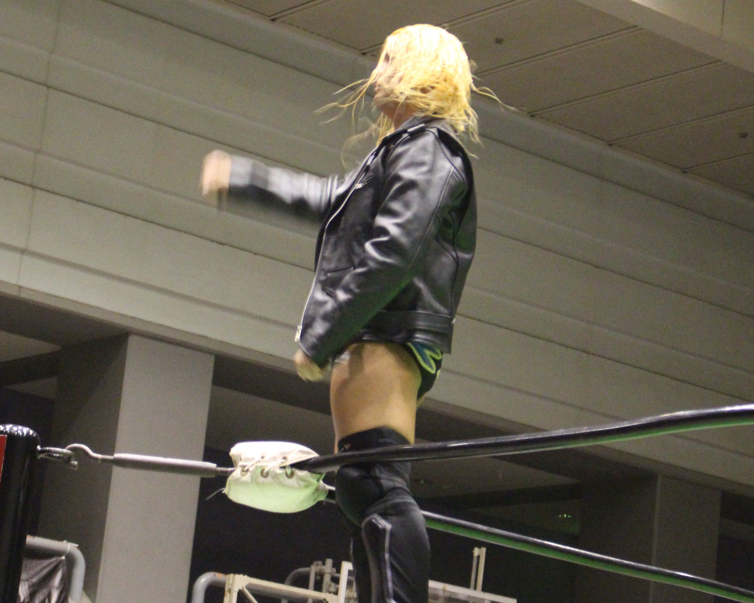 ロープに逃れた丸藤にイタミが蹴り上げてからライガーボム、ソバット、ミドルキックの、左右のバスソーキックの乱打、そしてgo2sleepが顔面に直撃も、丸藤はカウント2でキックアウト、そして生膝go2sleepを狙うが、丸藤が虎王の連打、見えない角度からのトラースキック、虎王、見えない角度からのトラースキックと一気に畳みかける。