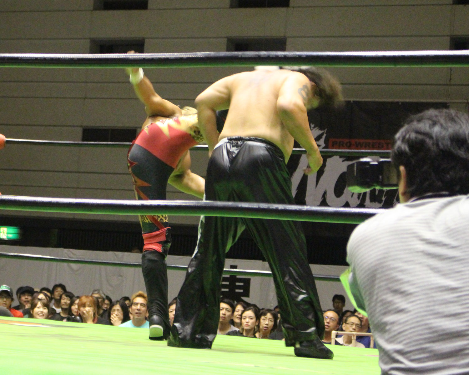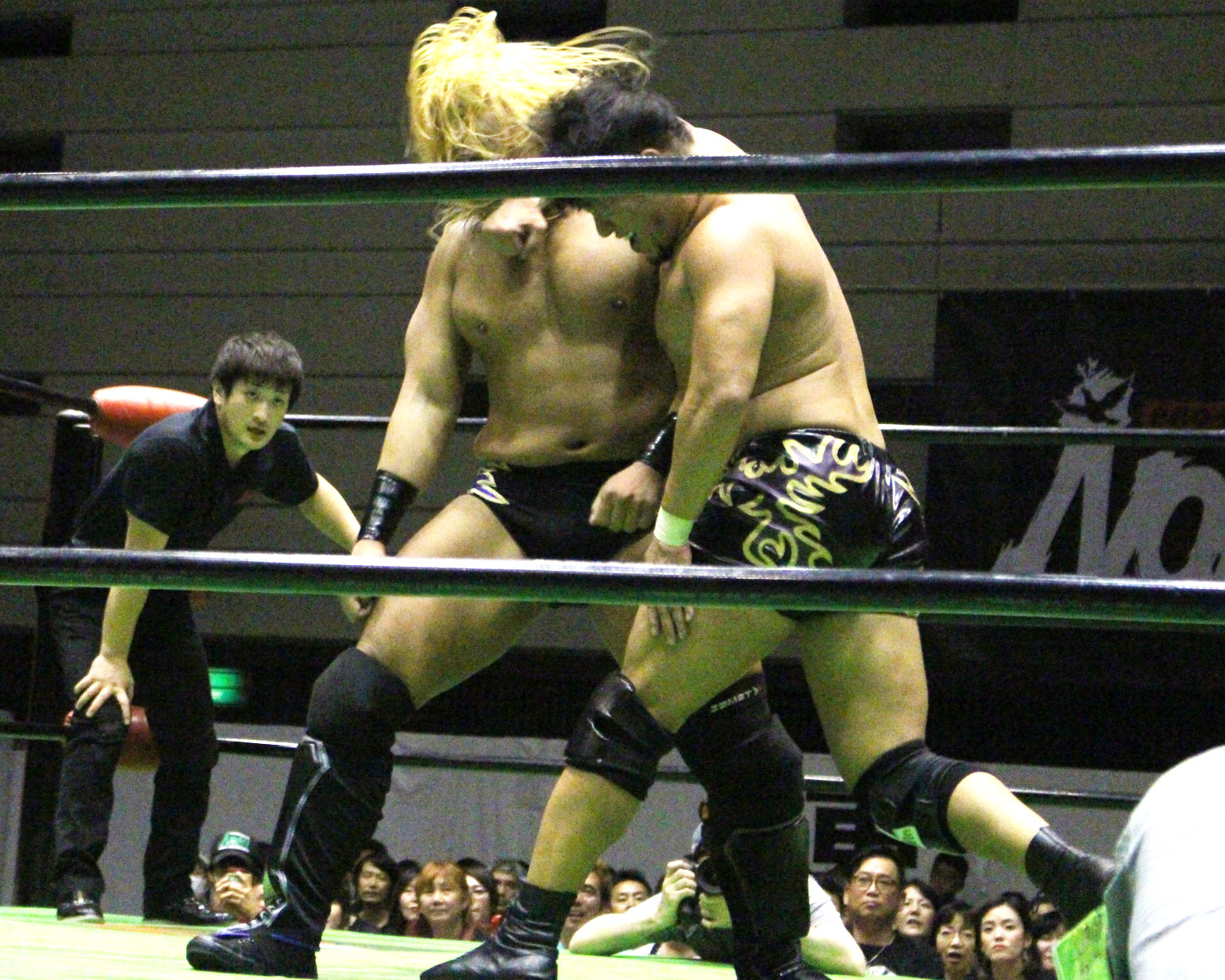 丸藤は不知火狙うが、イタミがコーナーに逆さ吊りにしての低空ドロップキックも、丸藤がかわすとエプロンにイタミを連行して鉄柵の角めがけてパイルドライバーを敢行、丸藤らしさがやっと出るが、場外戦でイタミはショルダーの連打で鉄柵外へ出すと。コーナーからダイビングフットスタンプを狙うと、丸藤が追いかけて、下からのトラースキックから不知火・改を決め、イタミのビックブーツもトルネードキックで応戦する。