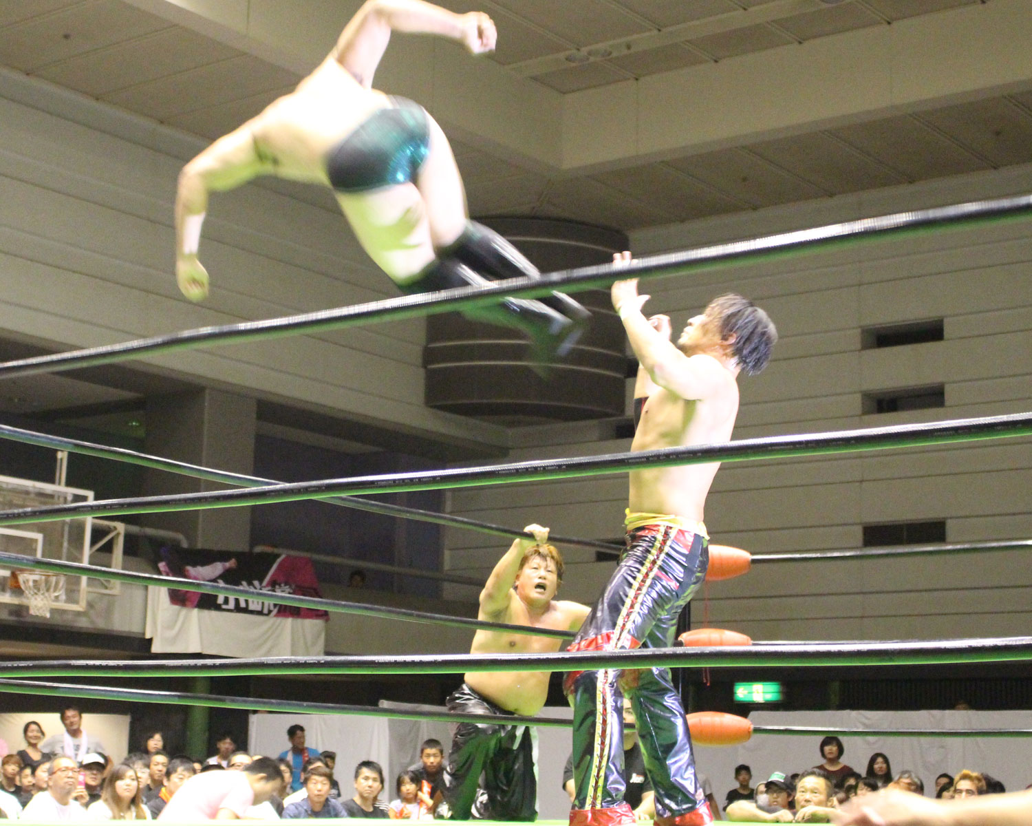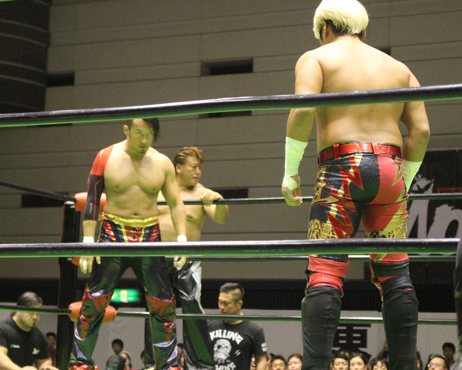 交代した原田は青木にエルボー合戦からスロイダー、ノーザンライトスープレックスホールドと畳みかけるが、ニーアッパー狙いは青木が逃れると逆エビ固めで切り返し、ここで秋山が入ってトレイン攻撃、秋山のバックドロップから青木がフロッグスプラッシュと連係で原田を捕らえ、パイルドライバーからアサルトポイント狙いは、原田がサムソンクラッチで切り返し、コーナーへスロイダー、そして杉浦の援護からダイビングエルボードロップを投下する。
