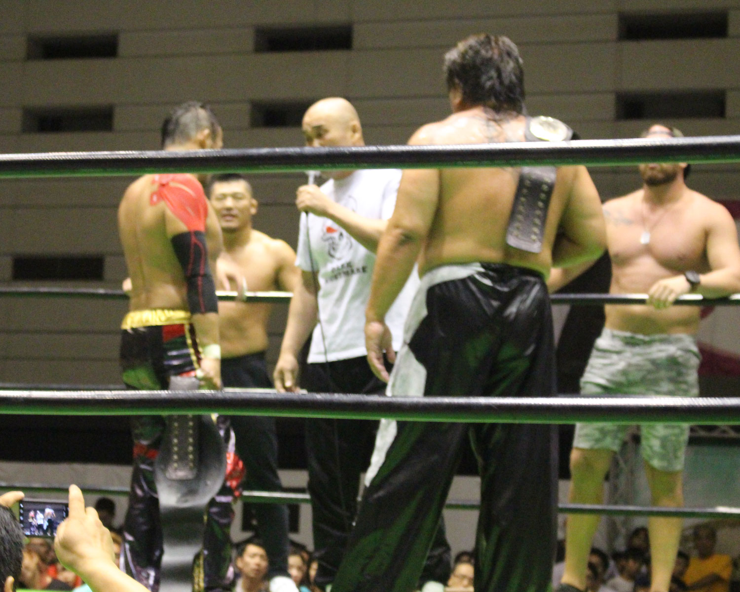 丸藤「大阪の皆さん、今日はありがとう! あのタコ坊主の髪の毛が肩まで伸びたら挑戦を受けよう。それまで楽しみにしててくれ。今日はありがとう」