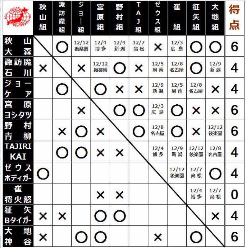 [4勝1敗=8点]秋山準 ○大森隆男(11分1秒 片エビ固め)[3敗=0点]崔領二 X将火怒