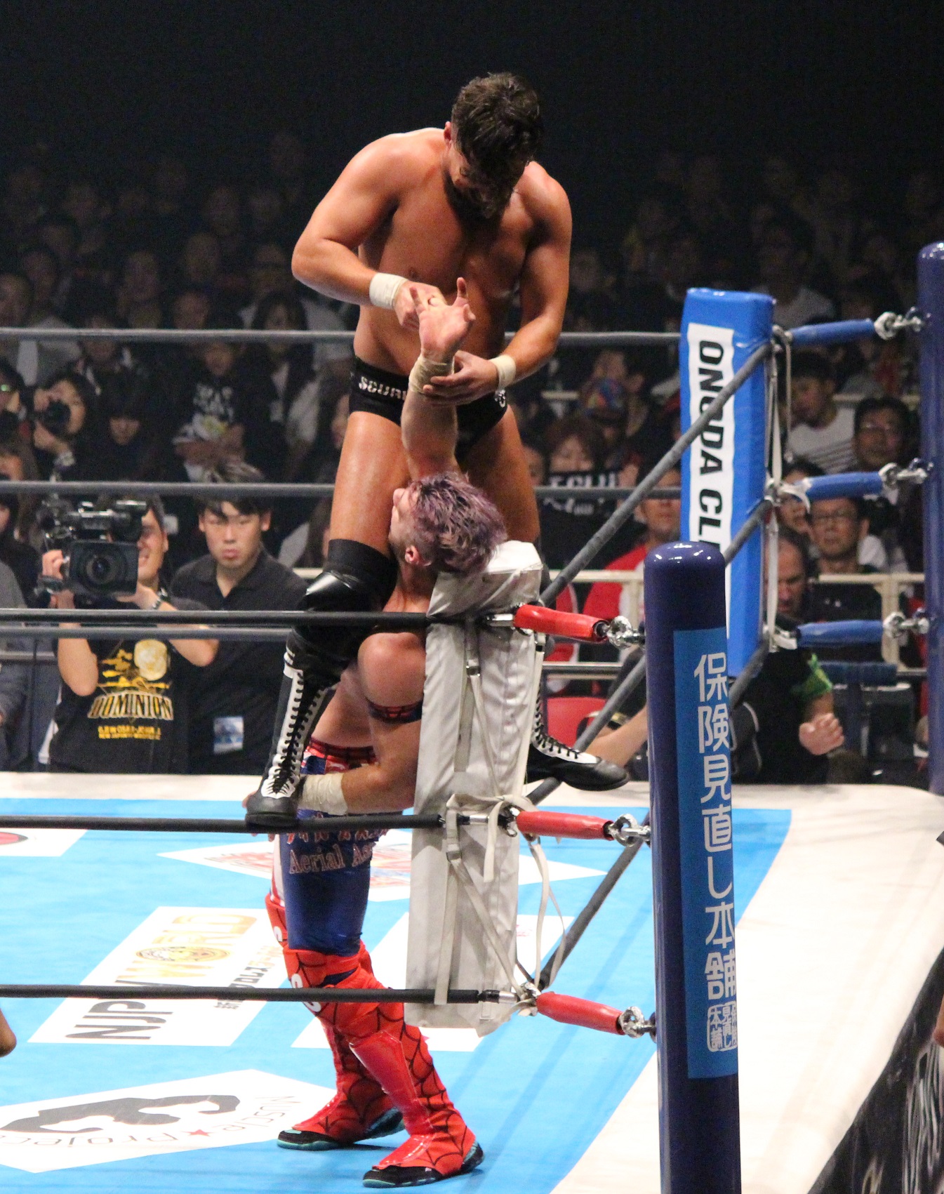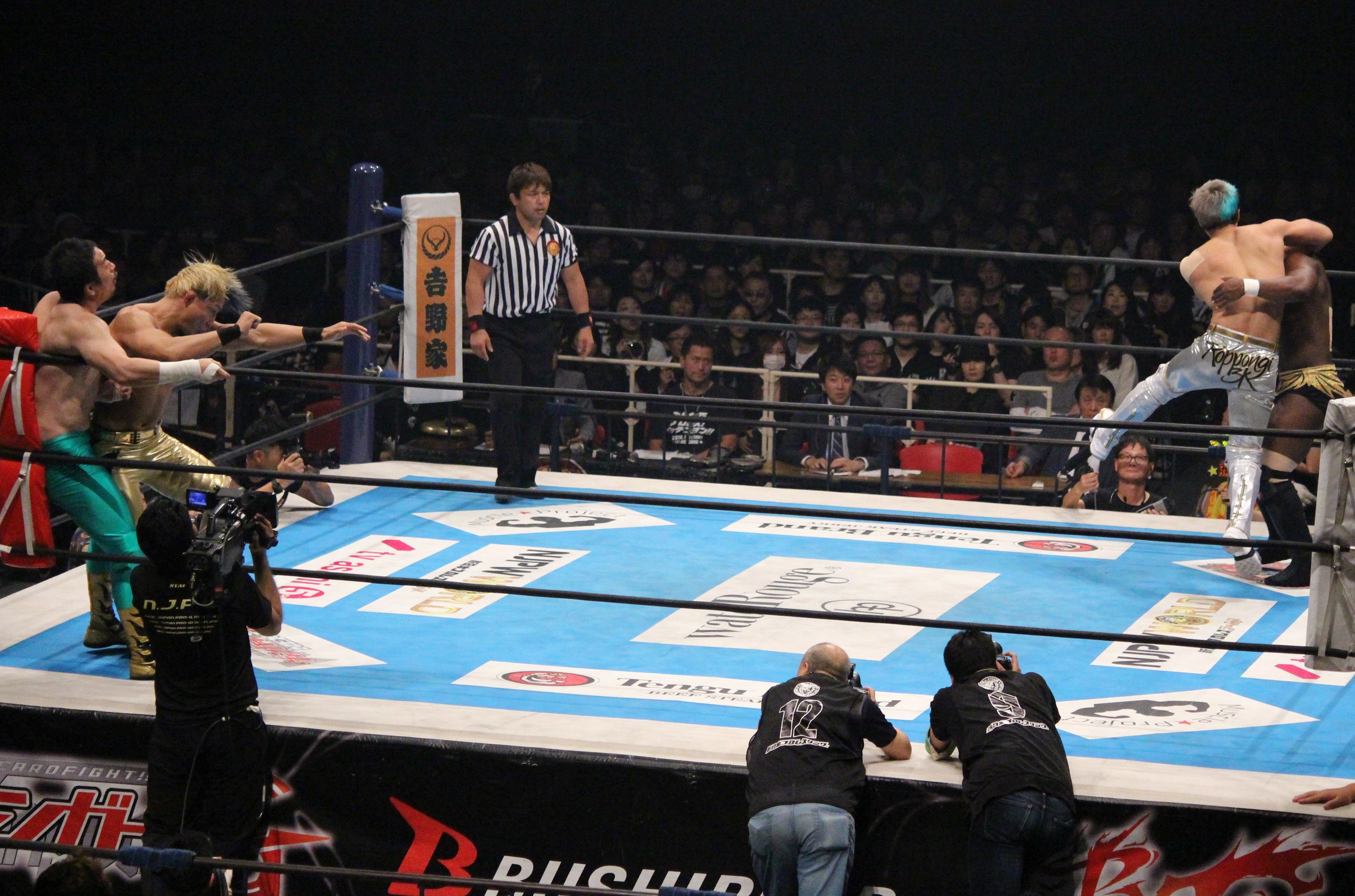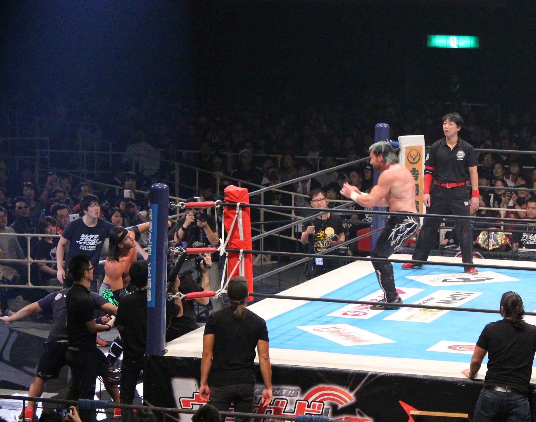 ここで勝負と見た高梨は坂口のキックの援護を受けて丸藤にタカタニックを狙うが、HARASHIMAがカットに入り、阻止した丸藤は追尾式アックスボンバーからHARASHIMAがダイビングボディープレス、HARASHIMAのファルコンアローから丸藤がトラースキックと連係攻撃、HARASHIMAも坂口にリバースフランケンを決めて排除を狙ったが、起き上がった坂口がジャンピングニーでHARASHIMAを排除する。